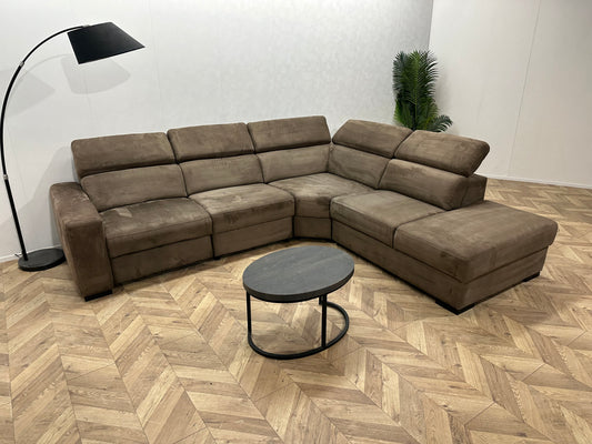 Bruine Suède Stoffen Hoekbank ~ Relaxfunctie ~ Verstelbare Hoofdsteunen