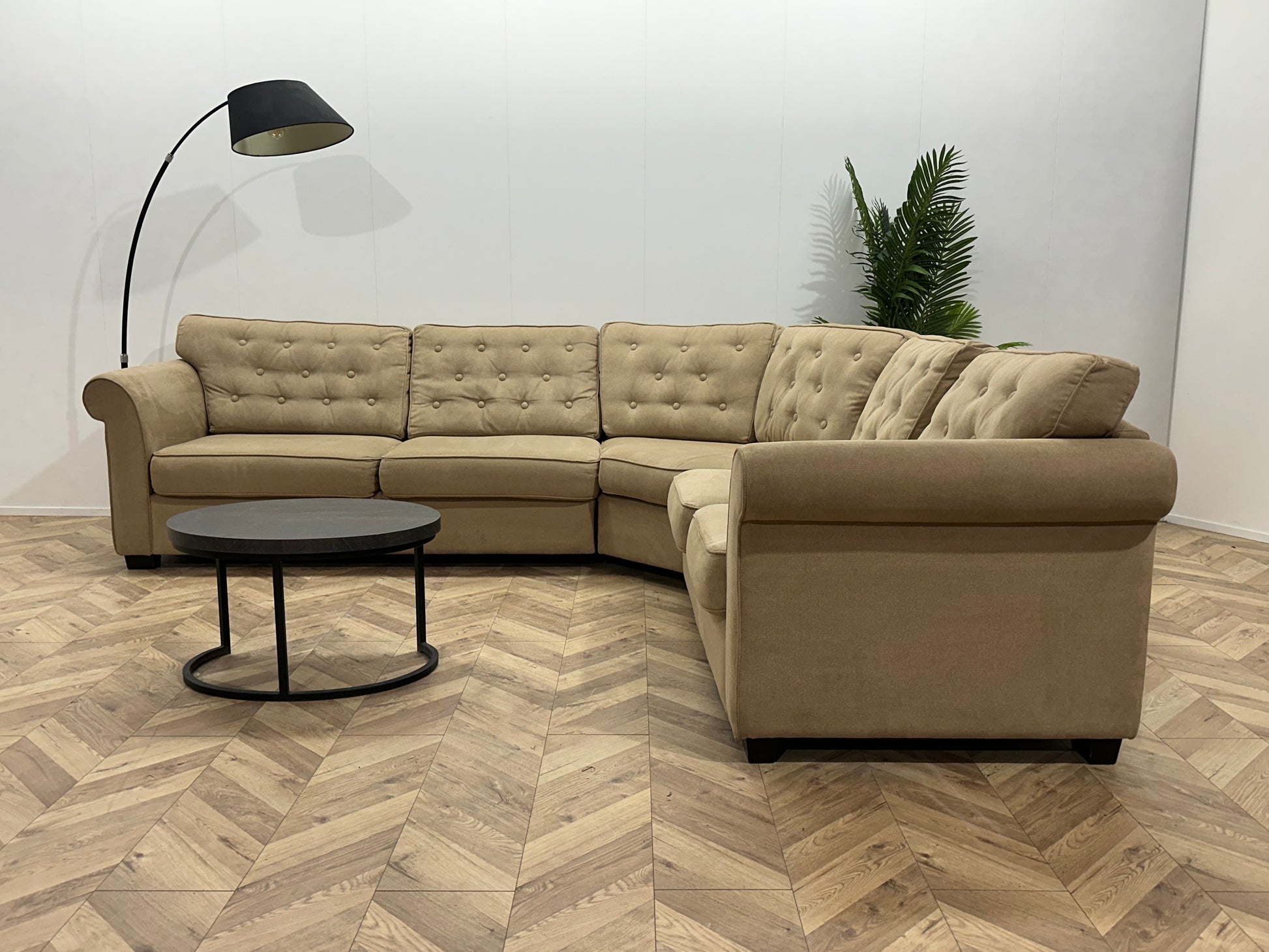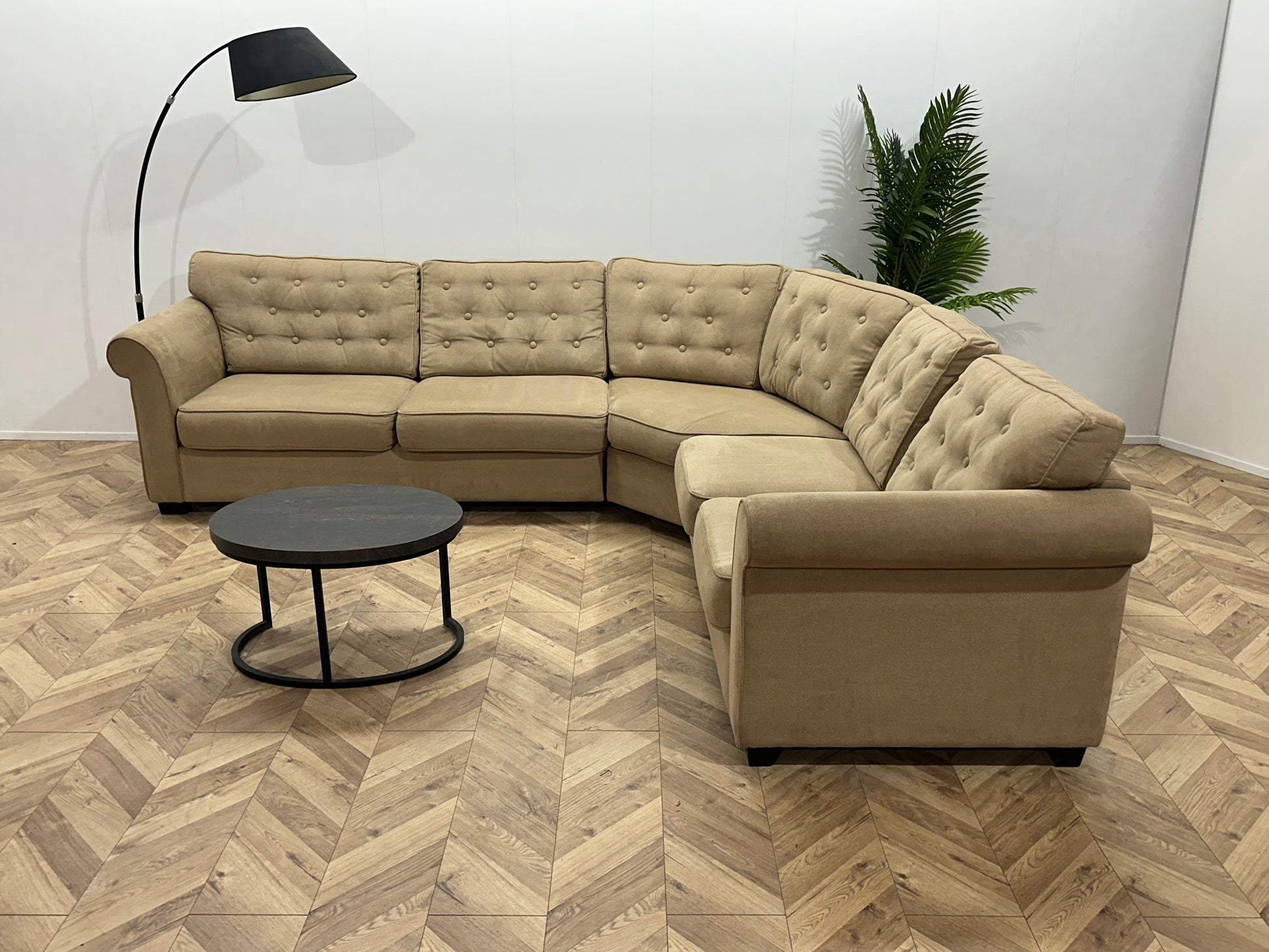 Beige Suède Stoffen Hoekbank ~ Losse Rugkussens Met Afneembare Hoezen