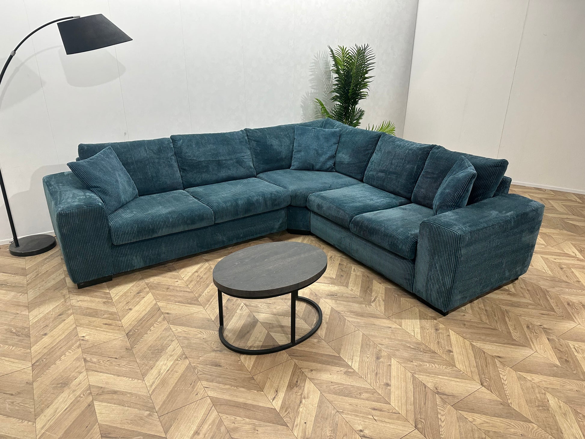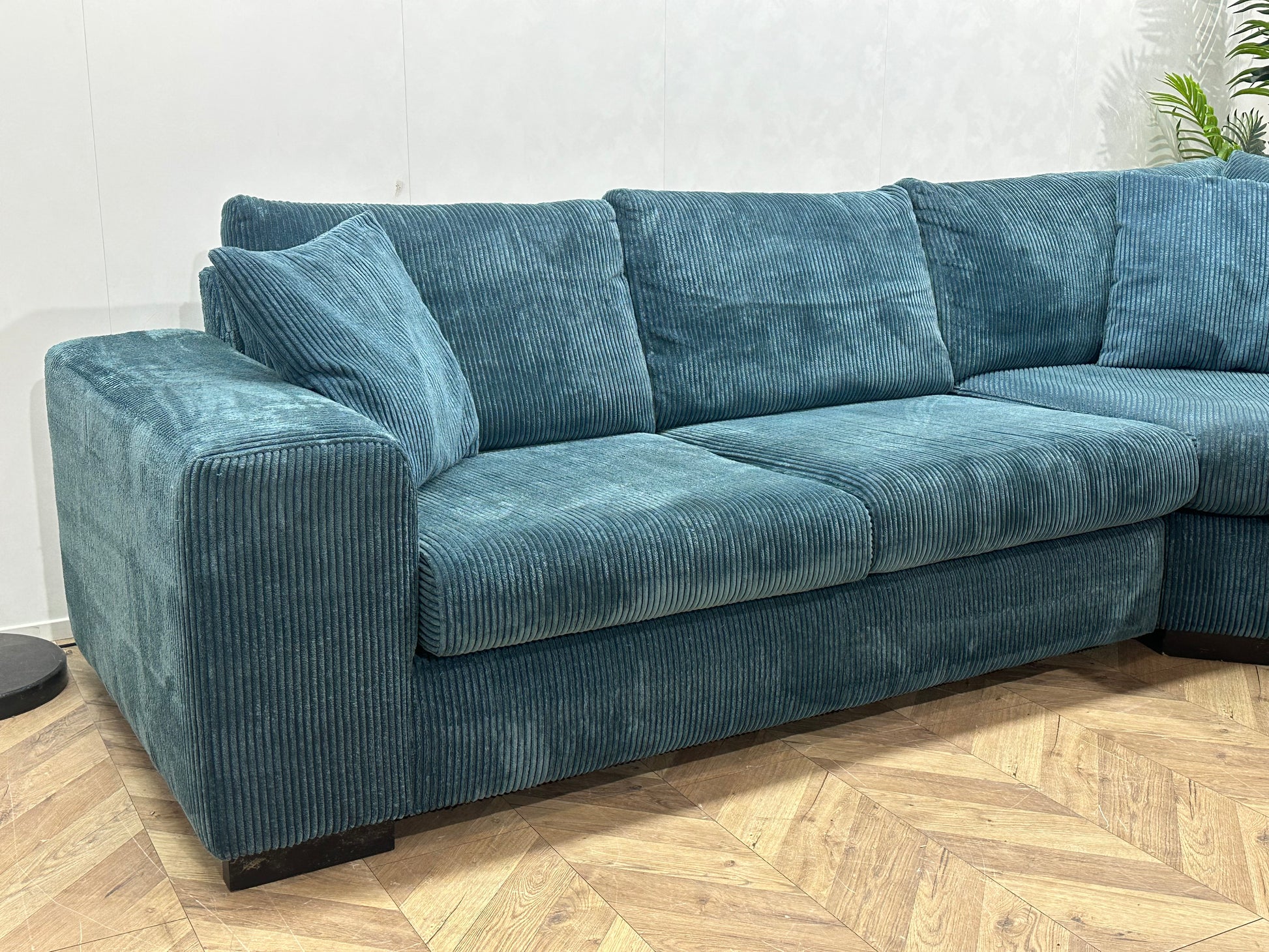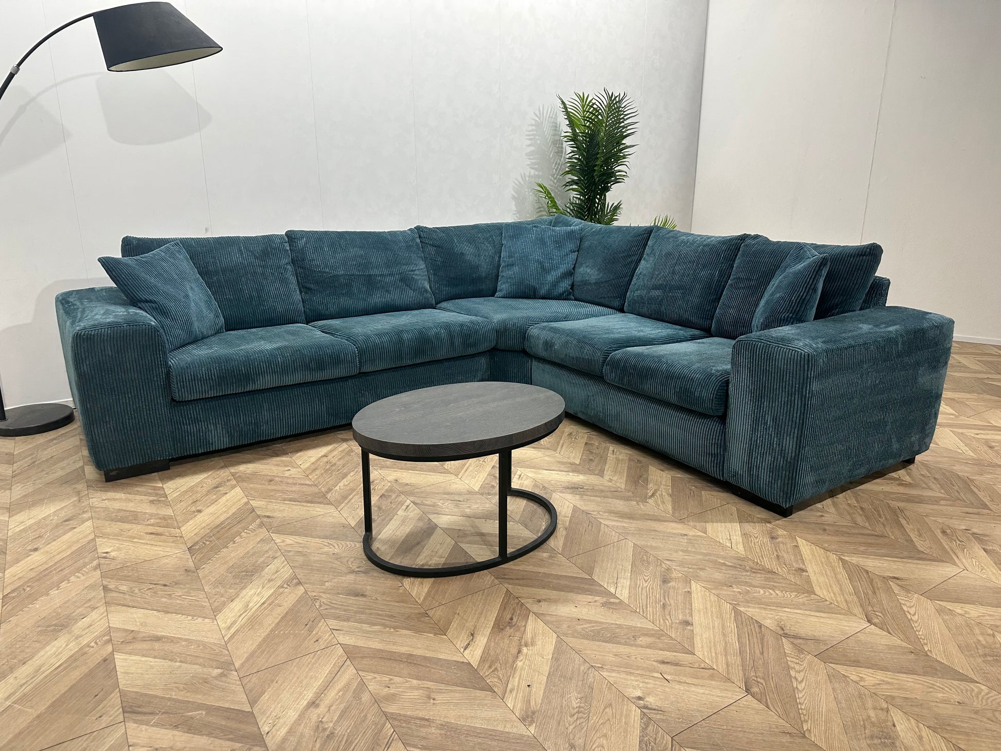 Blauwe Ribstof Hoekbank ~ Losse Kussens Met Afneembare Hoezen
