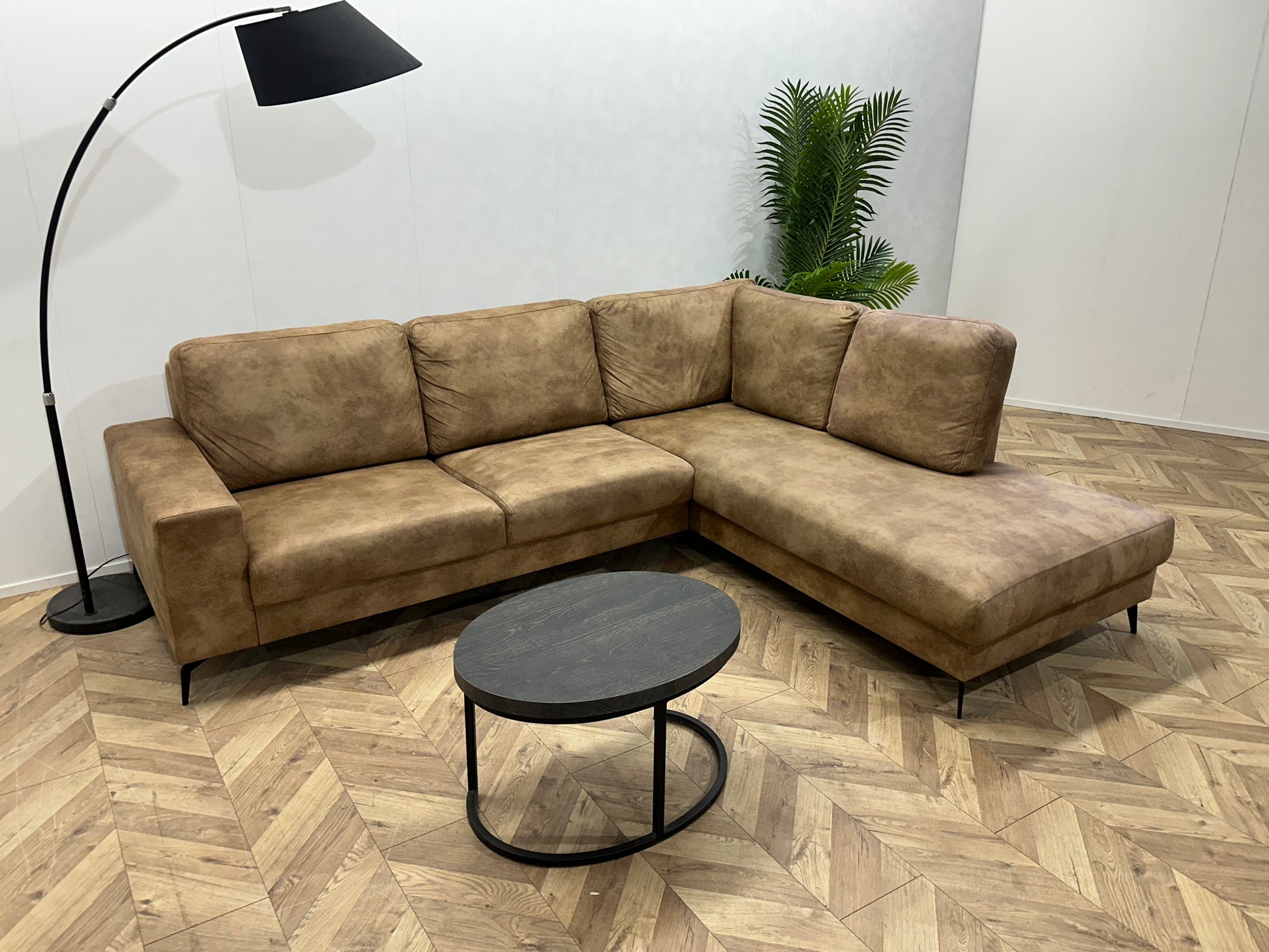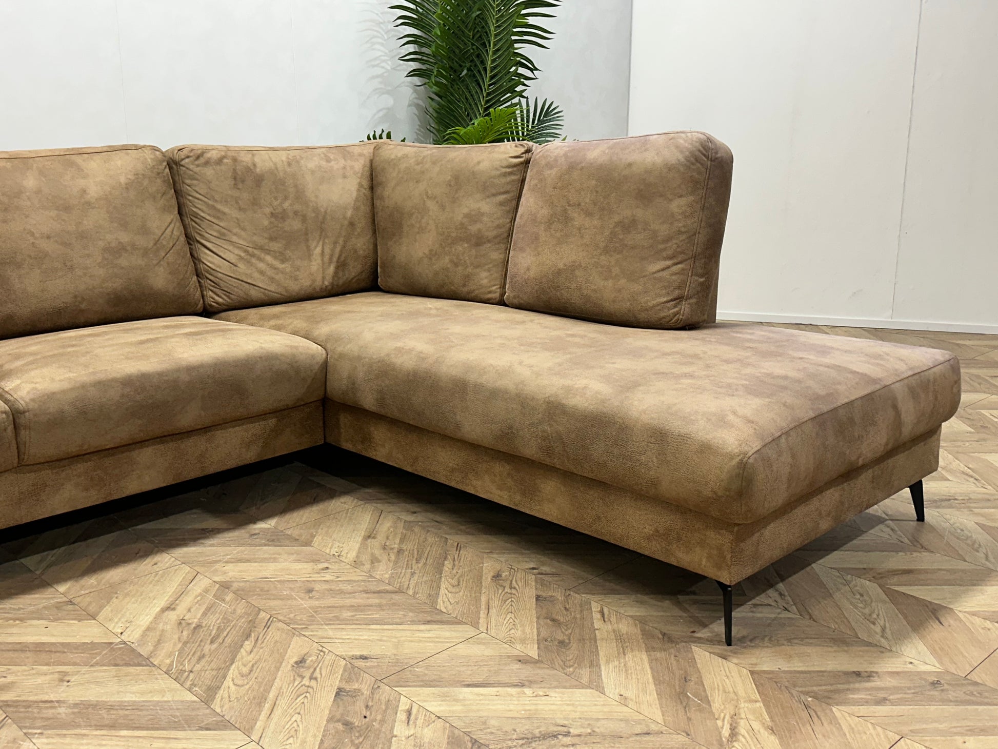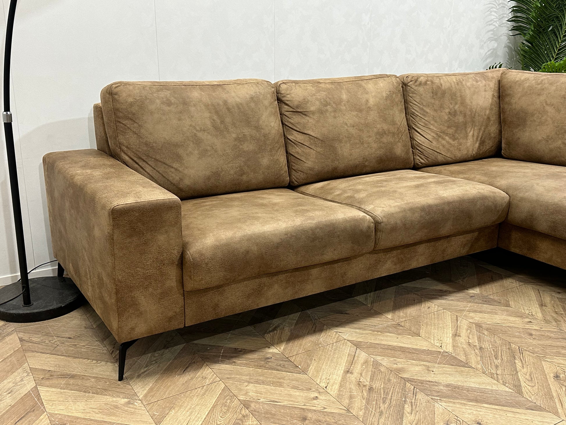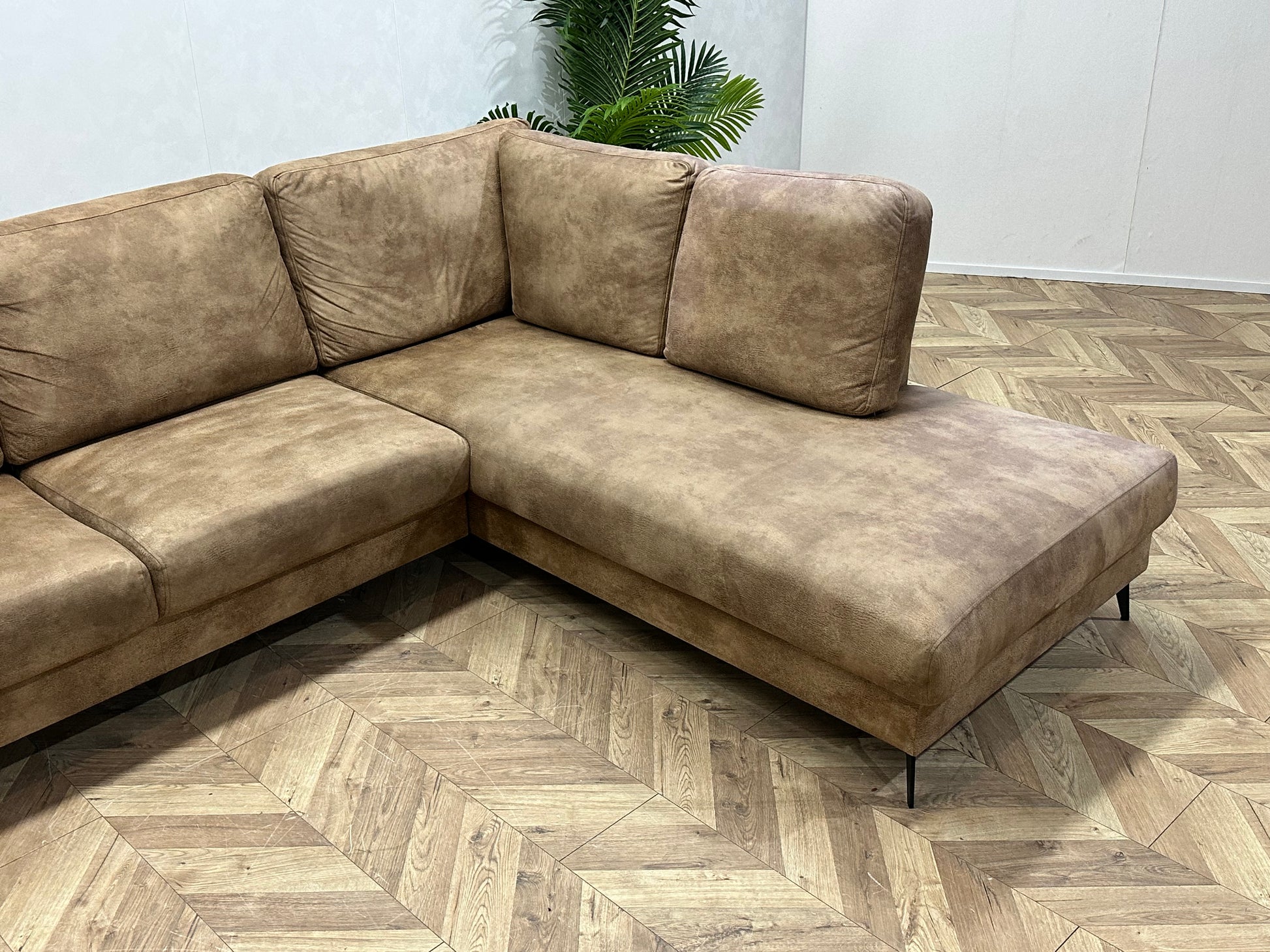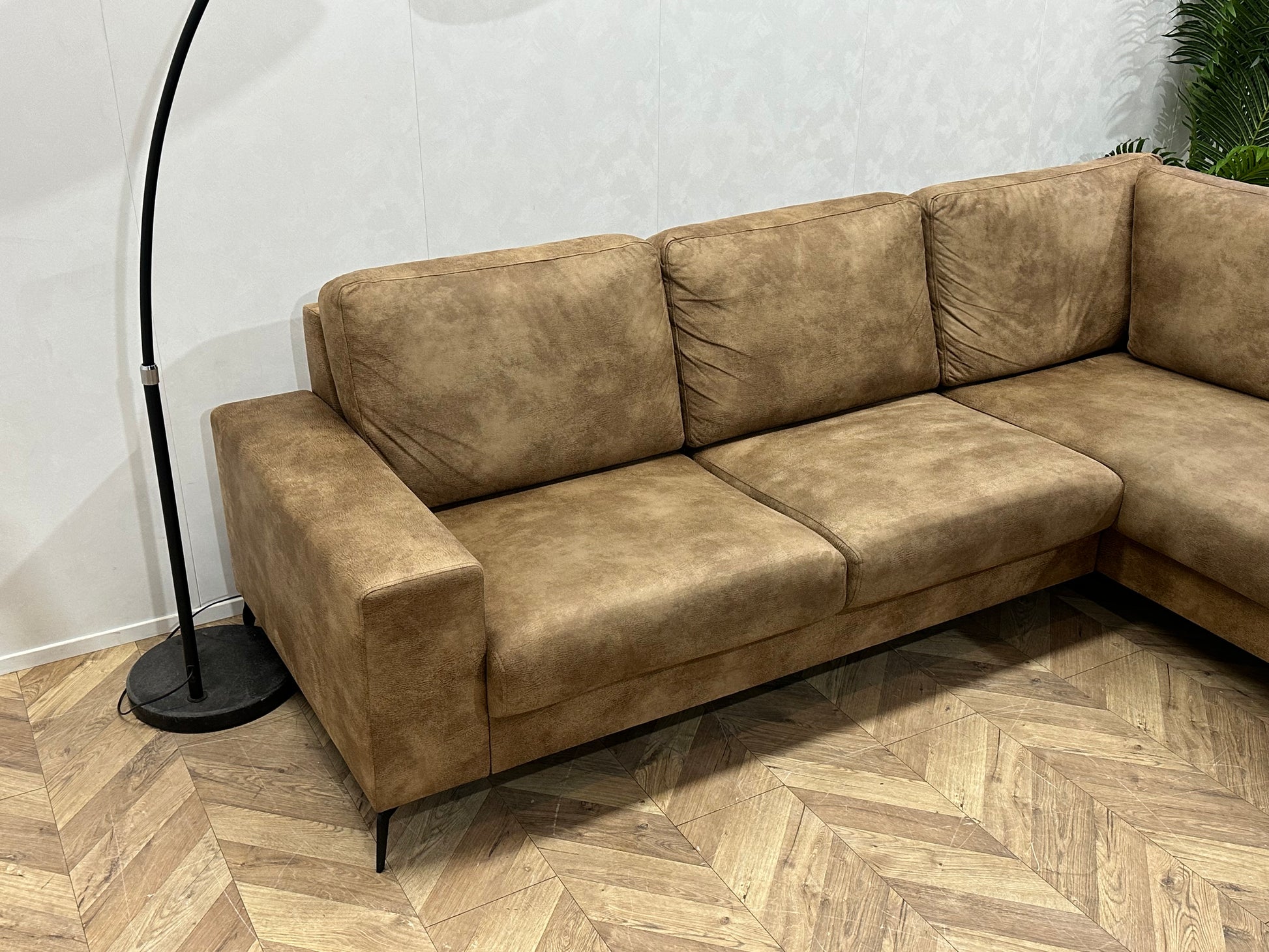Bruine Suède Lederen Hoekbank ~ Losse Rugkussens Met Afneembare Hoezen