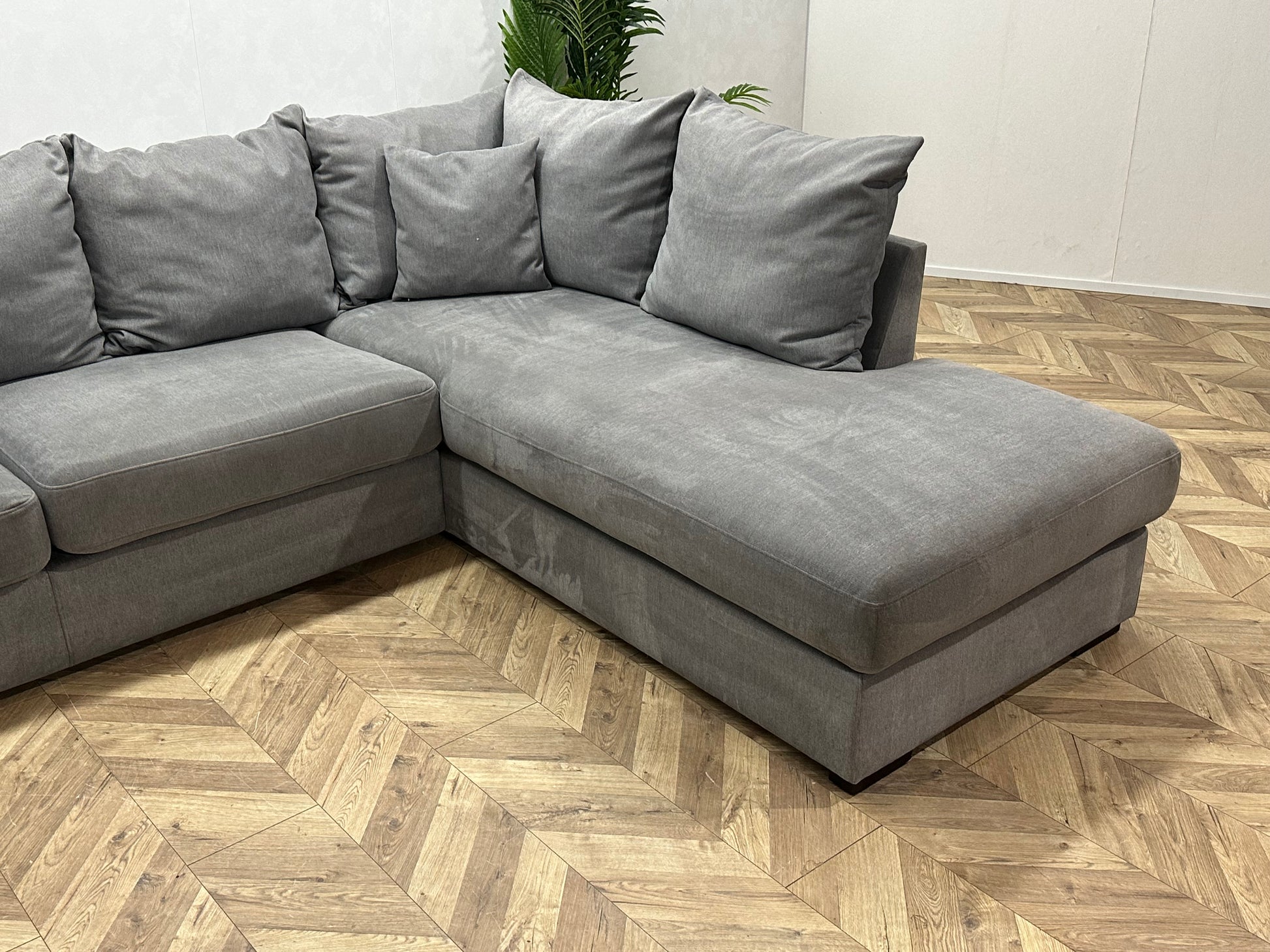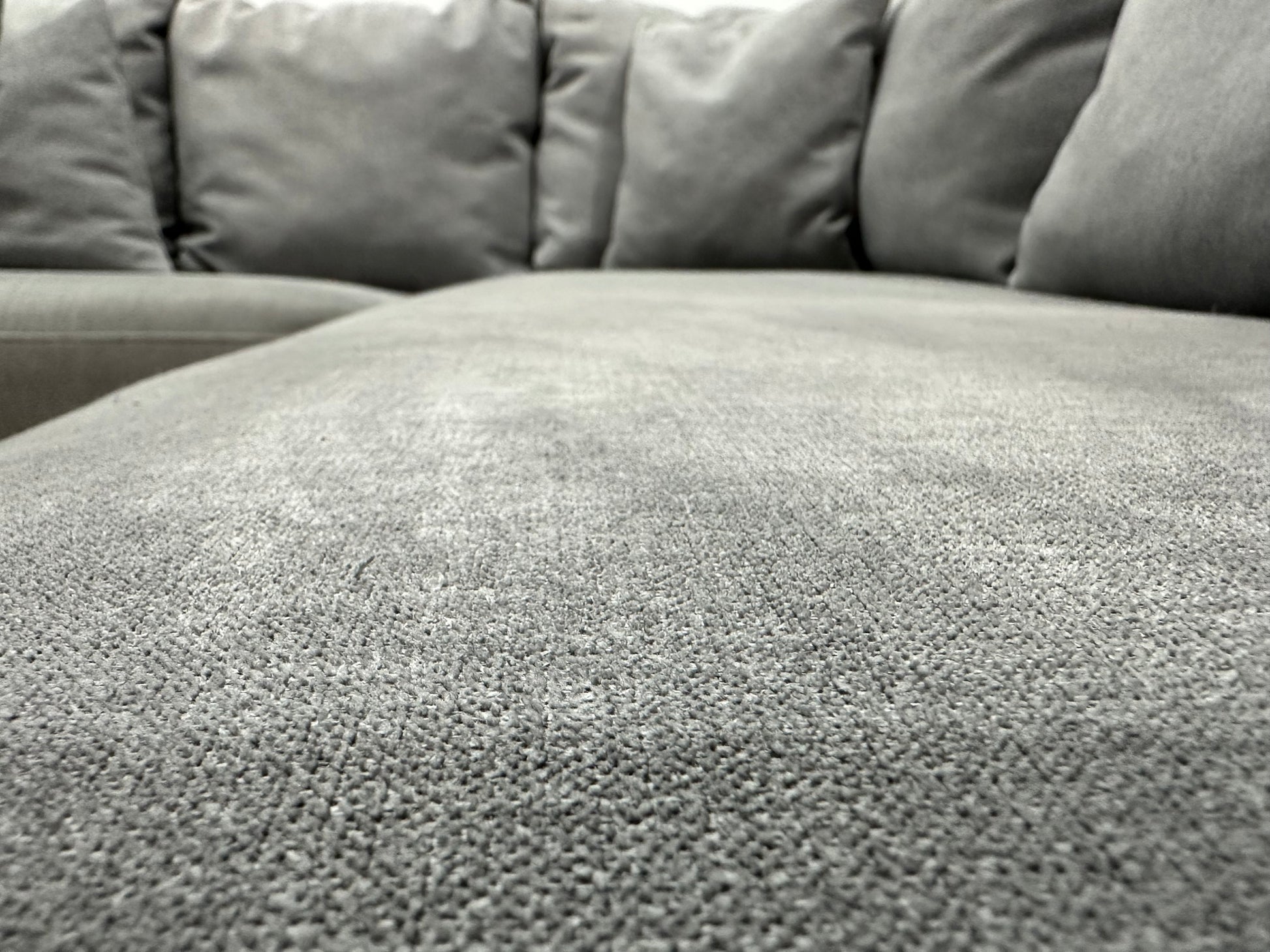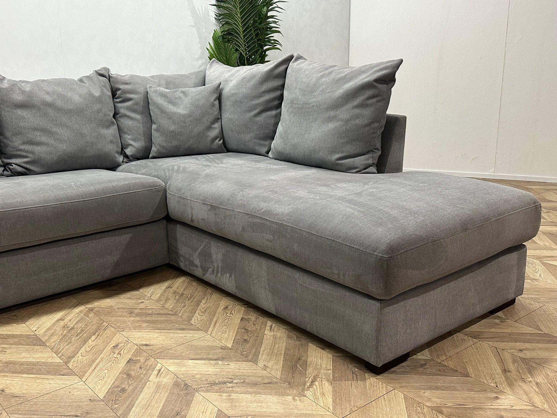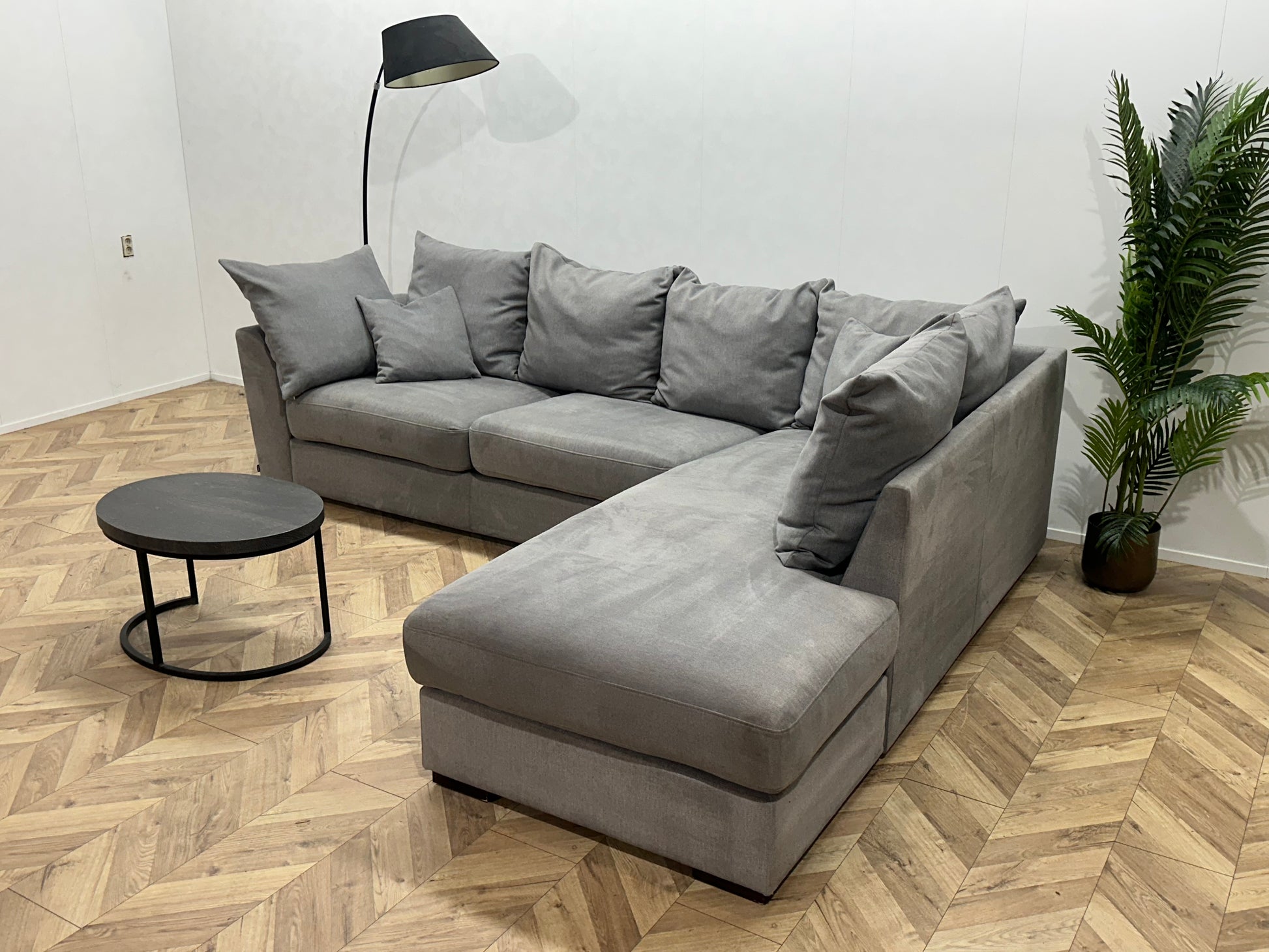 Burhéns Grijze Suède Stoffen Hoekbank ~ Losse Kussens Met Afneembare Hoezen