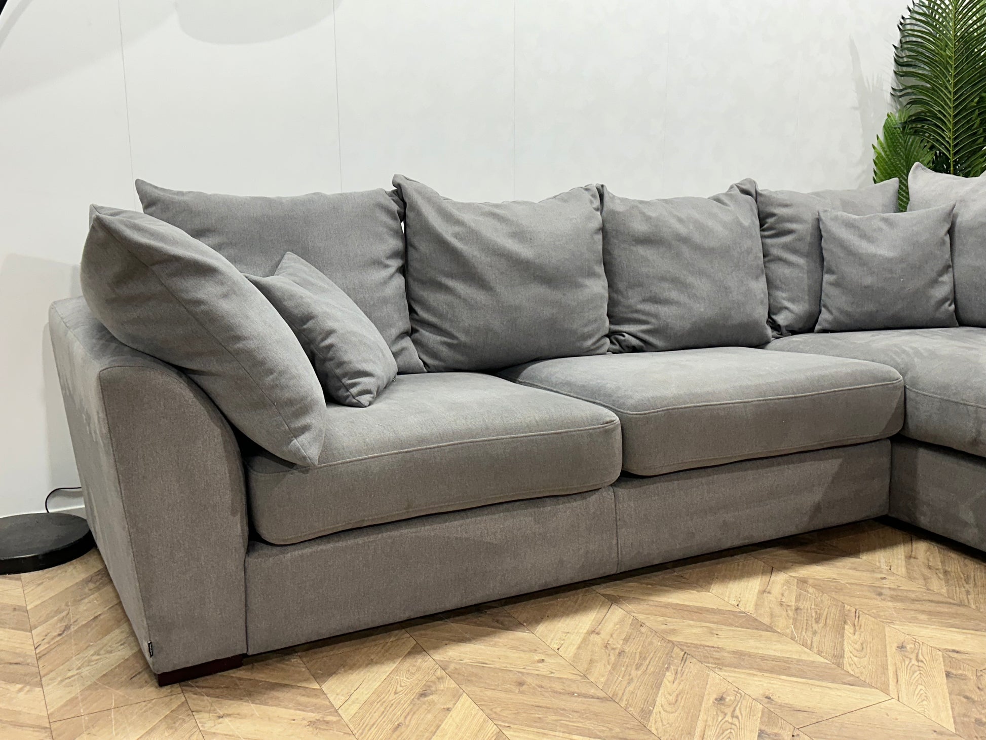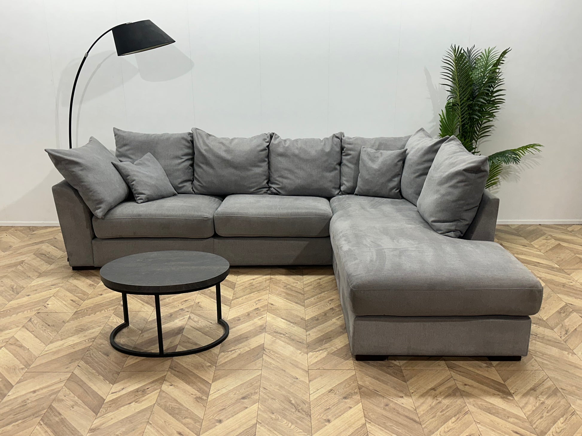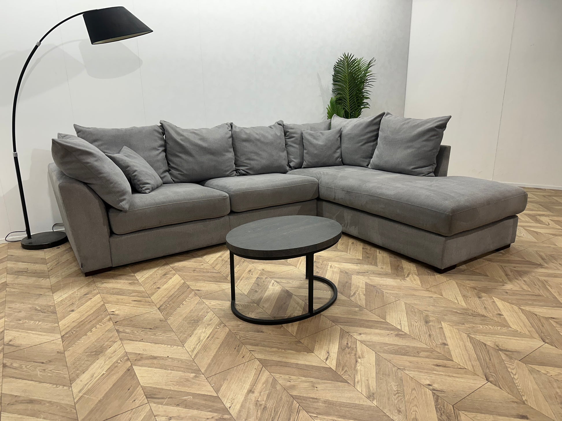 Burhéns Grijze Suède Stoffen Hoekbank ~ Losse Kussens Met Afneembare Hoezen