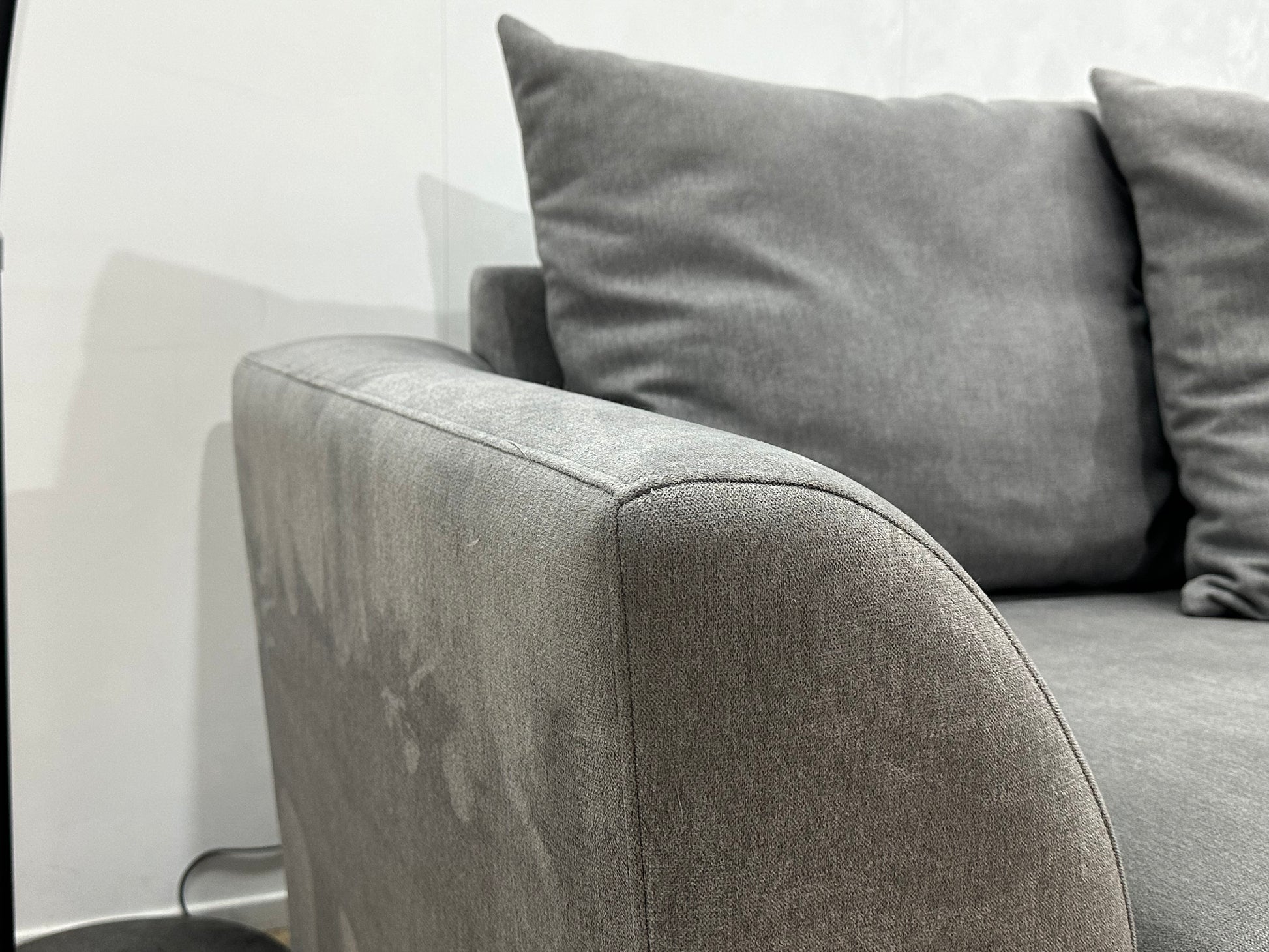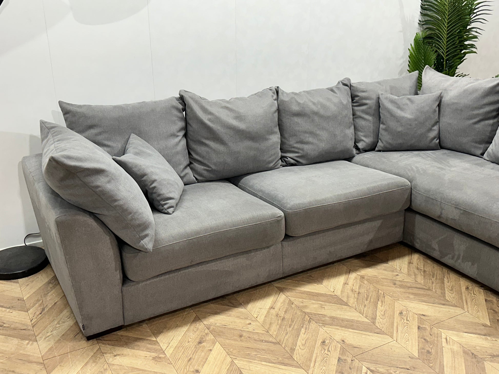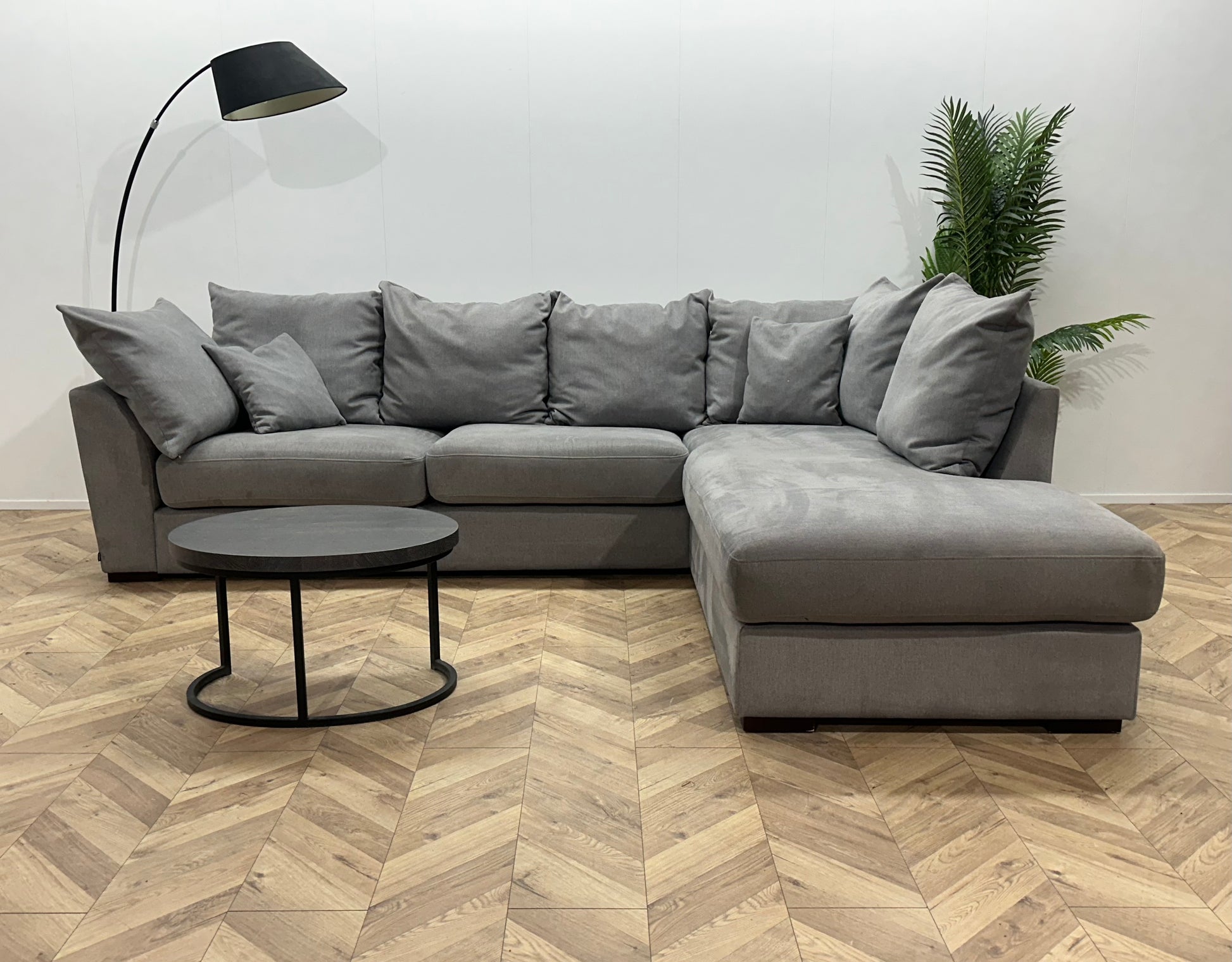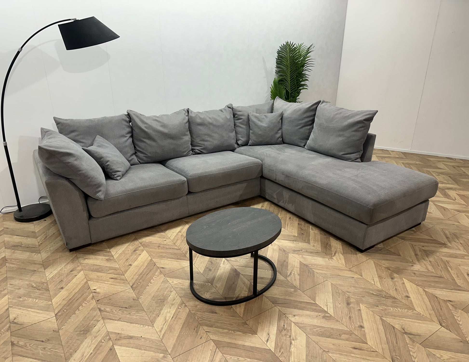 Burhéns Grijze Suède Stoffen Hoekbank ~ Losse Kussens Met Afneembare Hoezen