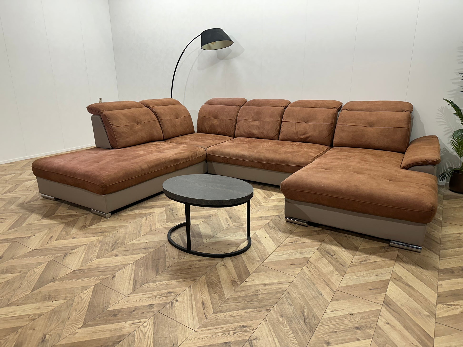 Cognac Bruine/Grijze Suède Stoffen/Lederen U Bank ~ Opbergruimte ~ Verstelbare Rug/Hoofdsteunen