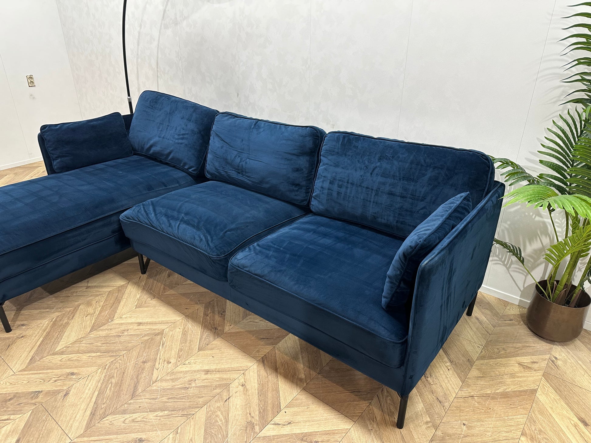 Donker Blauwe Velvet Hoekbank ~ Losse Rugkussens Met Afneembare Hoezen