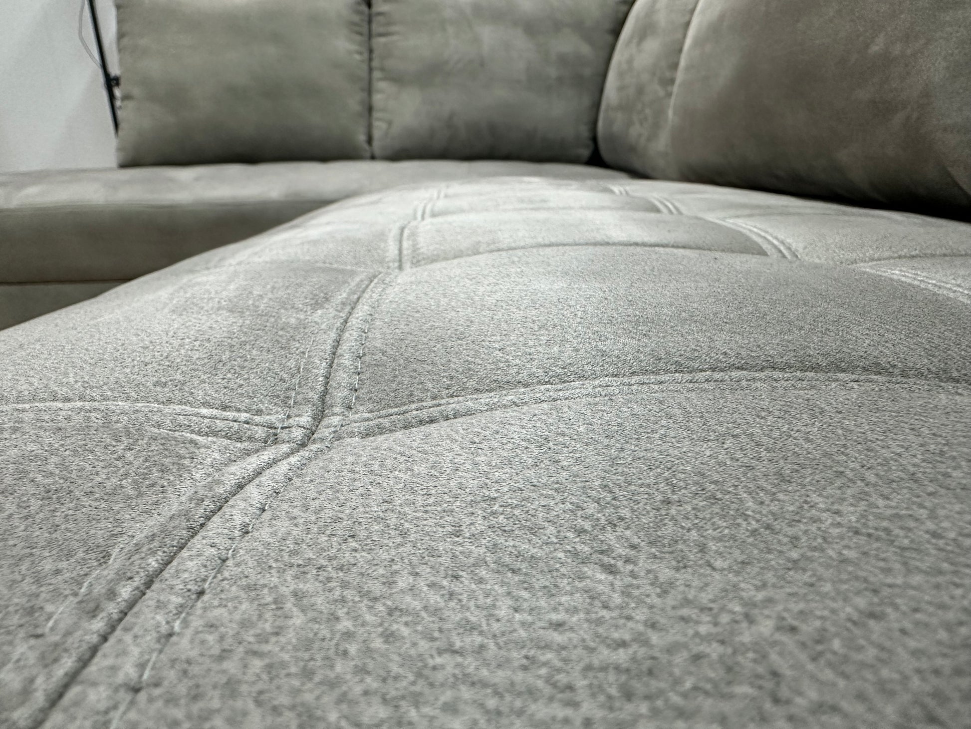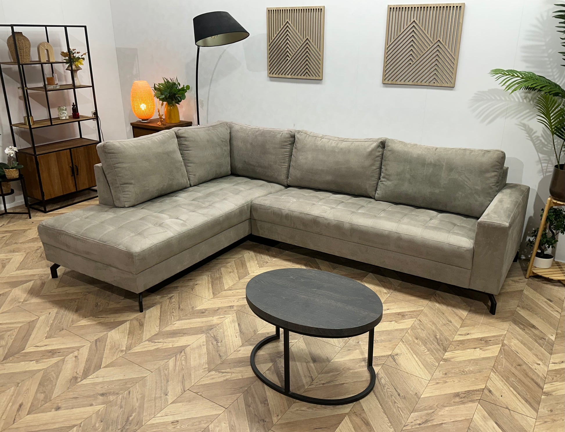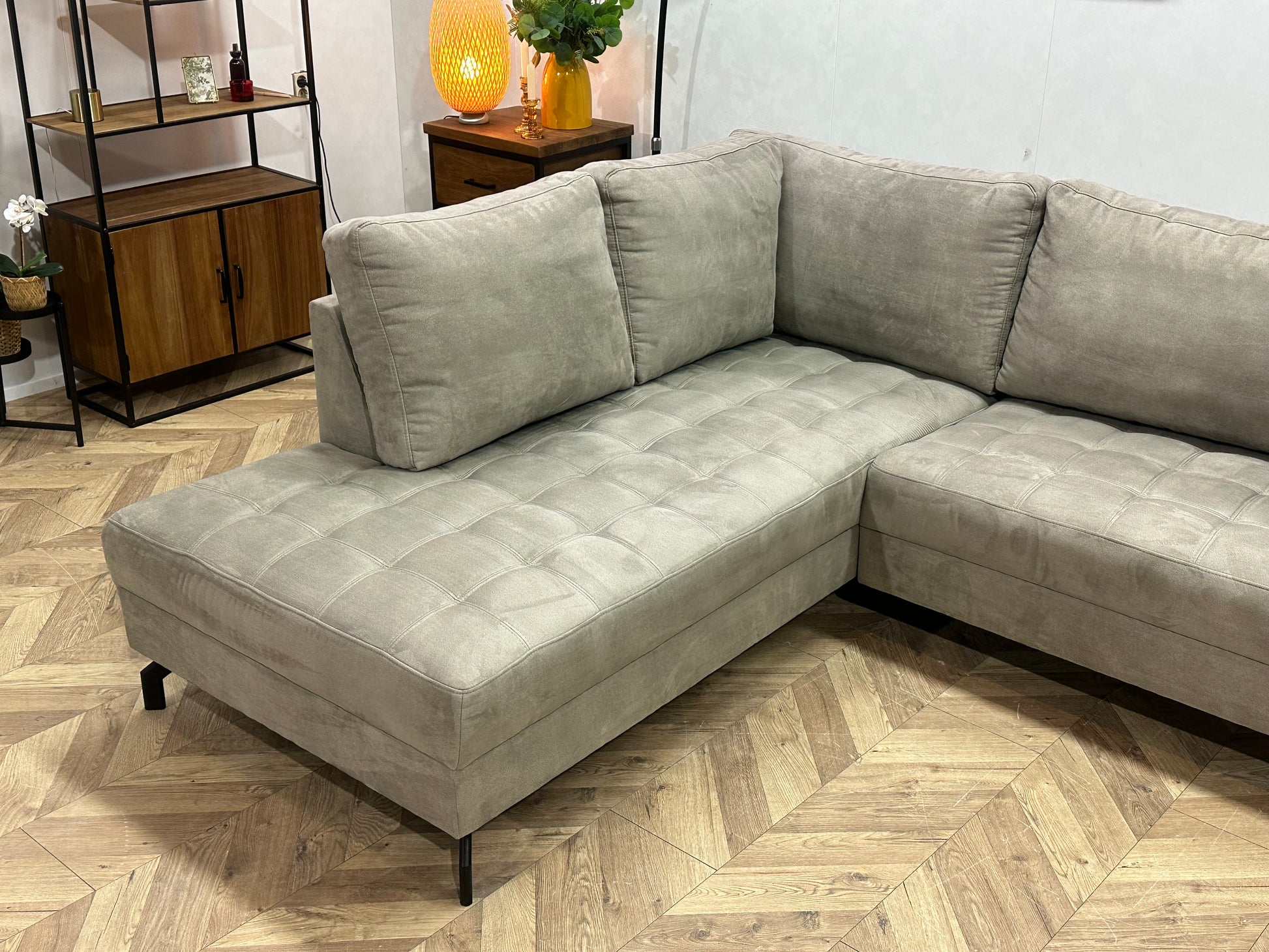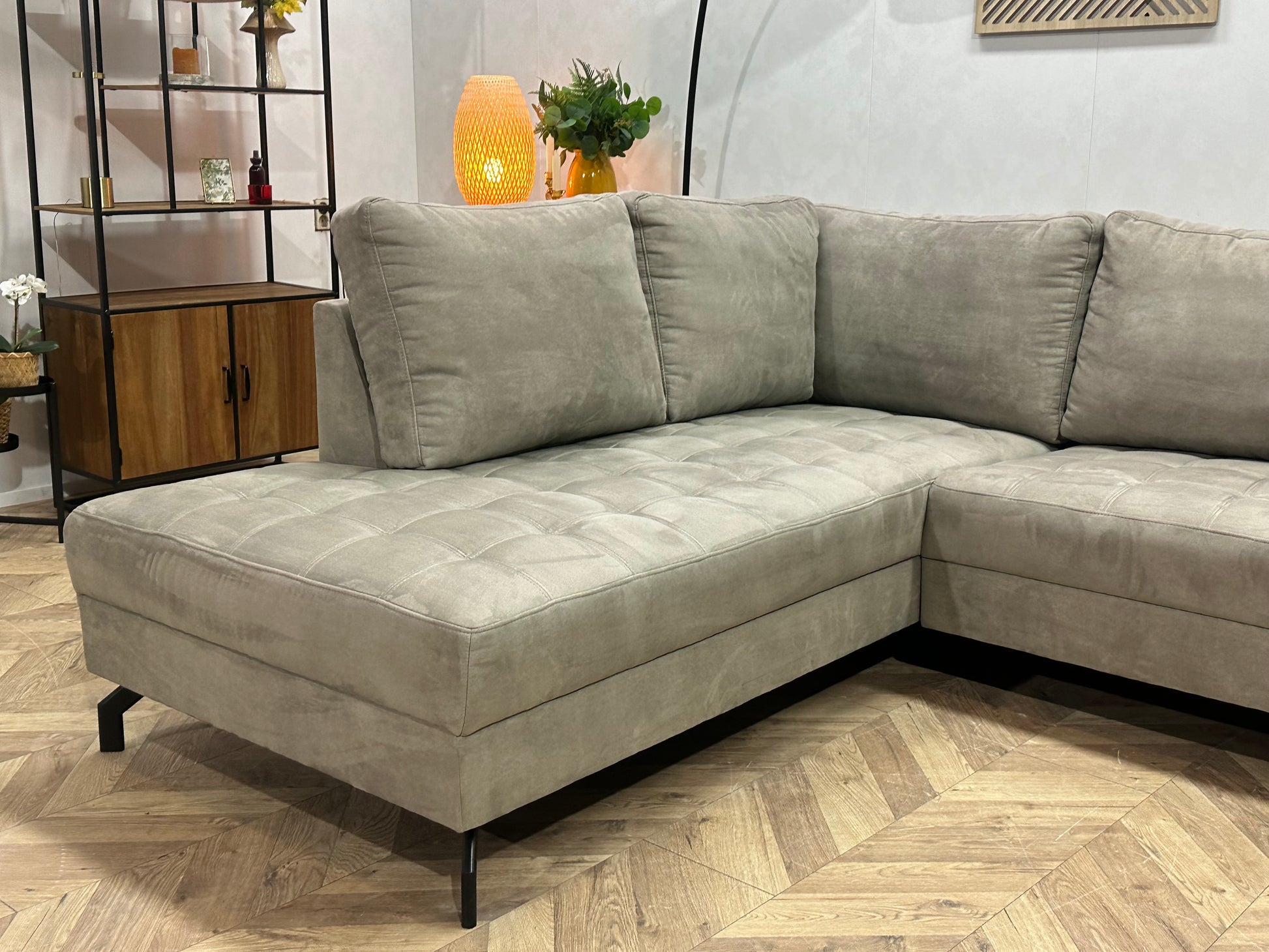Grijze Suède Stoffen Hoekbank ~ Losse Rugkussens Met Afneembare Hoezen