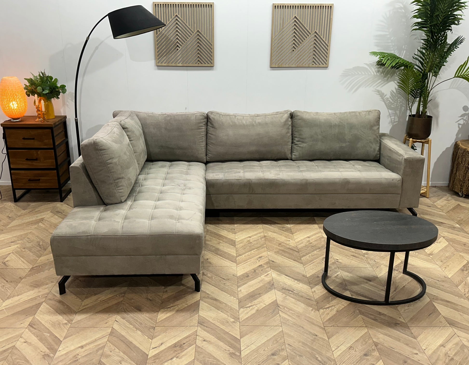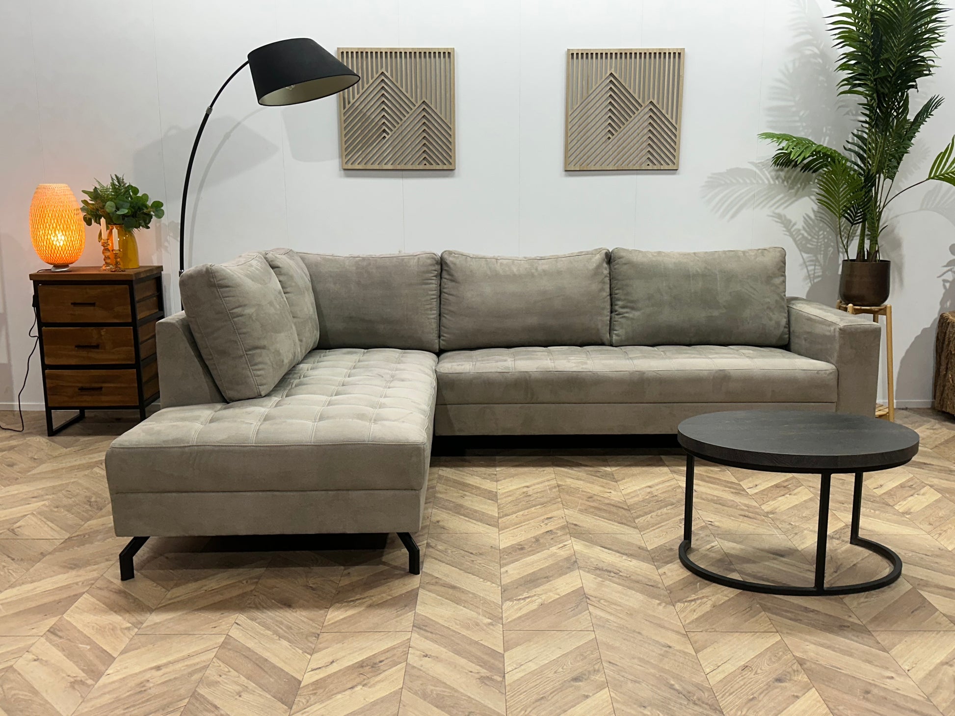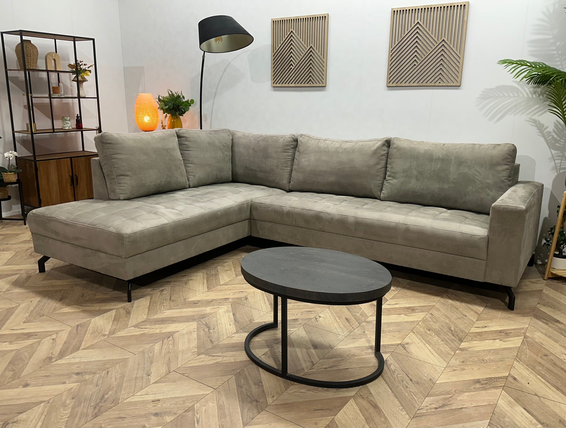 Grijze Suède Stoffen Hoekbank ~ Losse Rugkussens Met Afneembare Hoezen