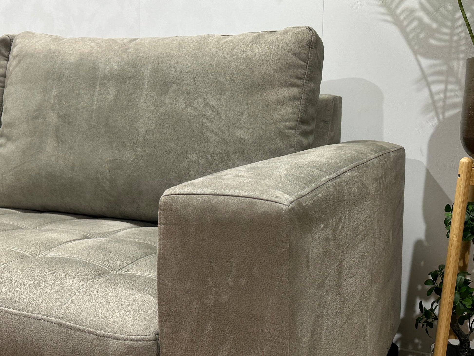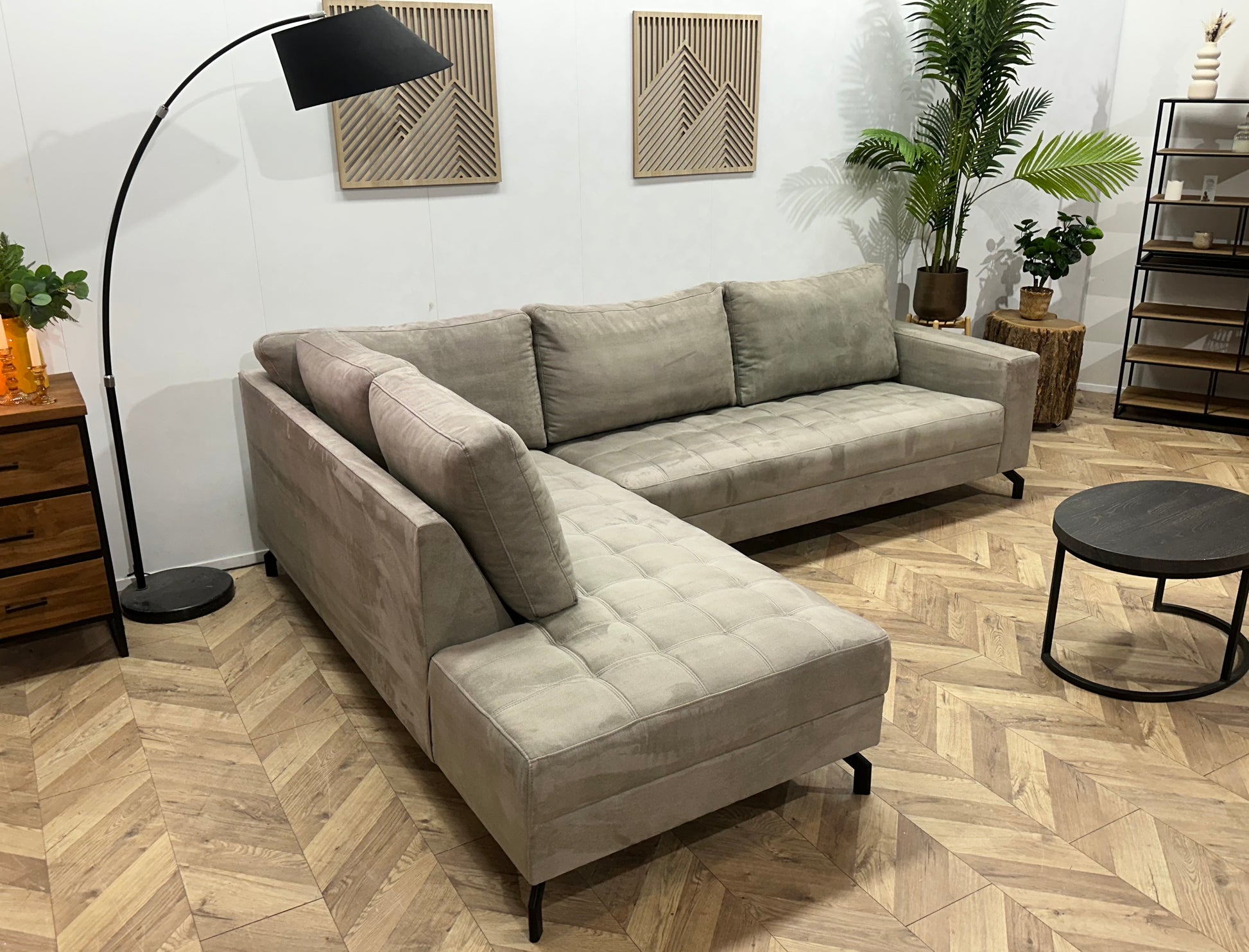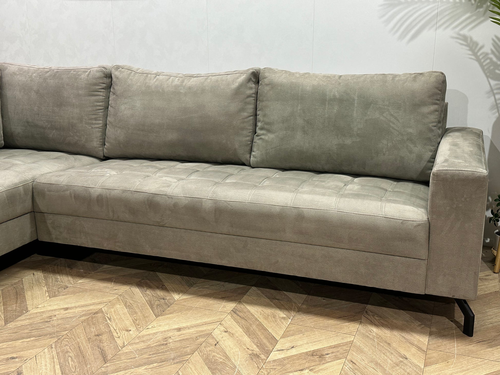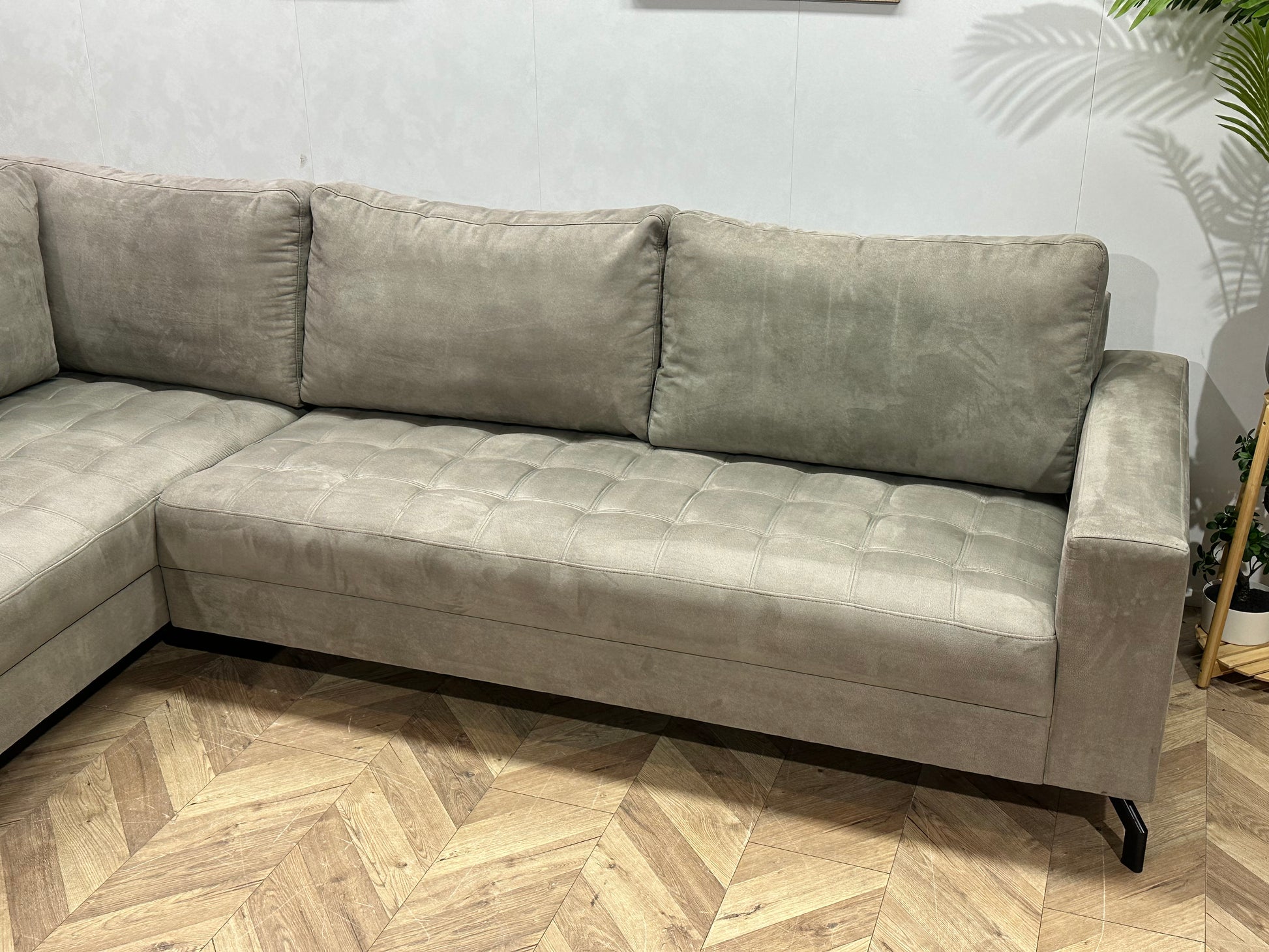 Grijze Suède Stoffen Hoekbank ~ Losse Rugkussens Met Afneembare Hoezen