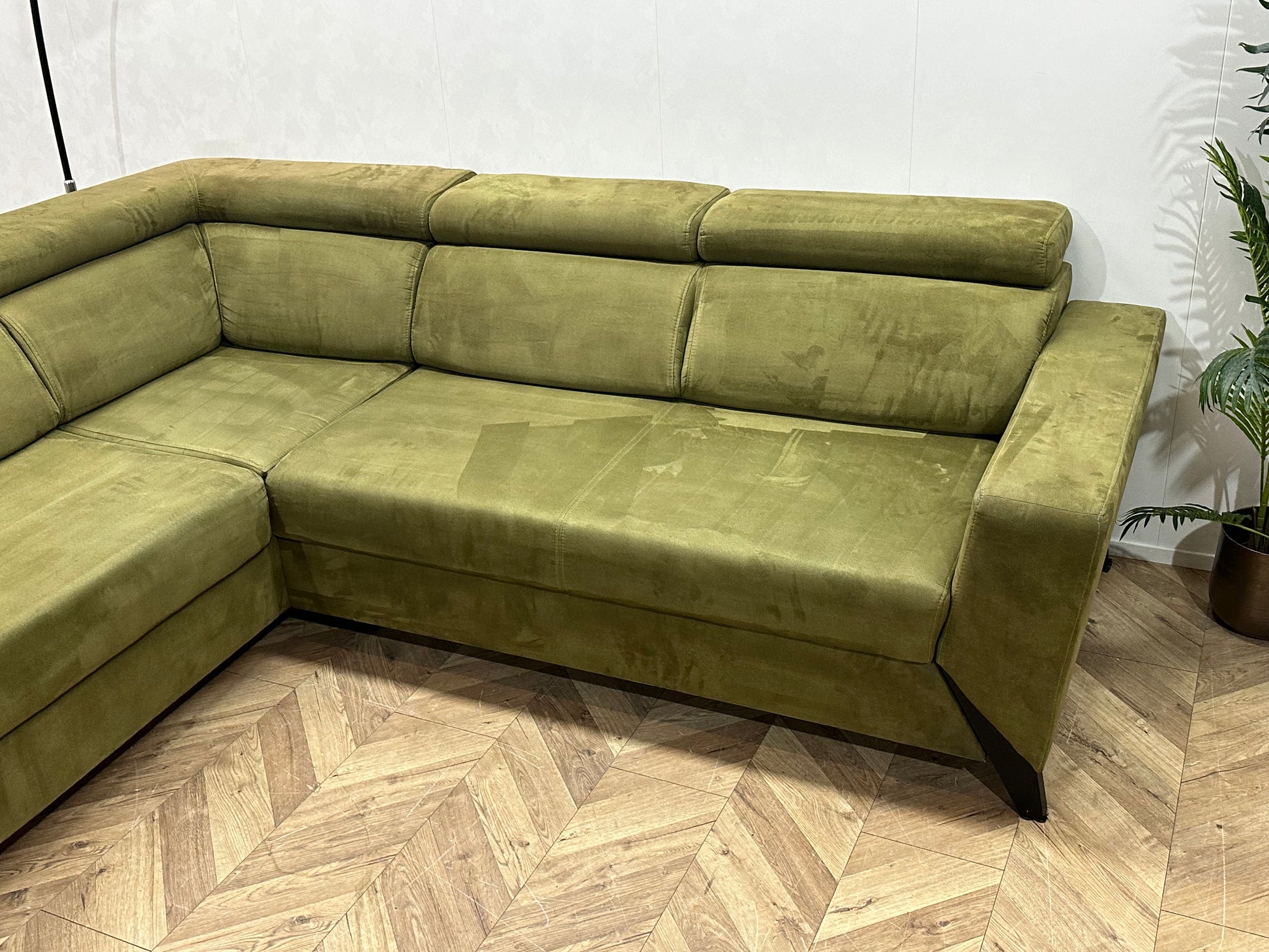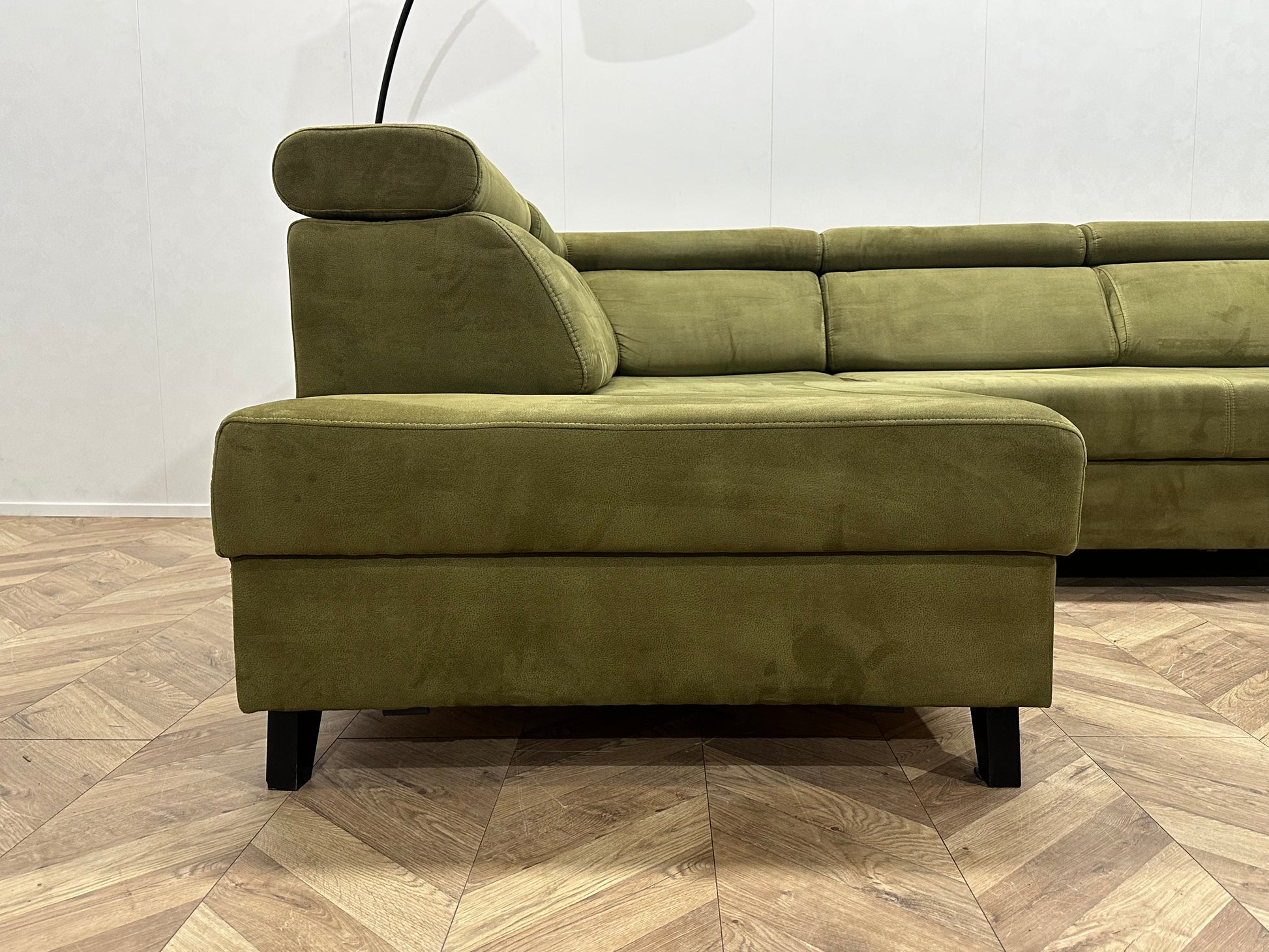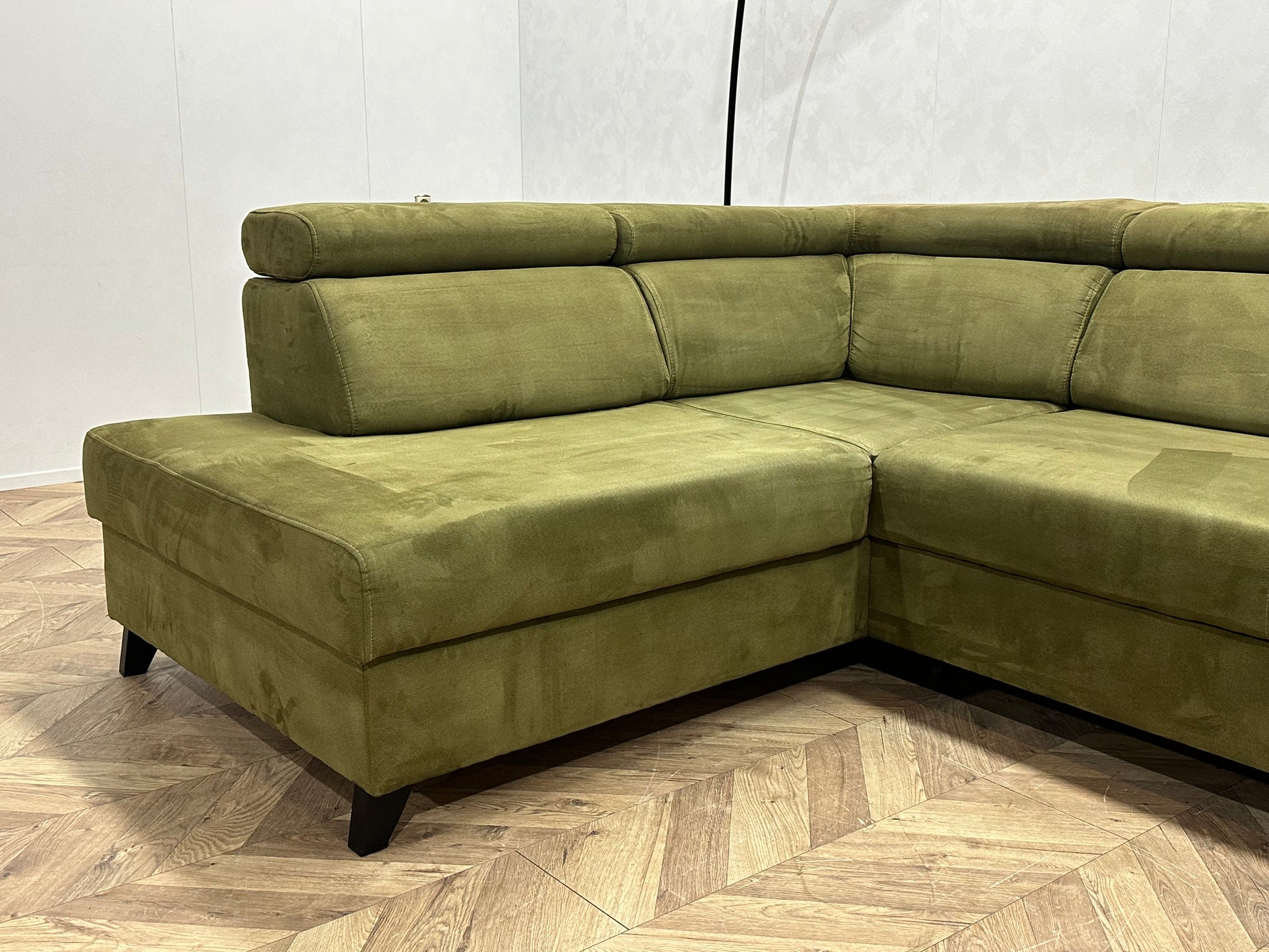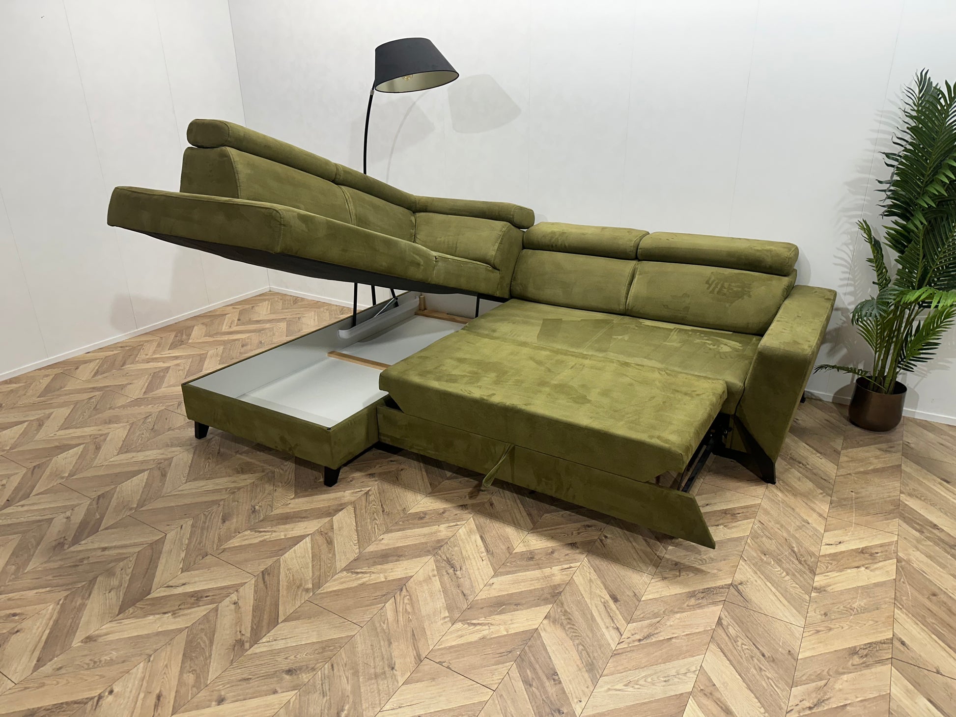 Groene Suède Stoffen Hoekbank ~ Opbergruimte ~ Slaapfunctie ~ Verstelbare Hoofdsteunen