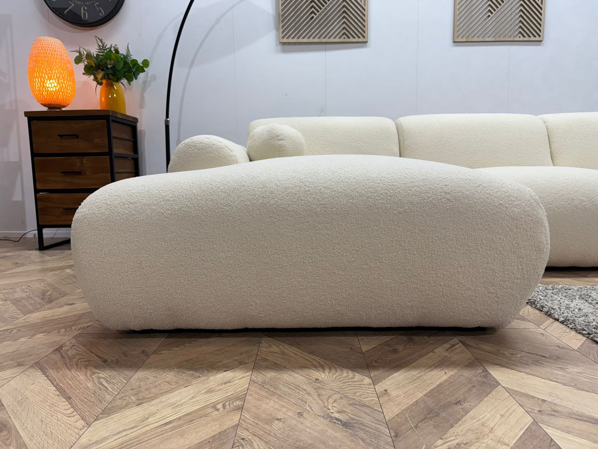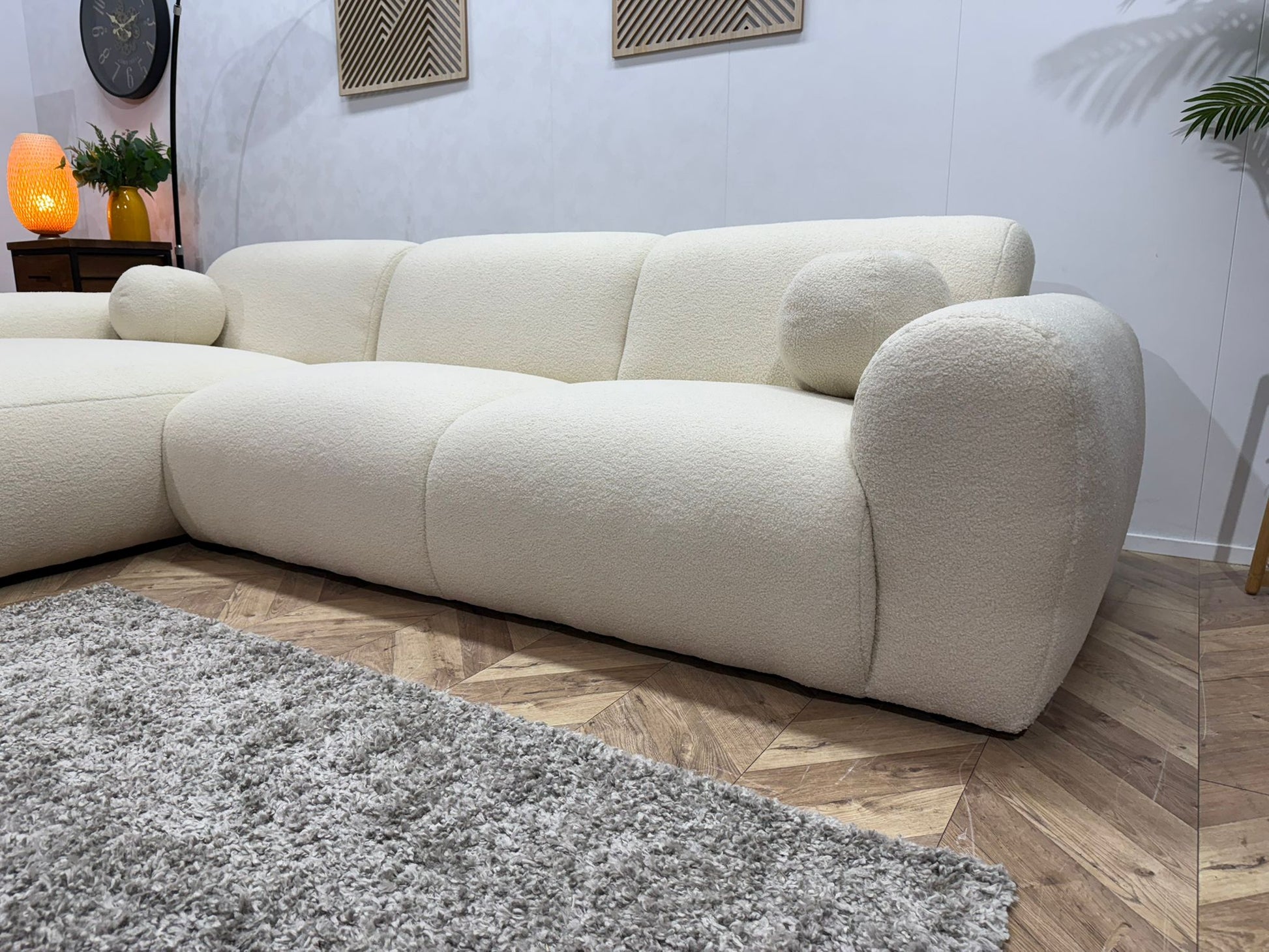 Dankzij het tijdloze ontwerp en de luxe bouclé stof past deze hoekbank moeiteloos in diverse woonstijlen, zoals modern, Scandinavisch en minimalistisch.