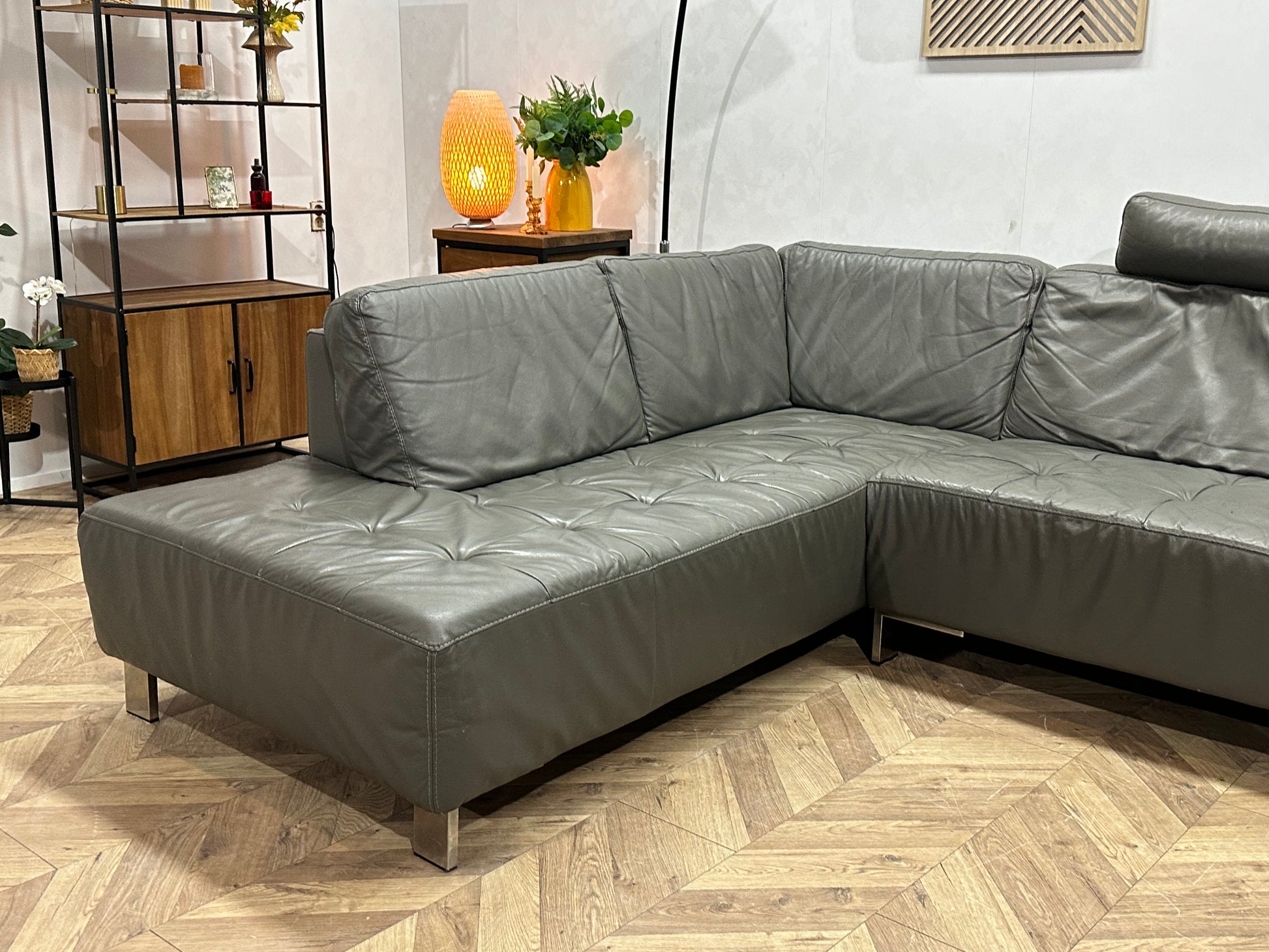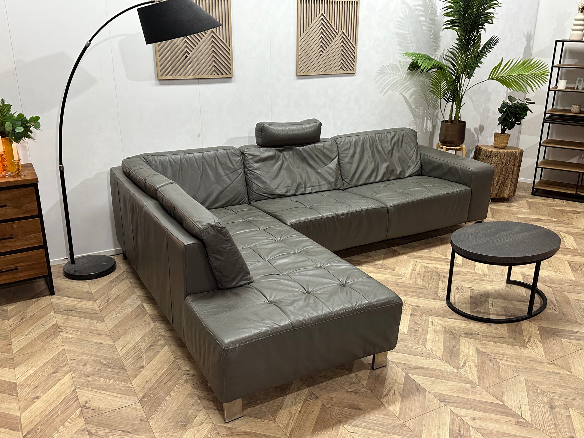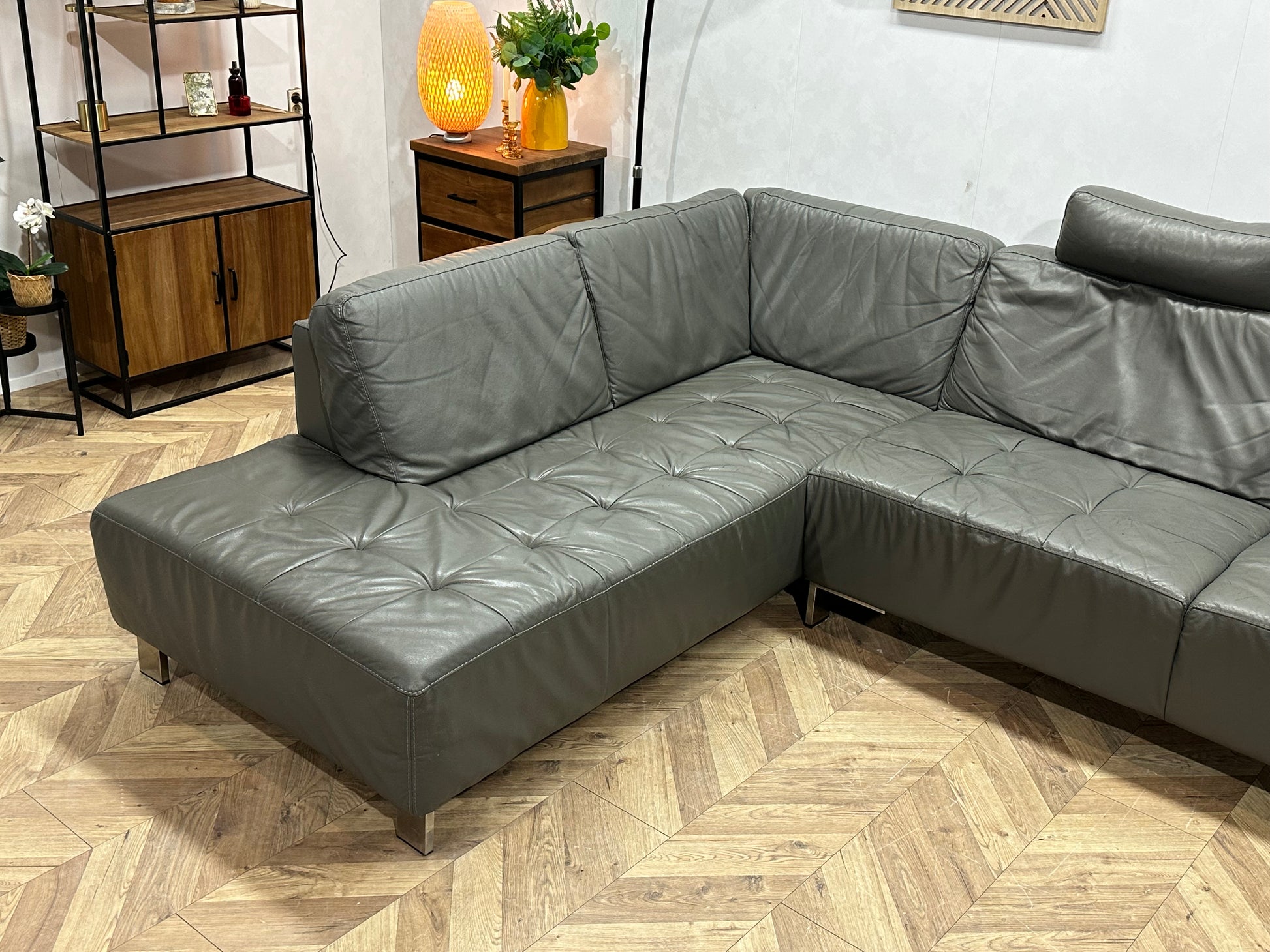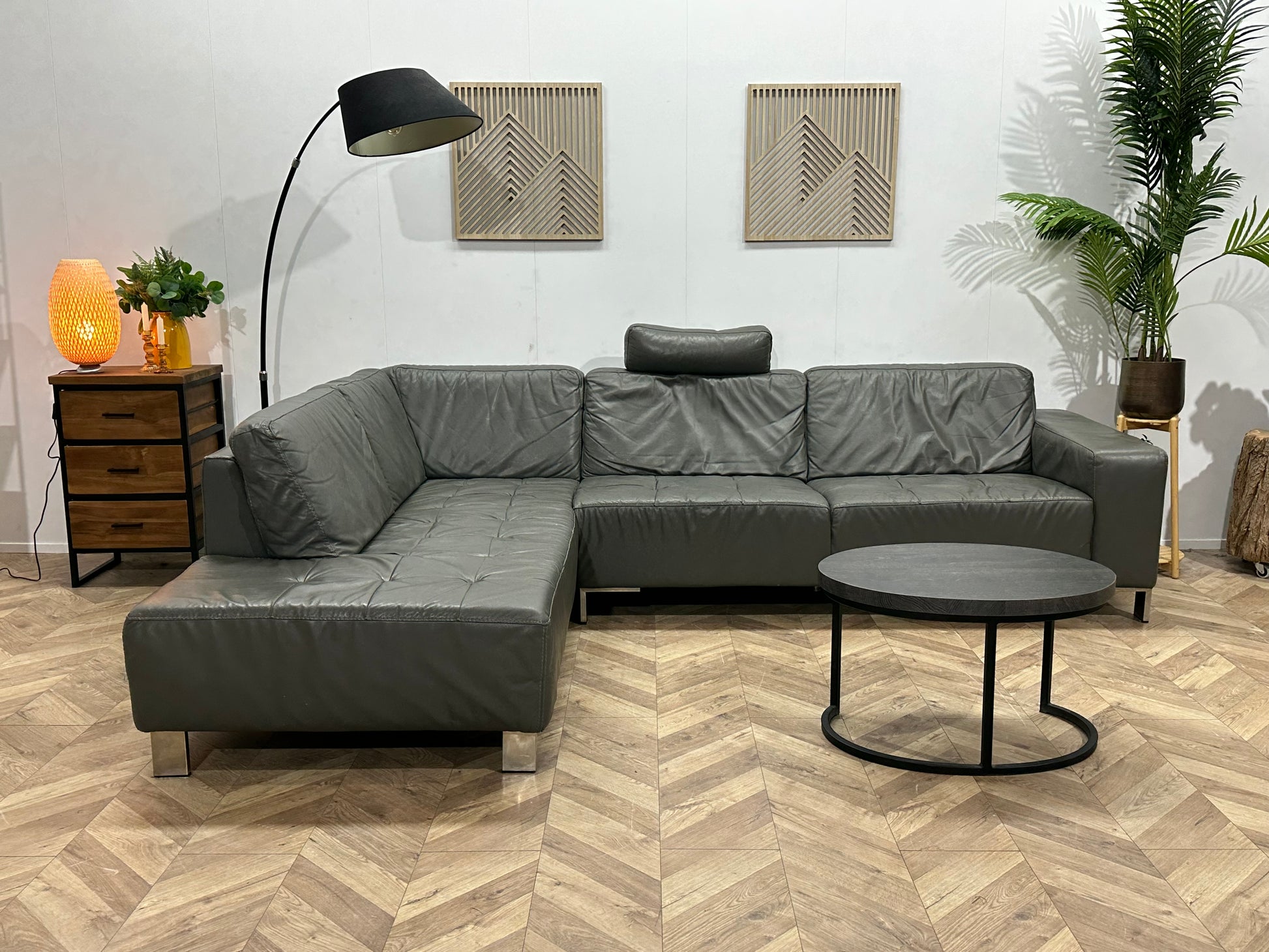 Montèl Grijze Echt Lederen Hoekbank ~ Vaste Kussens