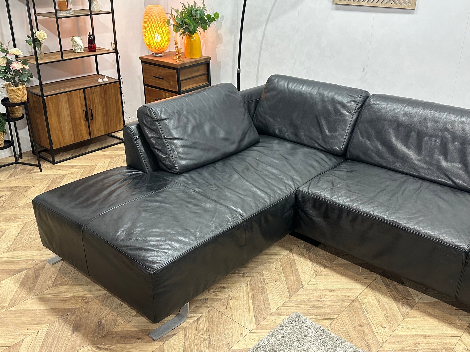 Zwarte Echt Lederen Hoekbank Inc Hocker ~ Vaste Kussens