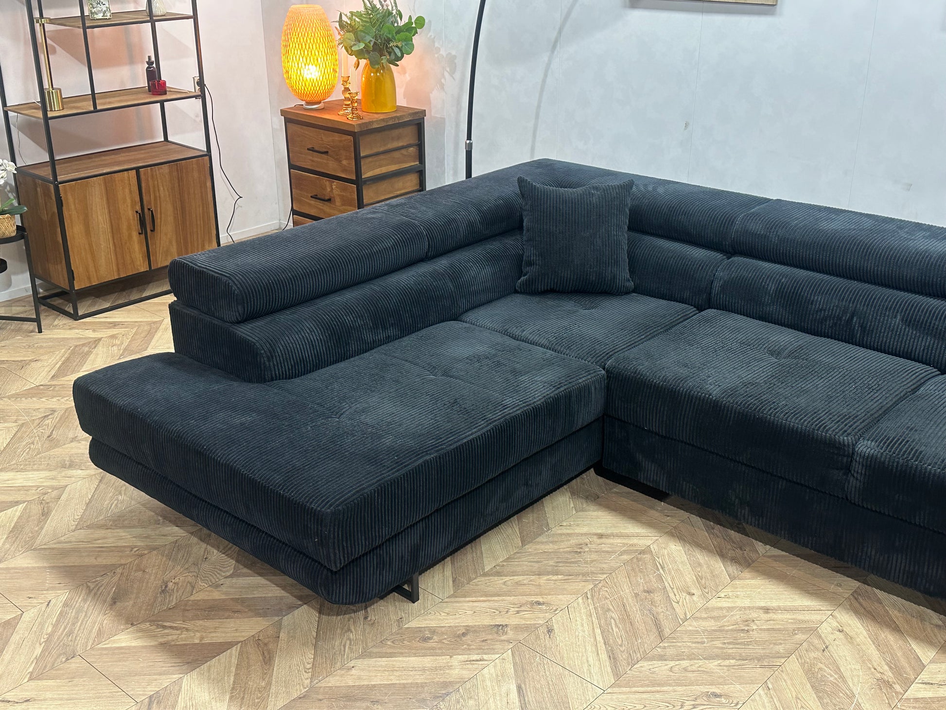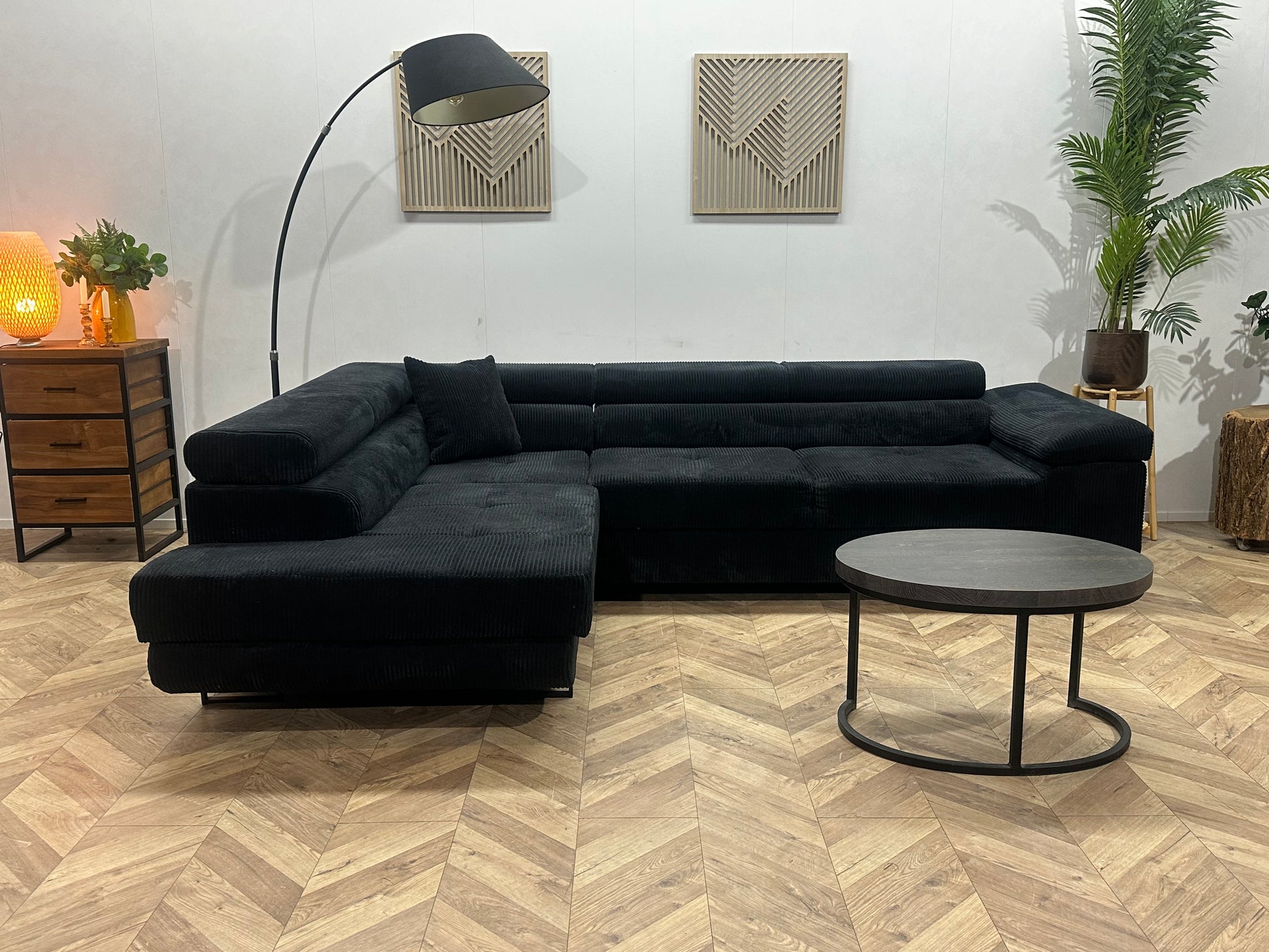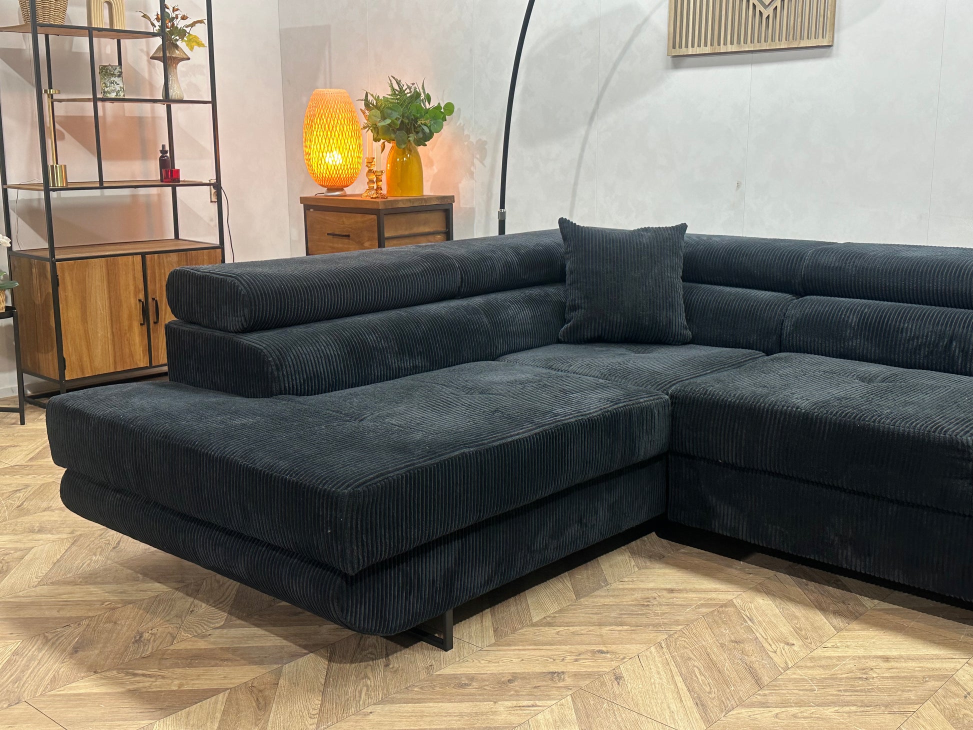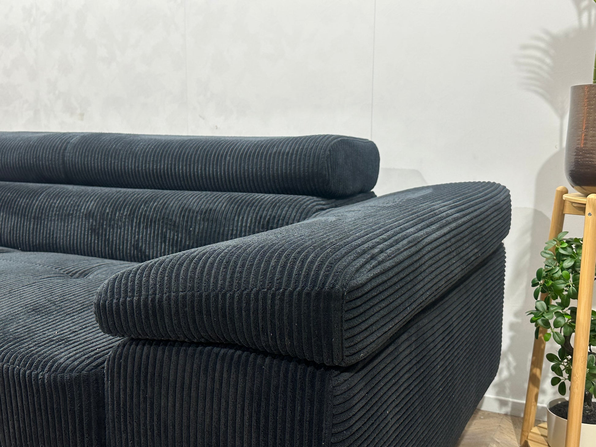 Zwart Ribstof Hoekbank ~ Verstelbare Hoofdsteunen