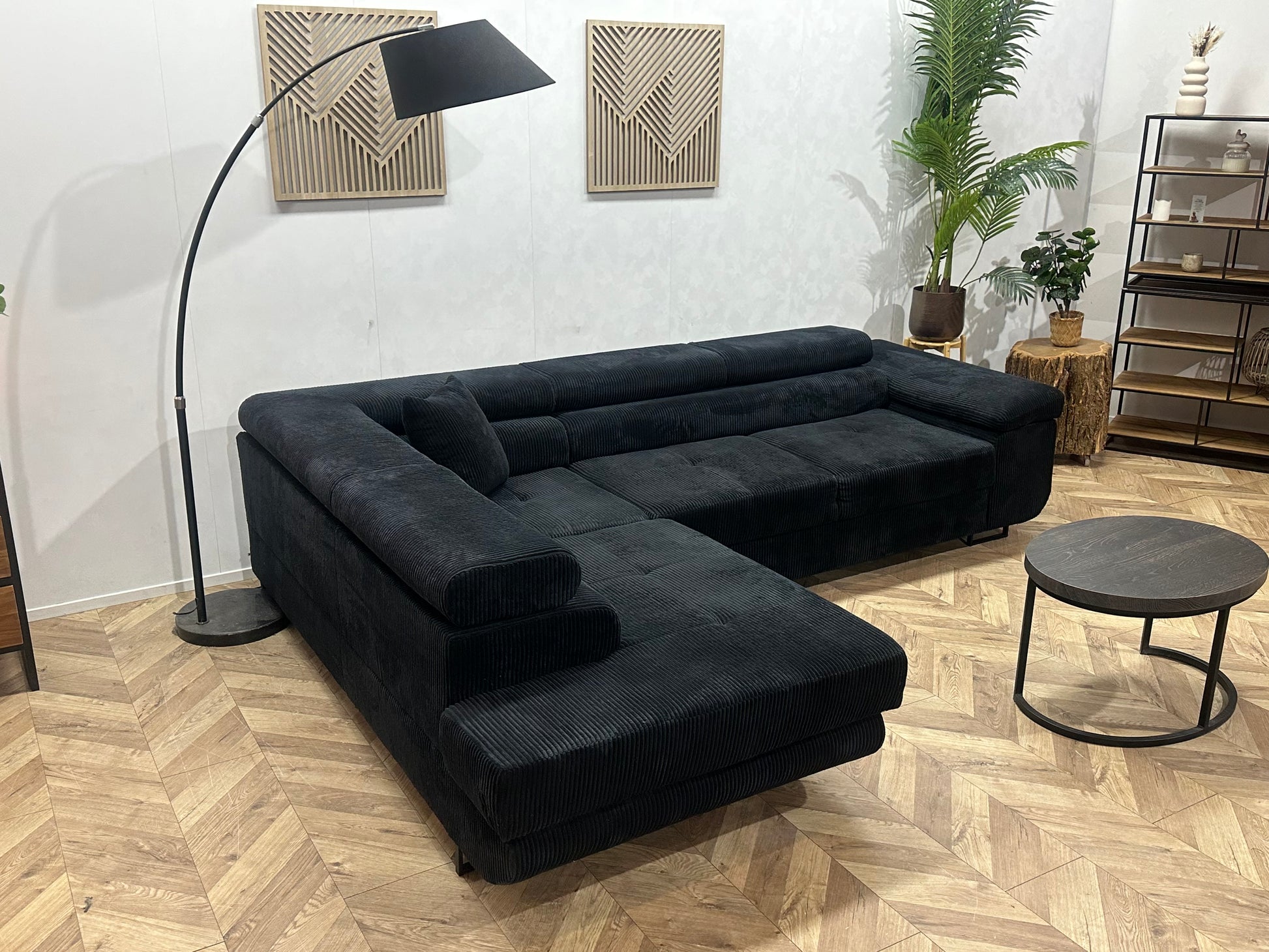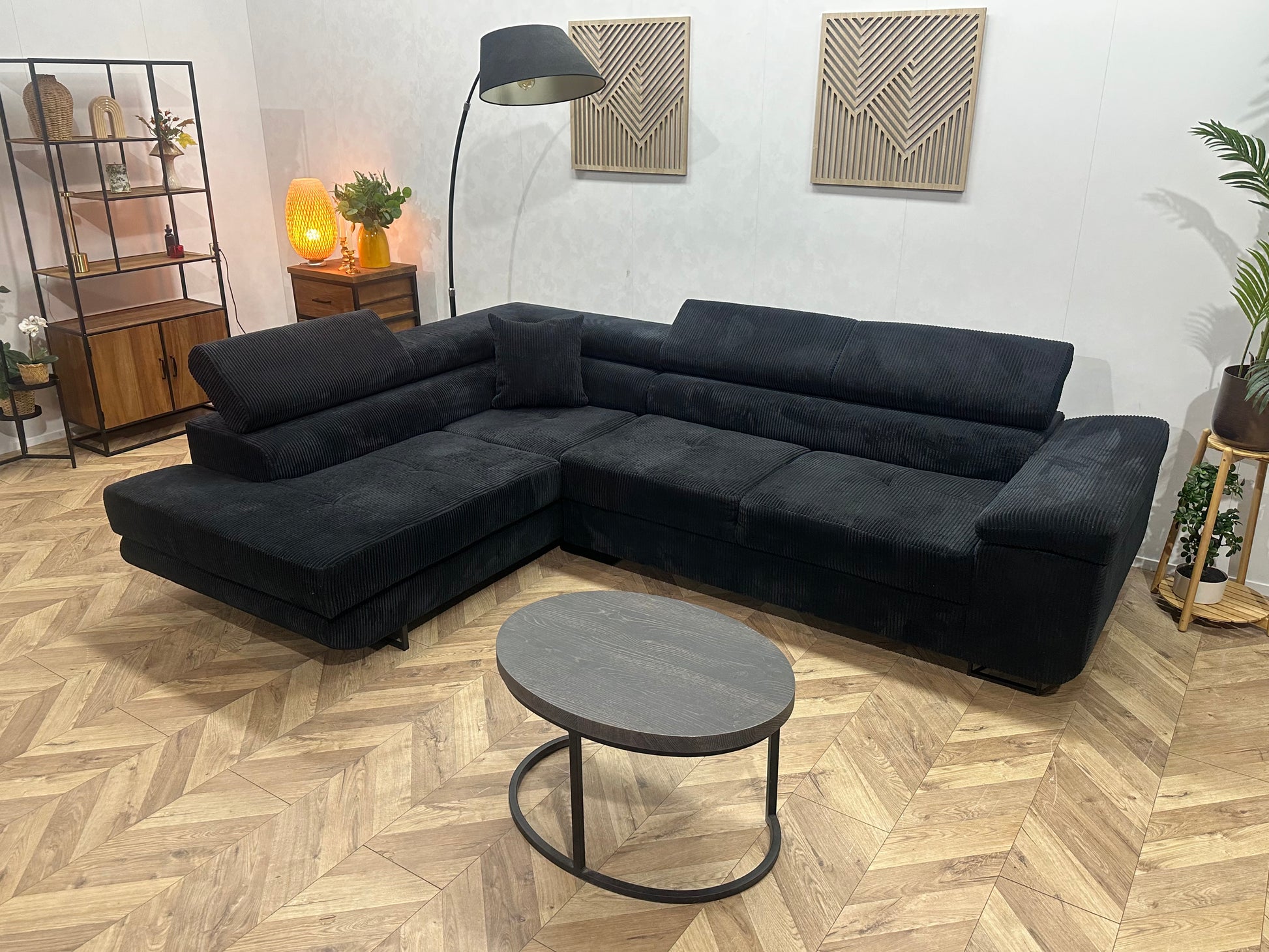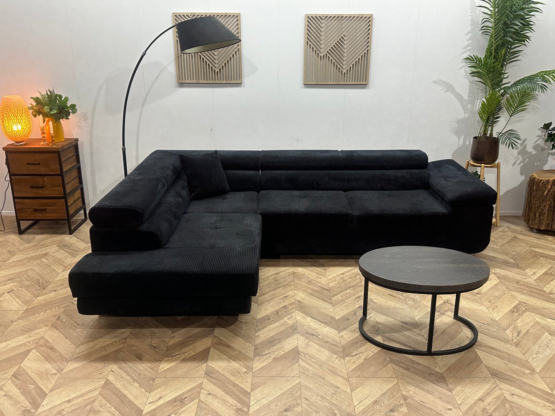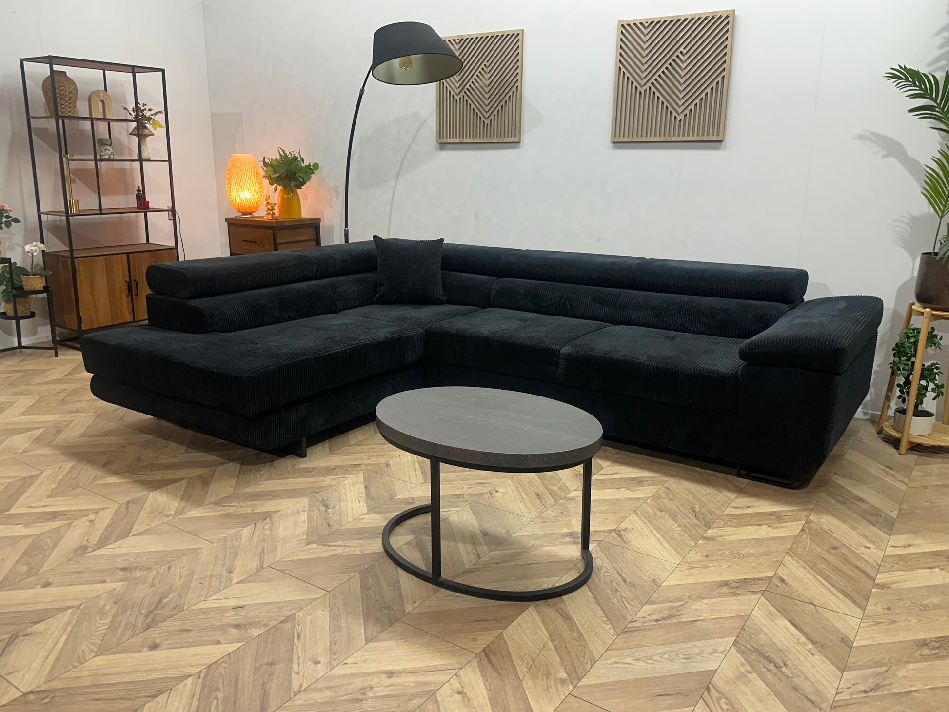 Zwart Ribstof Hoekbank ~ Verstelbare Hoofdsteunen