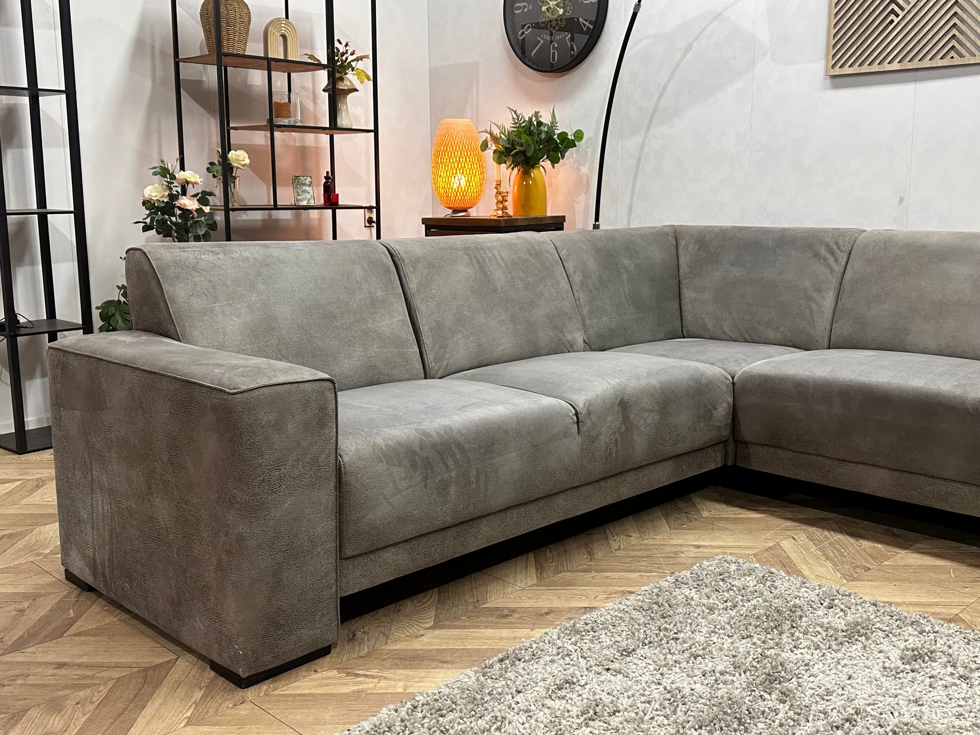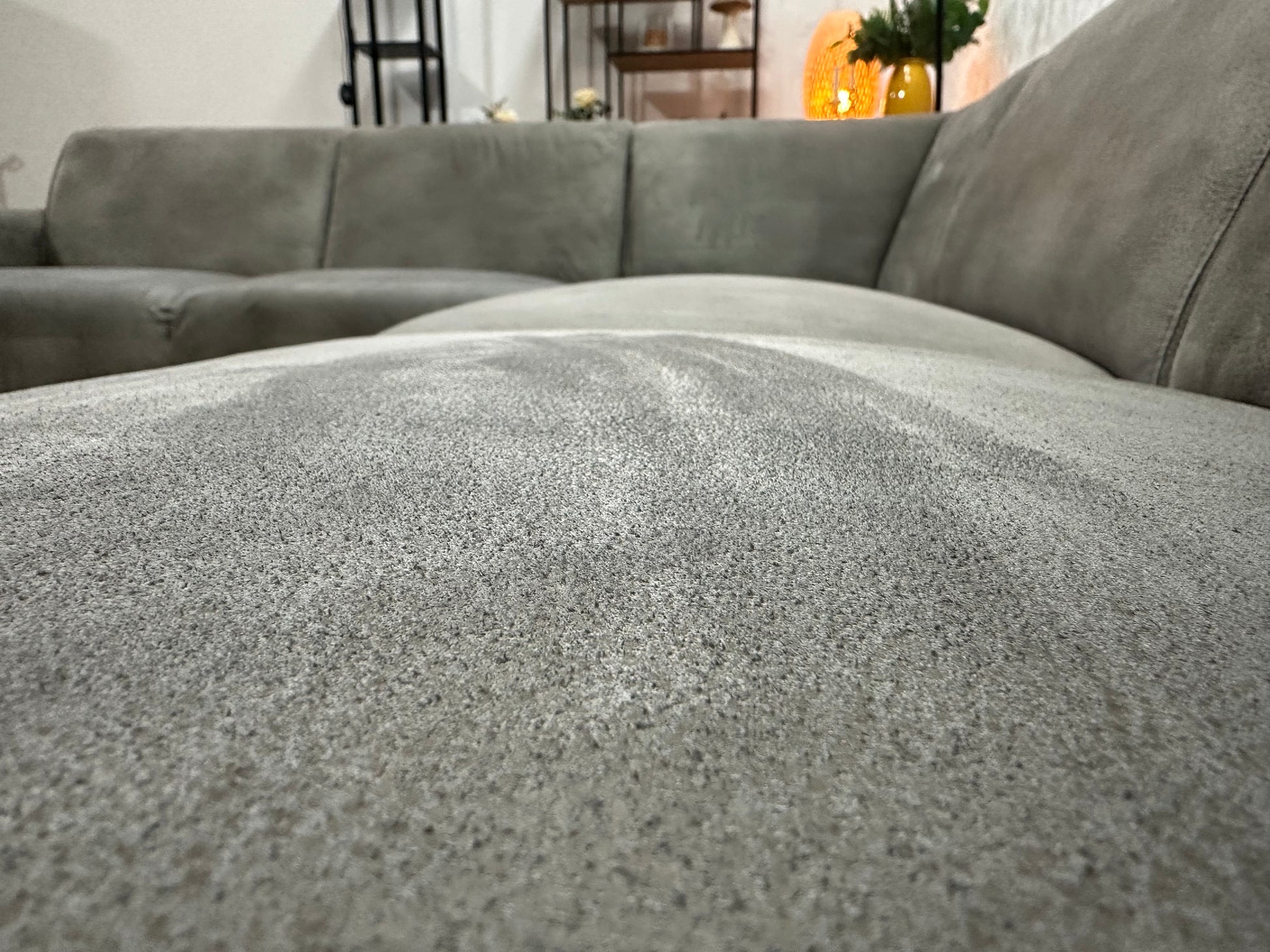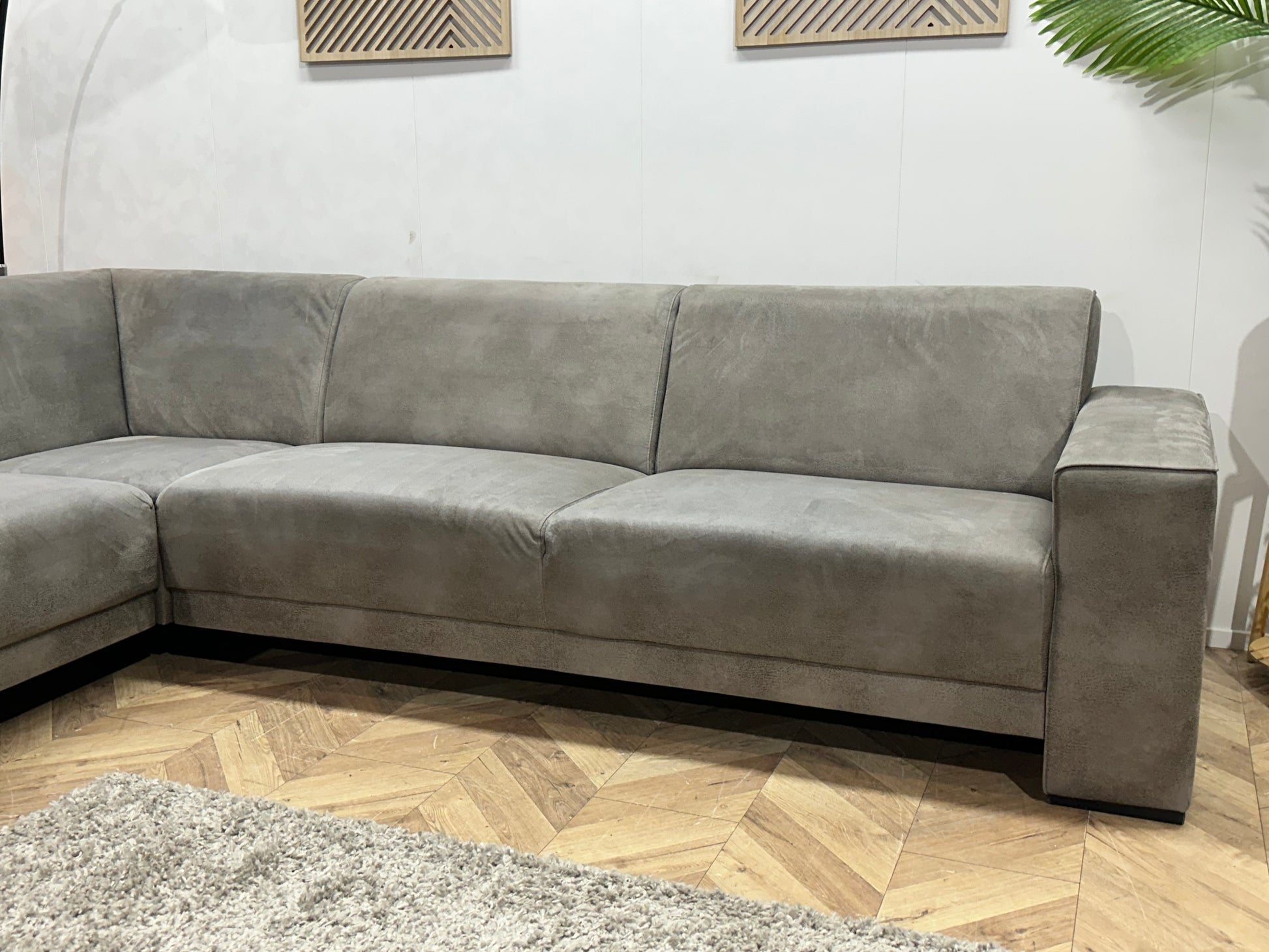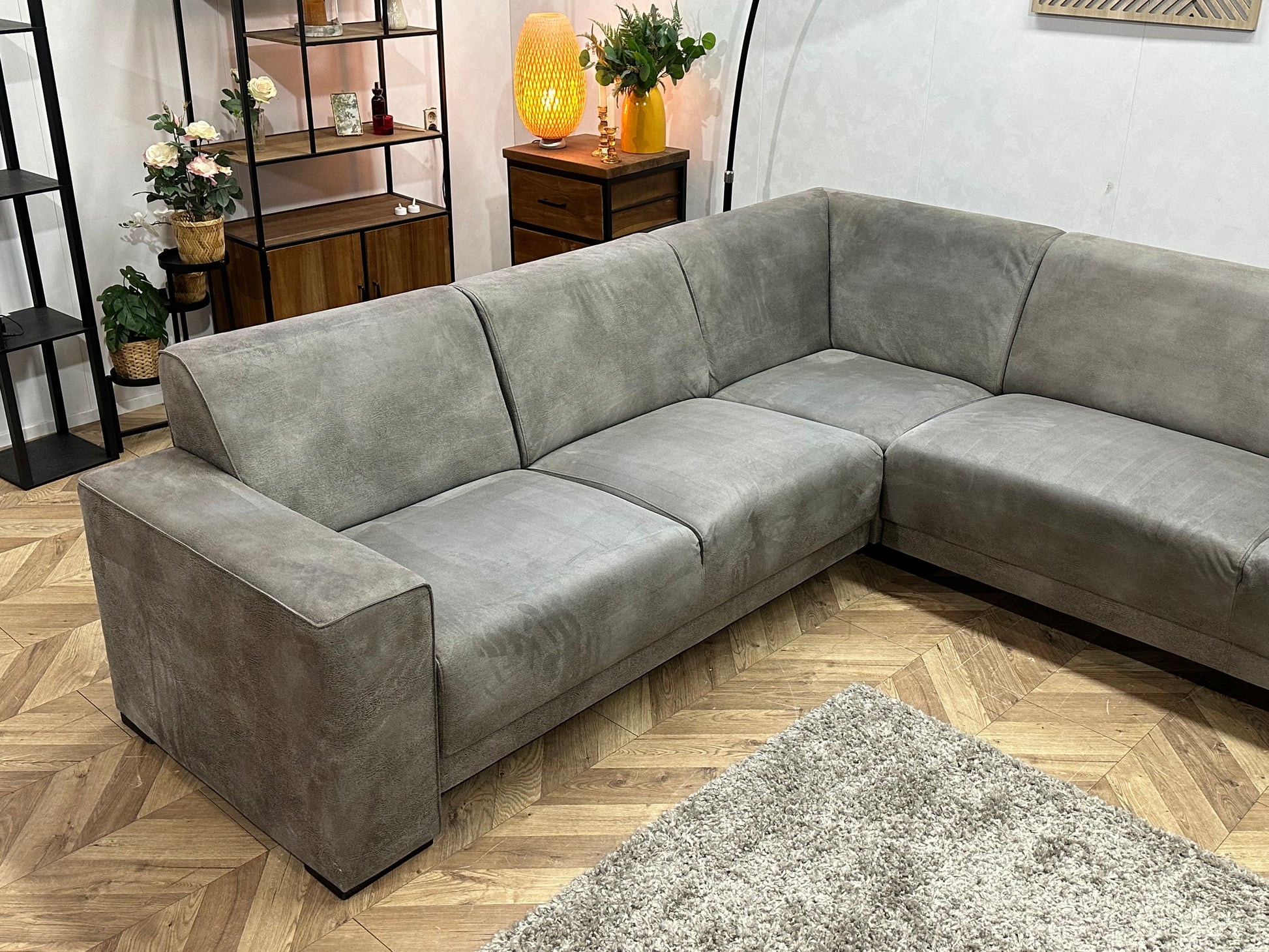 Grijze Suède Stoffen Hoekbank ~ Vaste Kussens