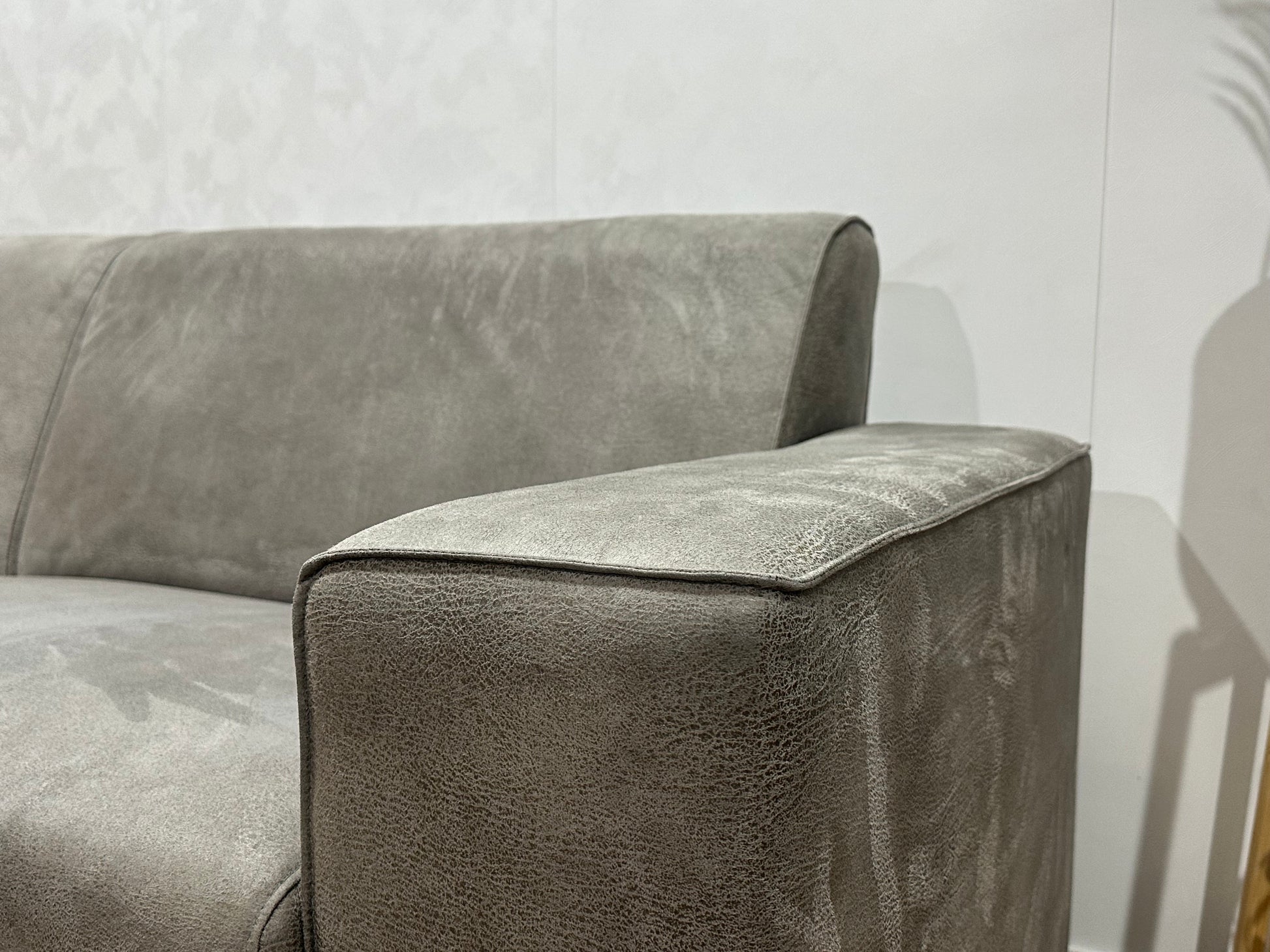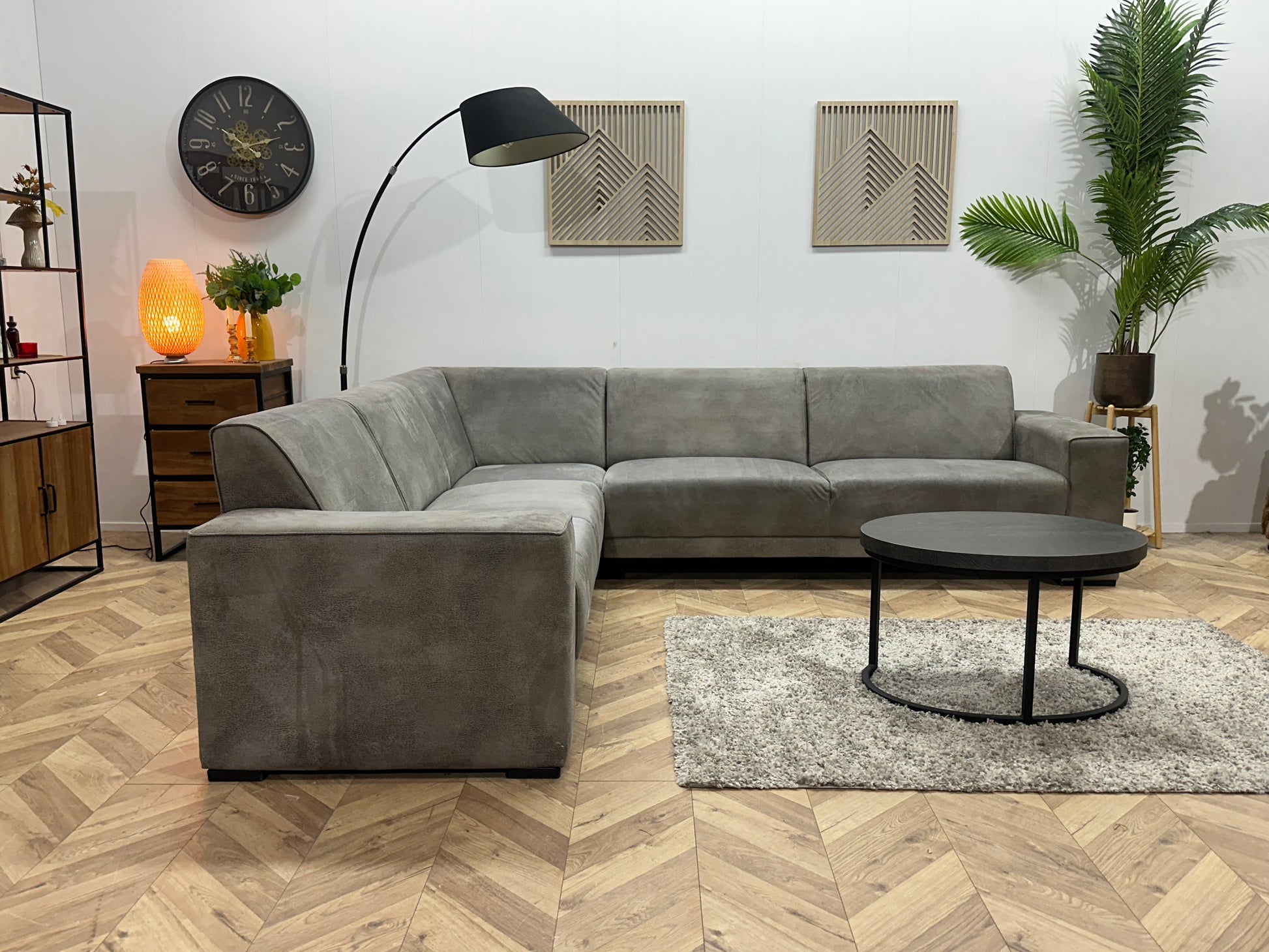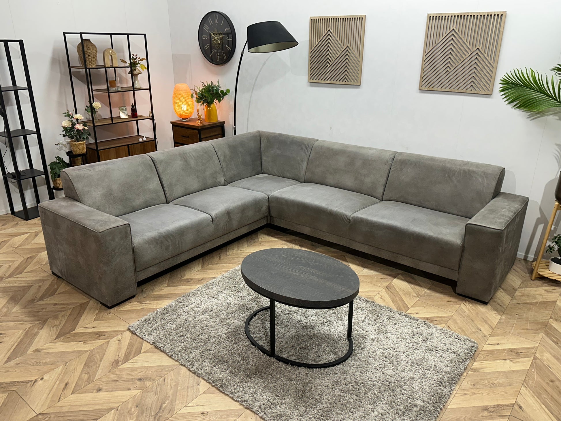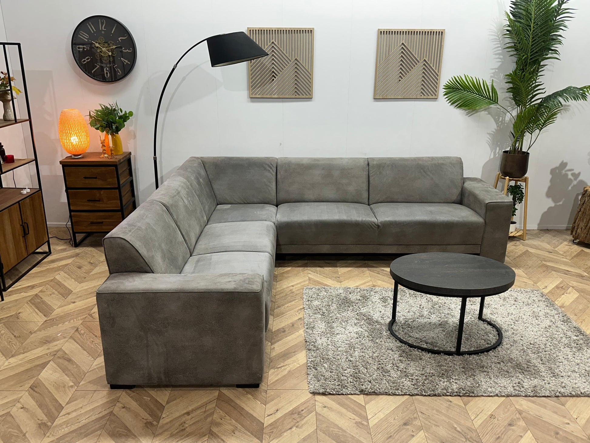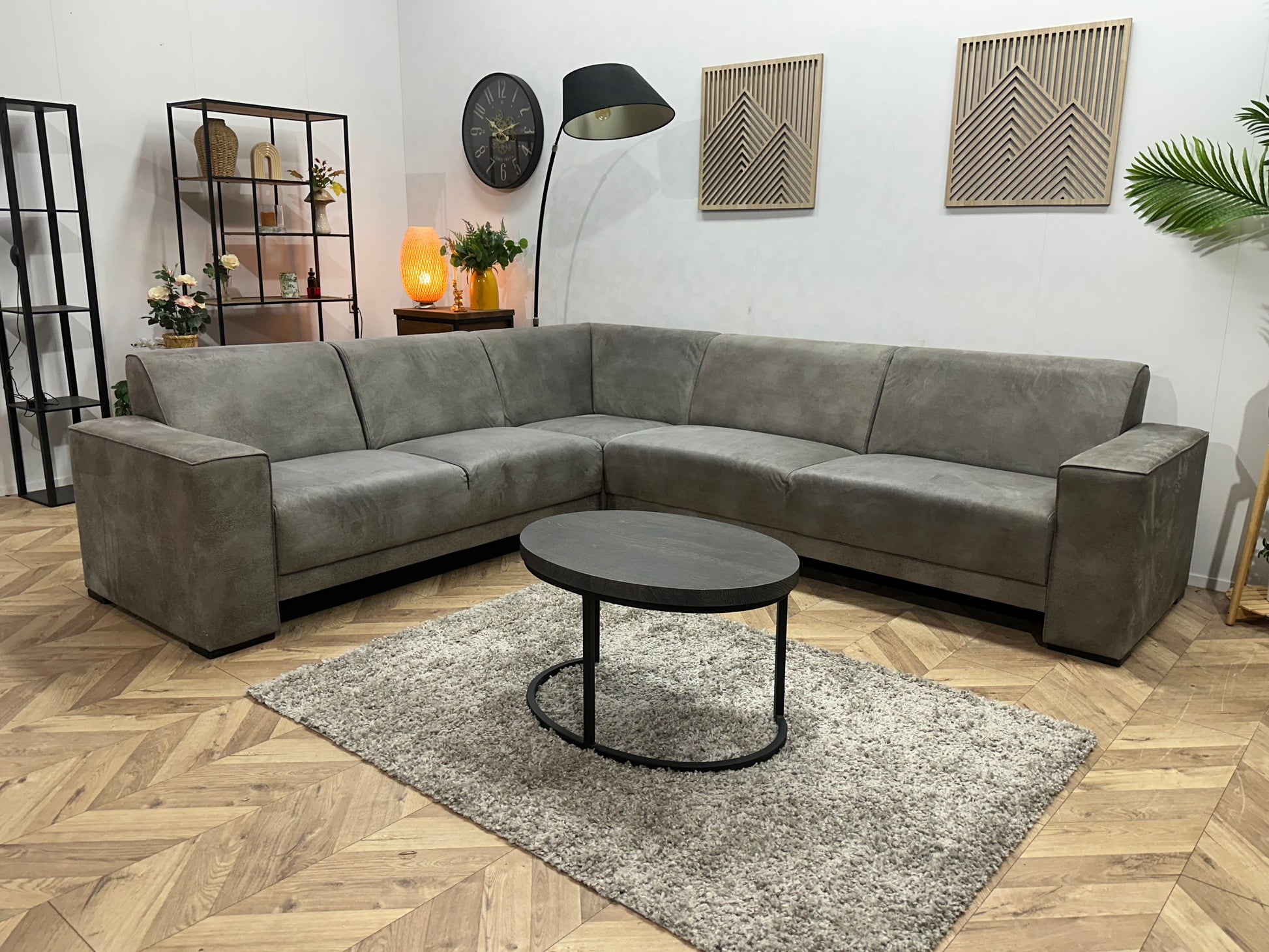 Grijze Suède Stoffen Hoekbank ~ Vaste Kussens