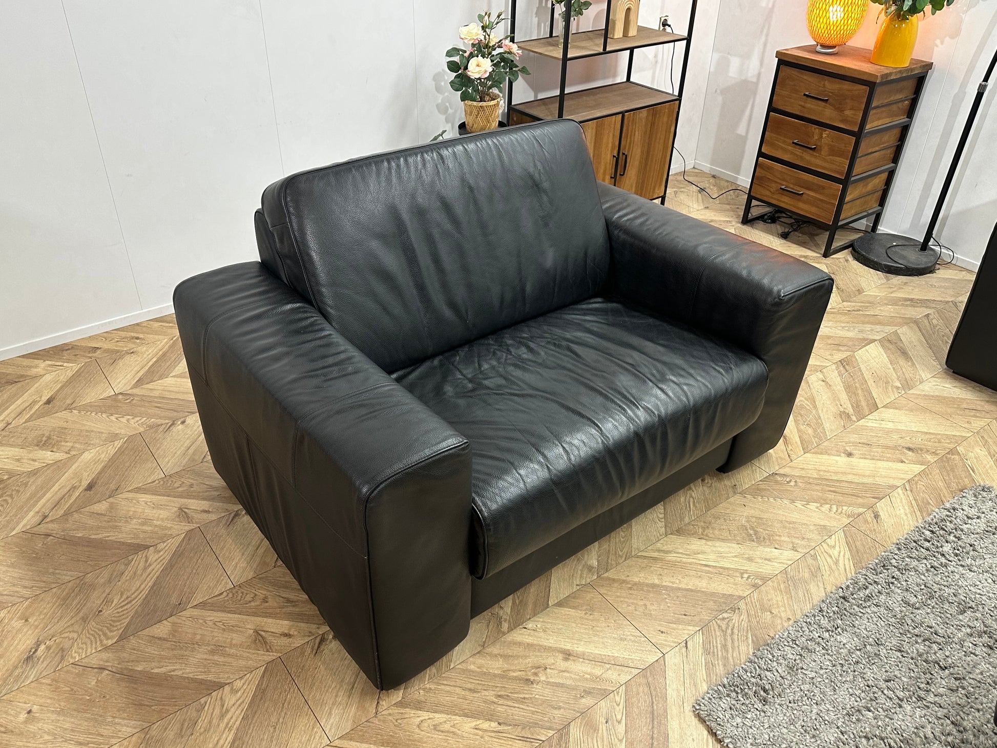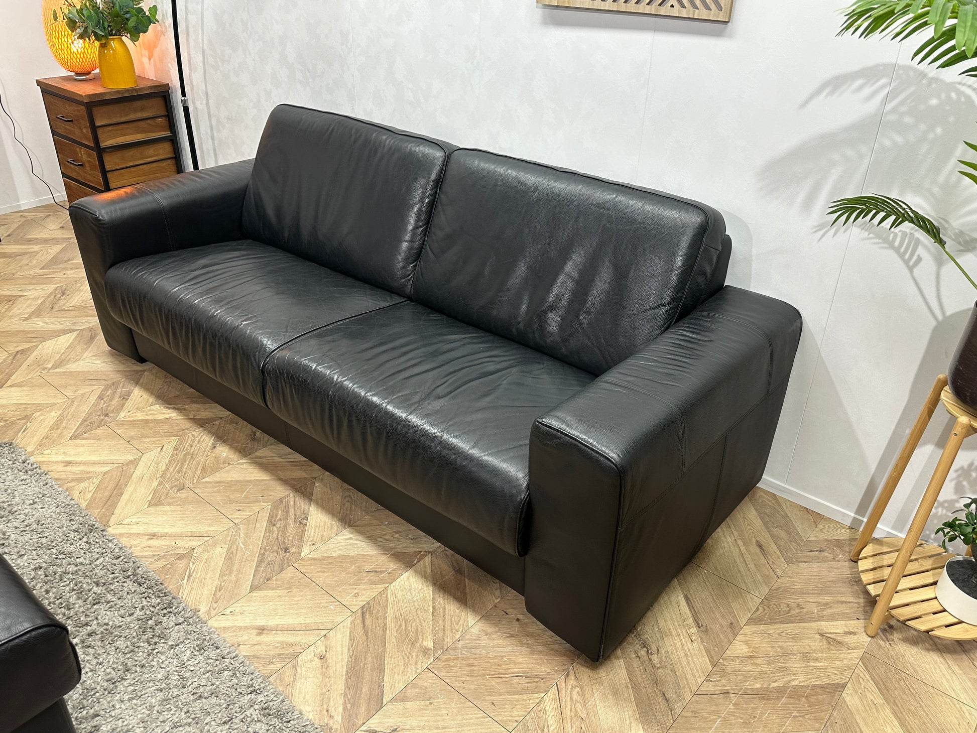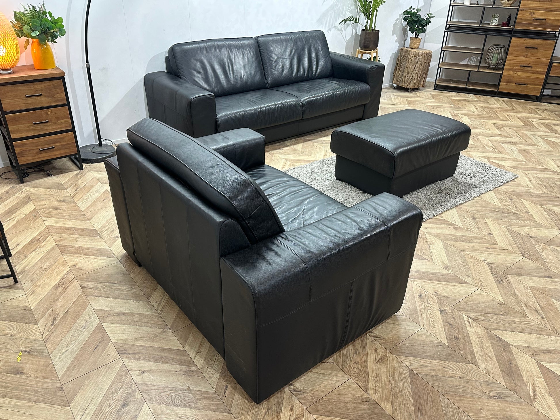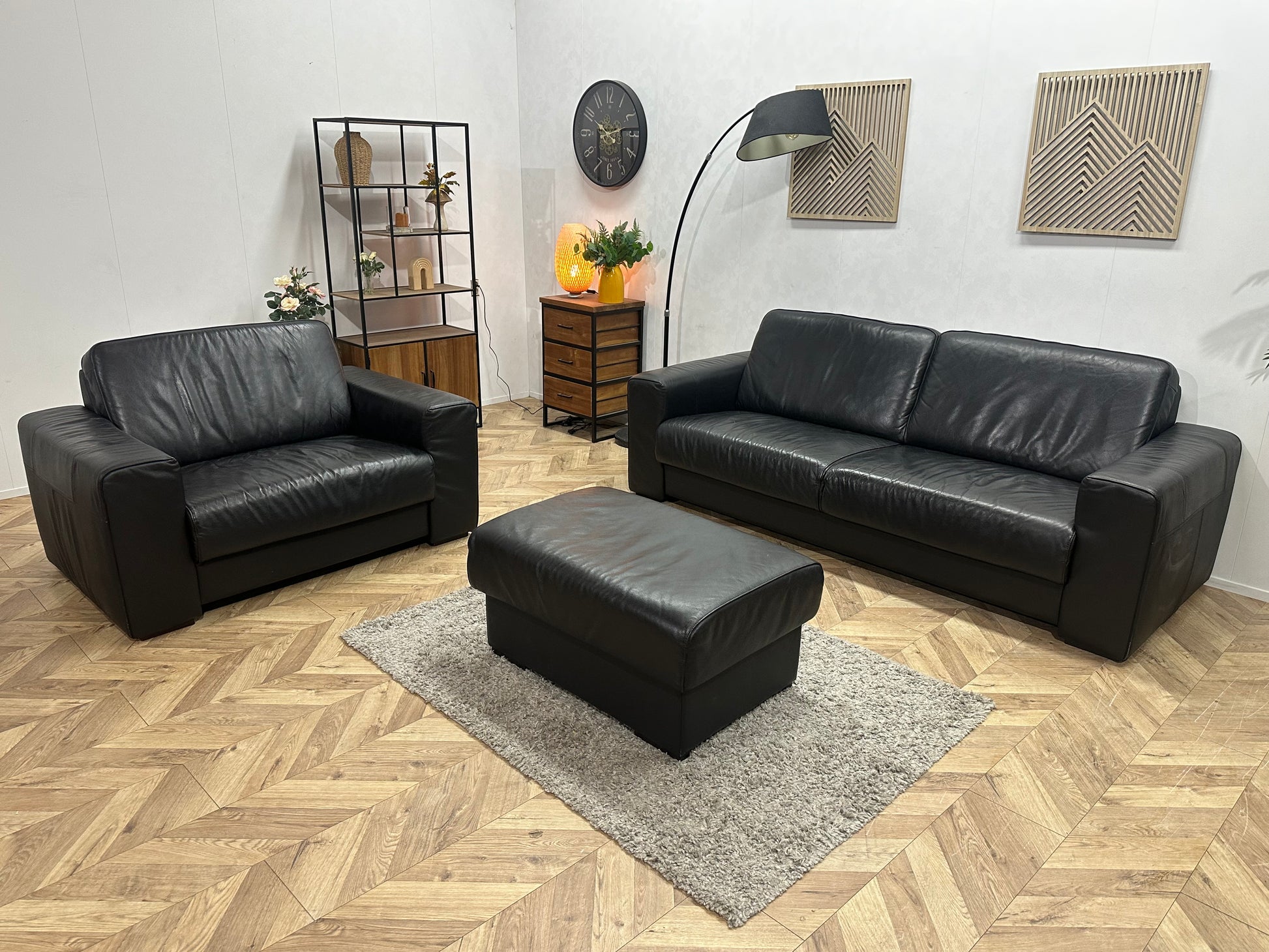 H&H Zwart Lederen Banken Set Incl Hocker ~ Vaste Kussens
