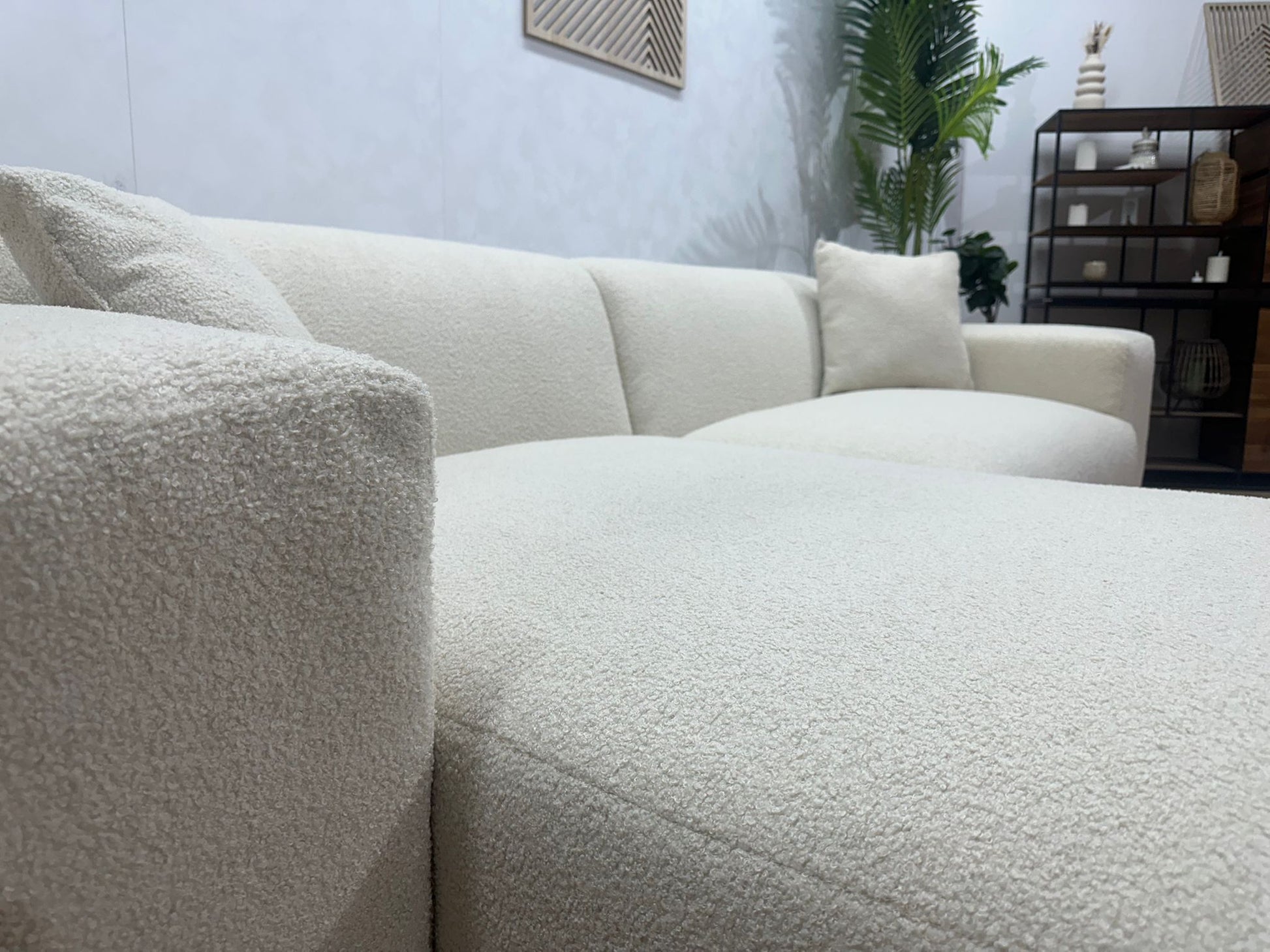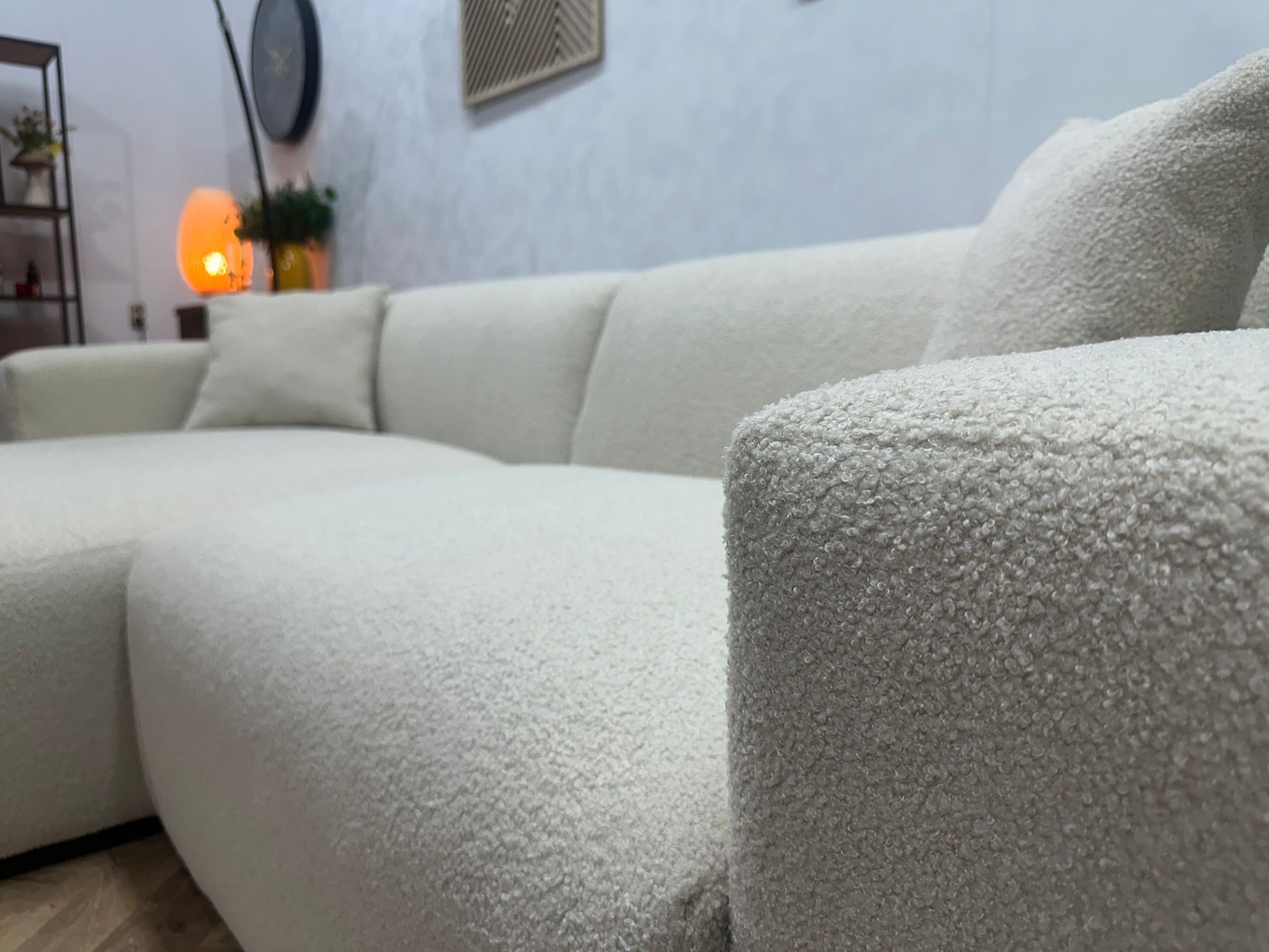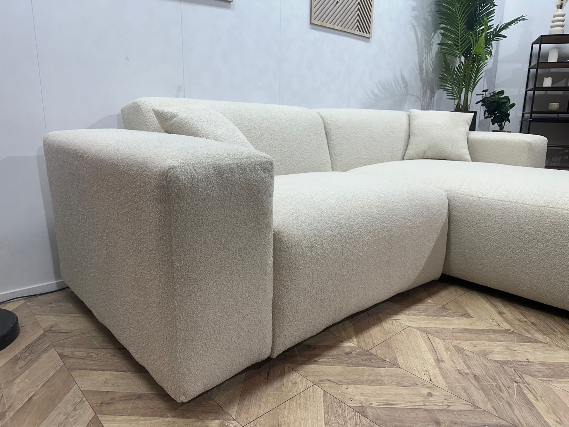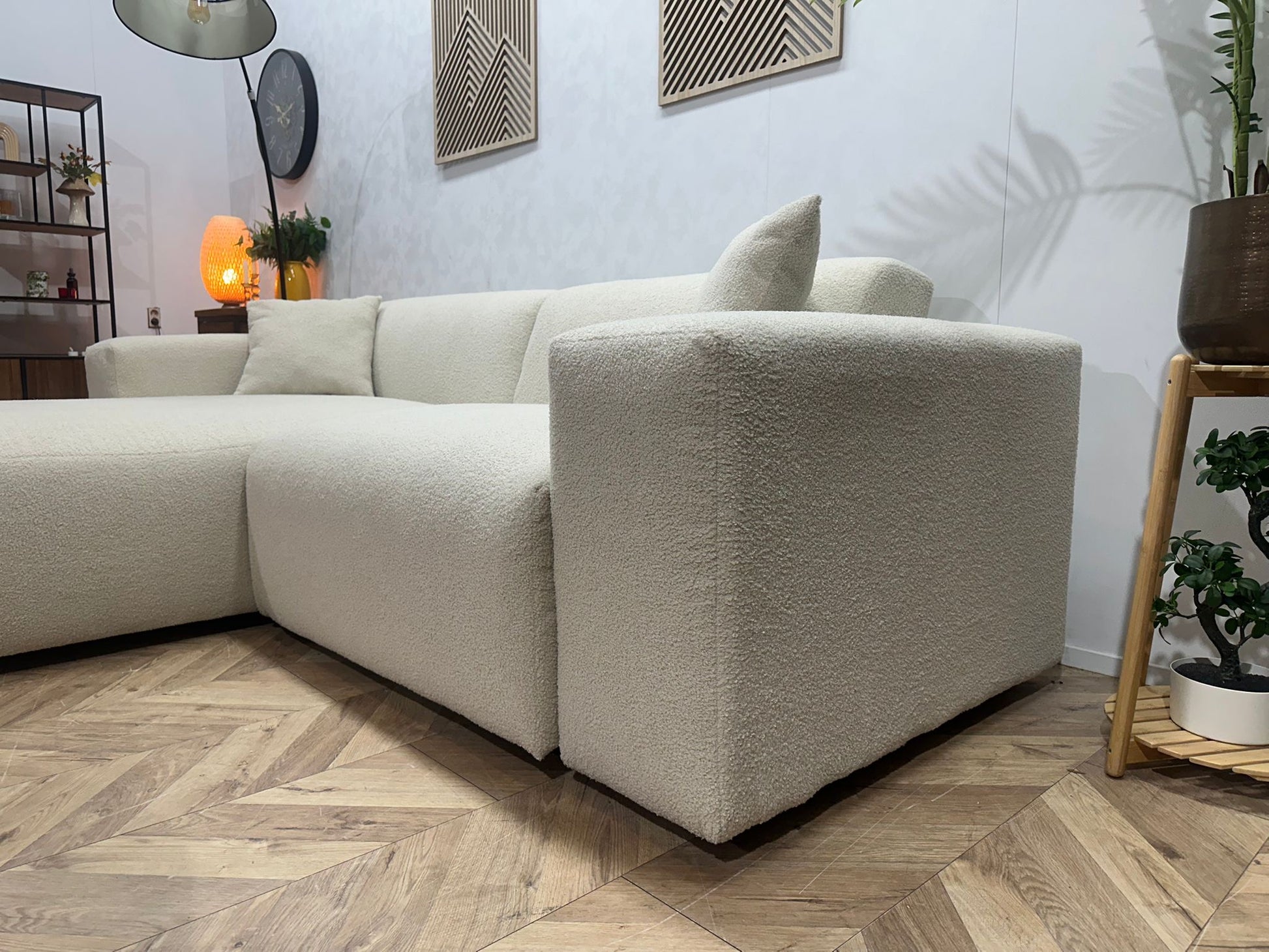 De combinatie van strakke lijnen, zachte vormen en de luxe bouclé stof maakt deze hoekbank geschikt voor diverse woonstijlen — van modern en Scandinavisch tot minimalistisch en hotel-chic.