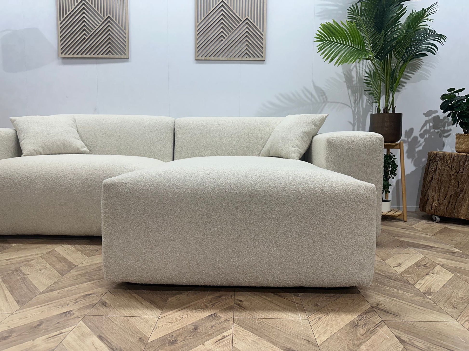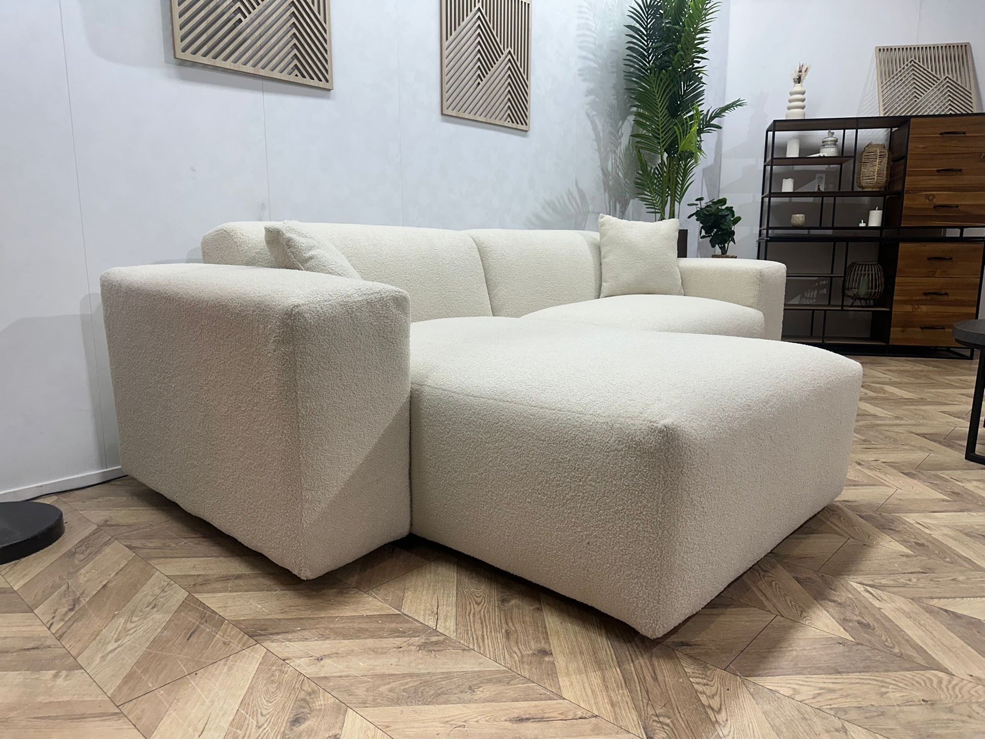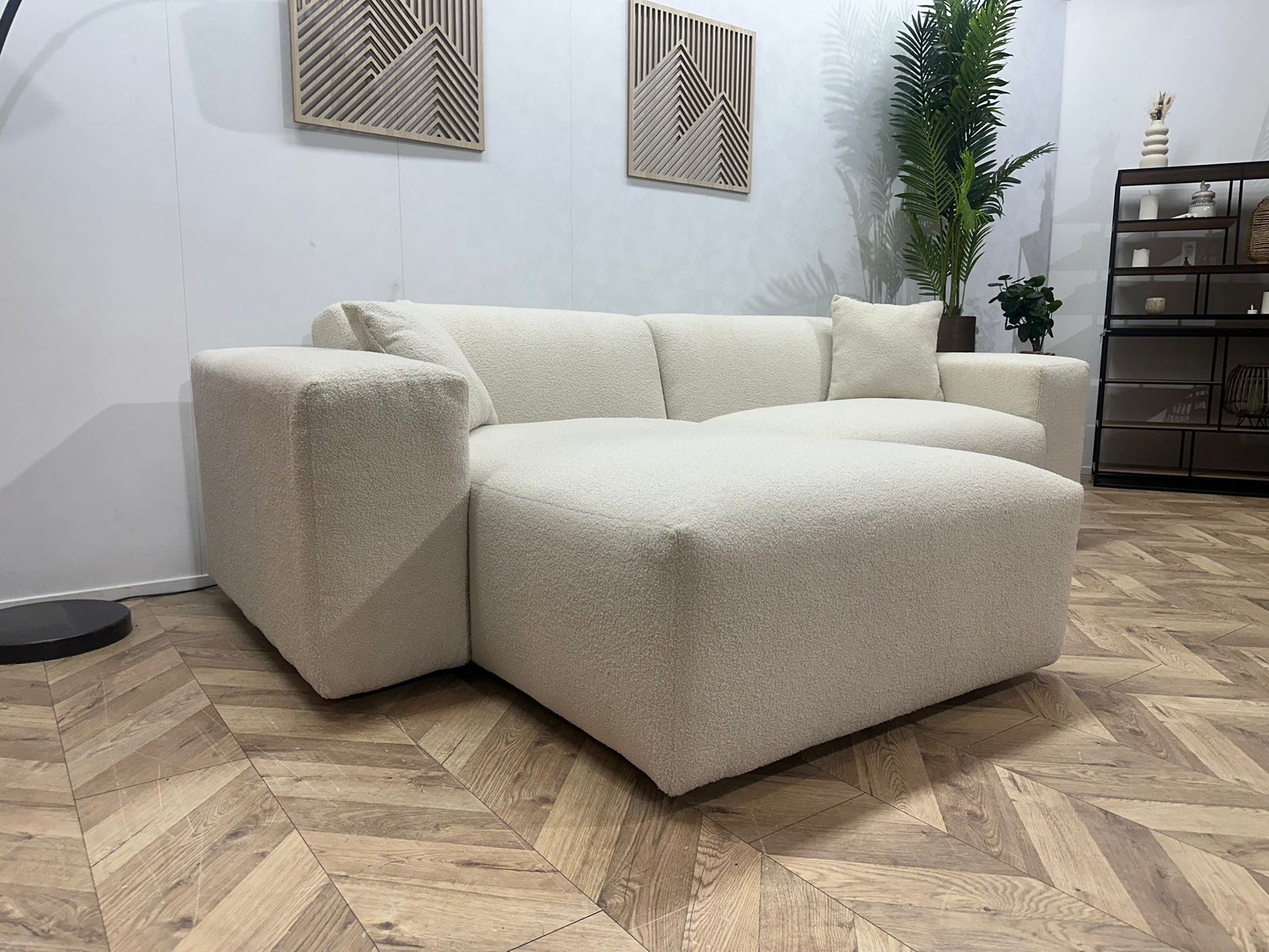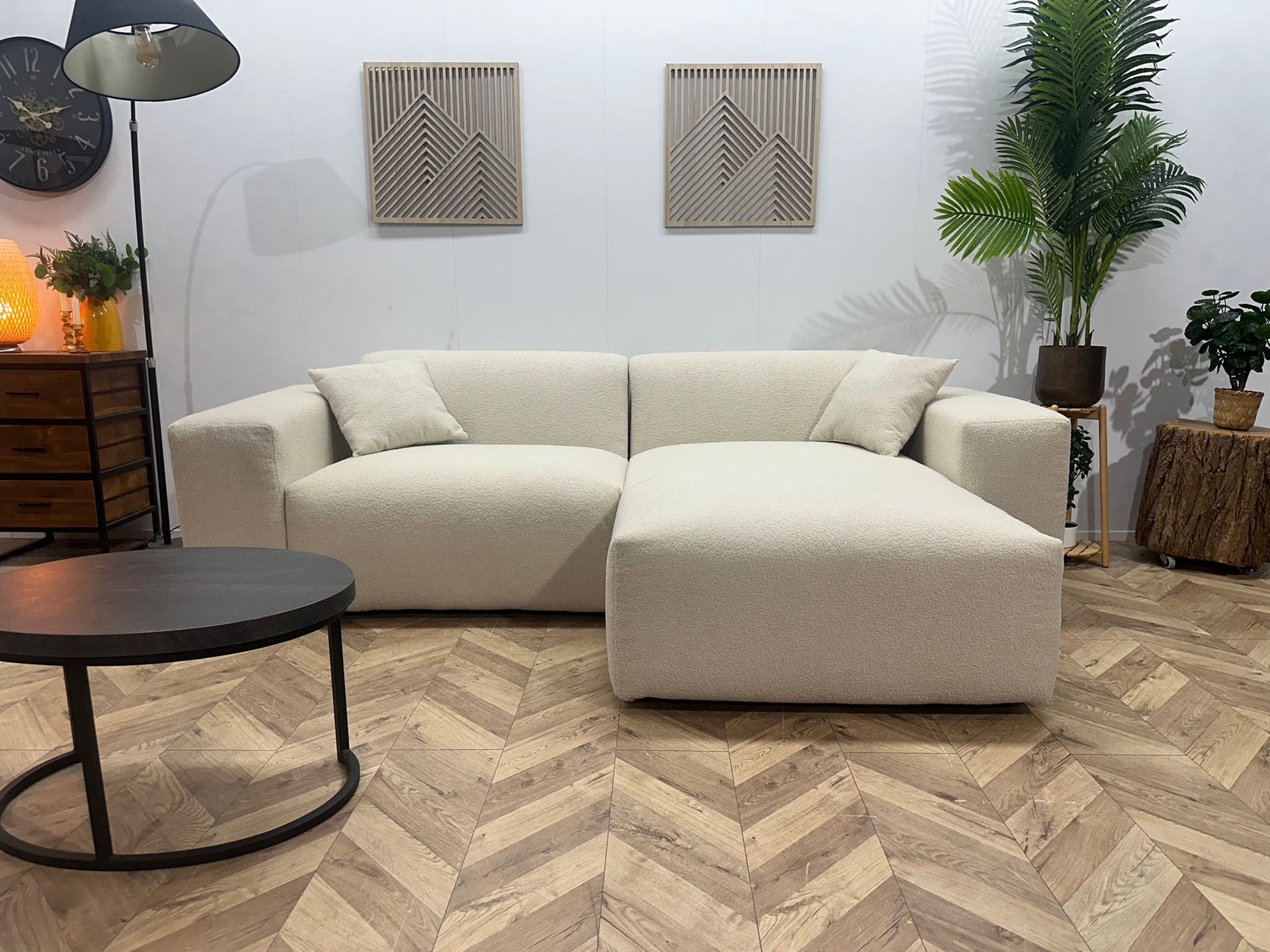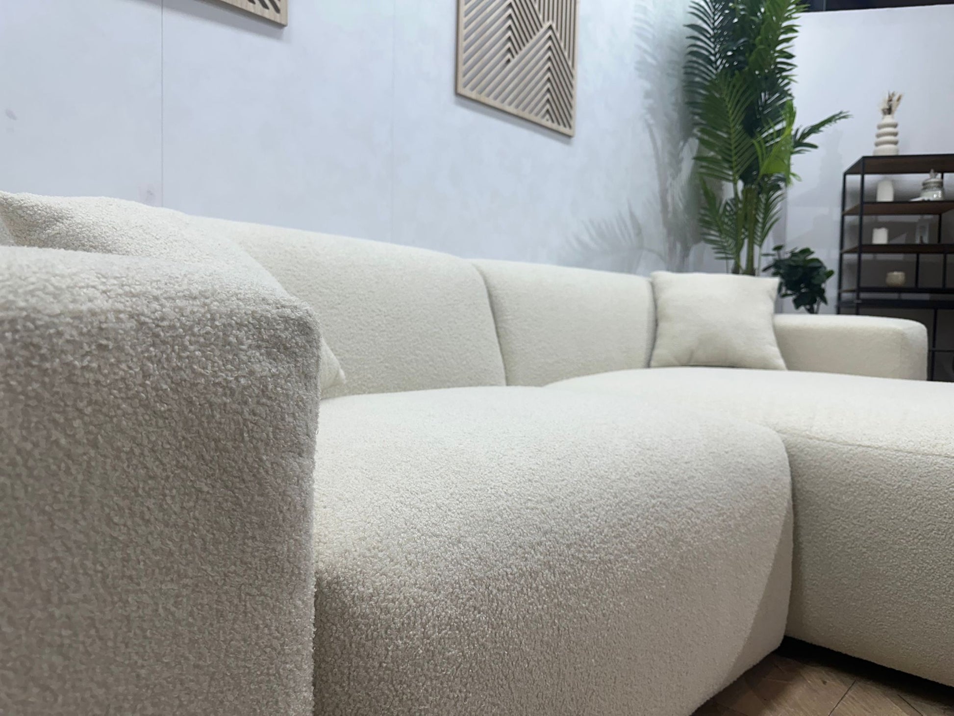 De combinatie van strakke lijnen, zachte vormen en de luxe bouclé stof maakt deze hoekbank geschikt voor diverse woonstijlen — van modern en Scandinavisch tot minimalistisch en hotel-chic.