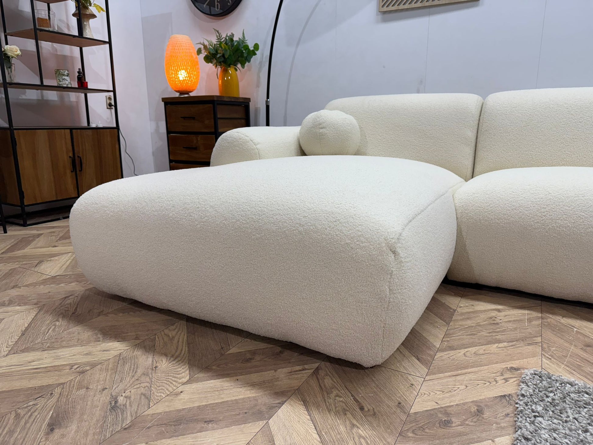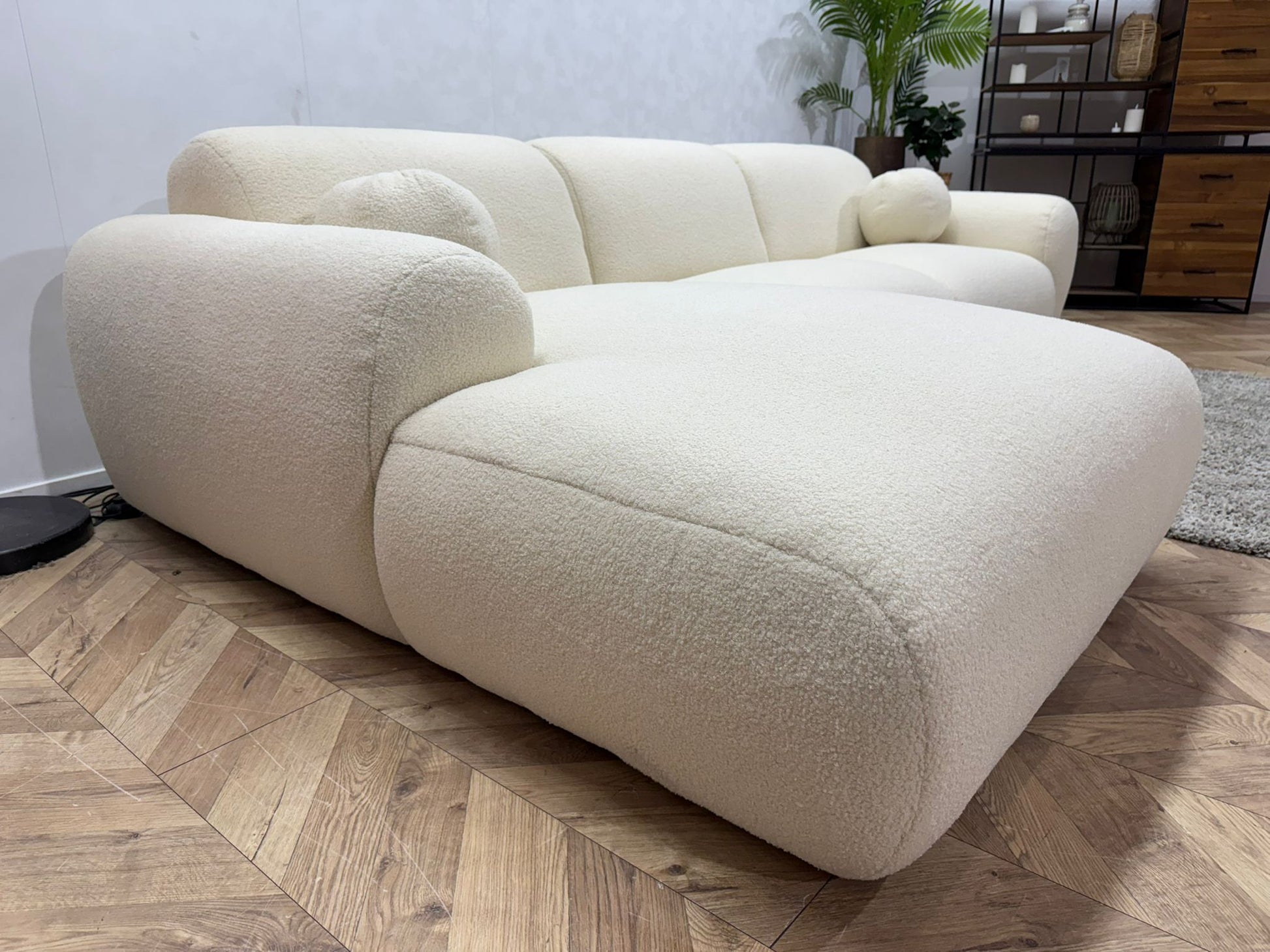 Dankzij het tijdloze ontwerp en de luxe bouclé stof past deze hoekbank moeiteloos in diverse woonstijlen, zoals modern, Scandinavisch en minimalistisch.