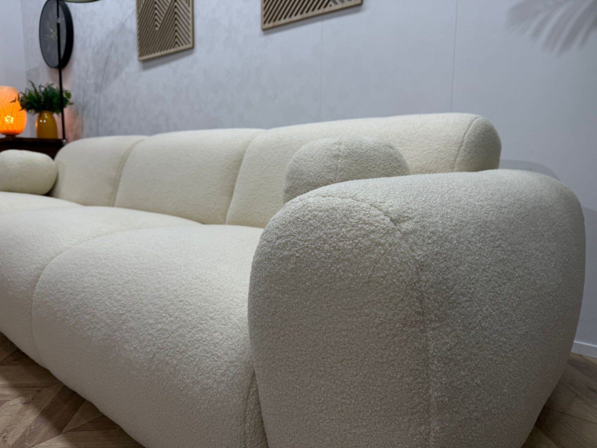 De hoogwaardige bouclé stof voelt heerlijk zacht aan en zorgt direct voor een luxe en eigentijdse uitstraling. Deze stof is niet alleen comfortabel, maar ook sterk en geschikt voor dagelijks gebruik — ideaal voor een levendig huishouden.
