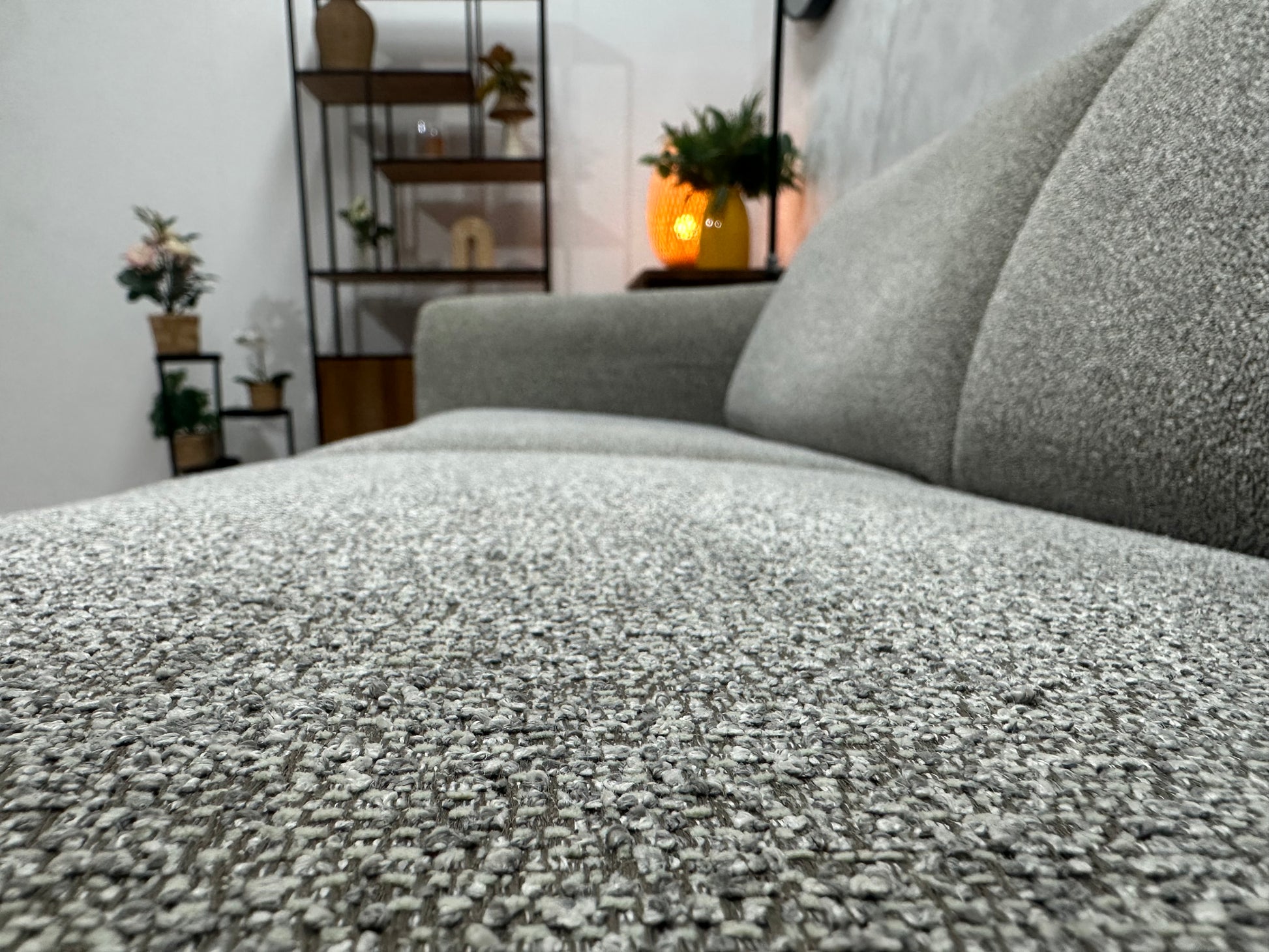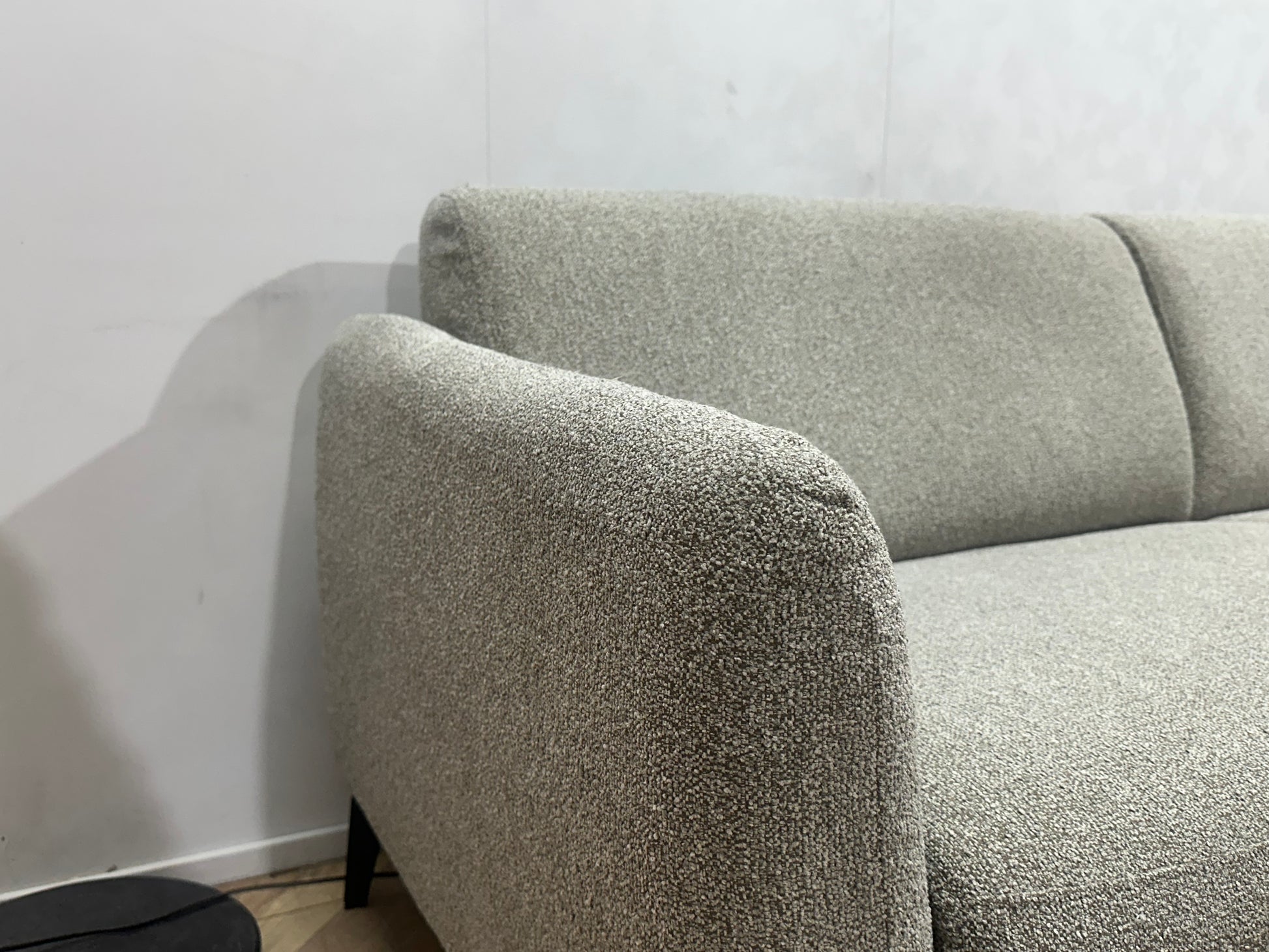 Licht Grijze Bouclé Stoffen Hoekbank ~ Vaste Kussens