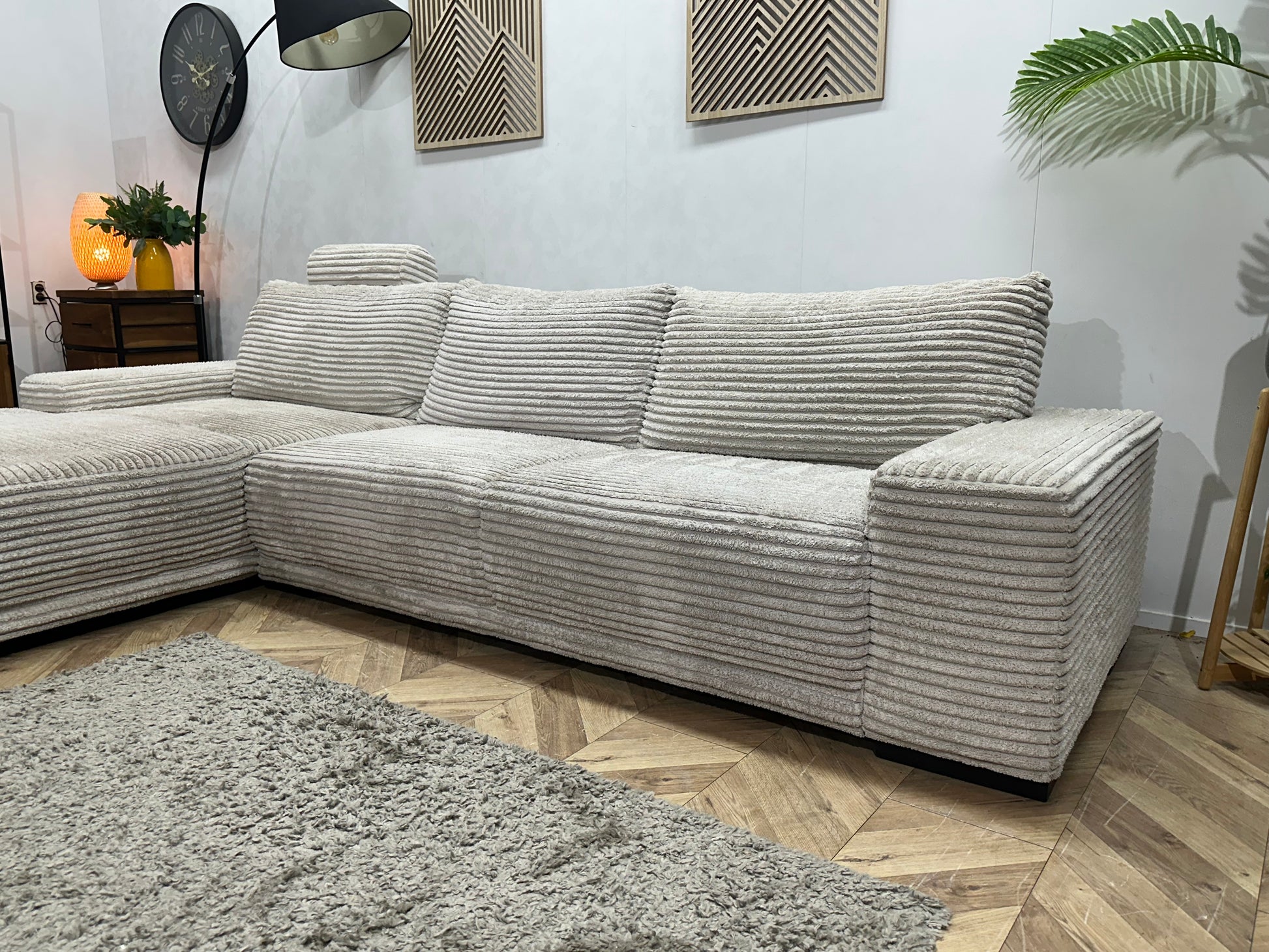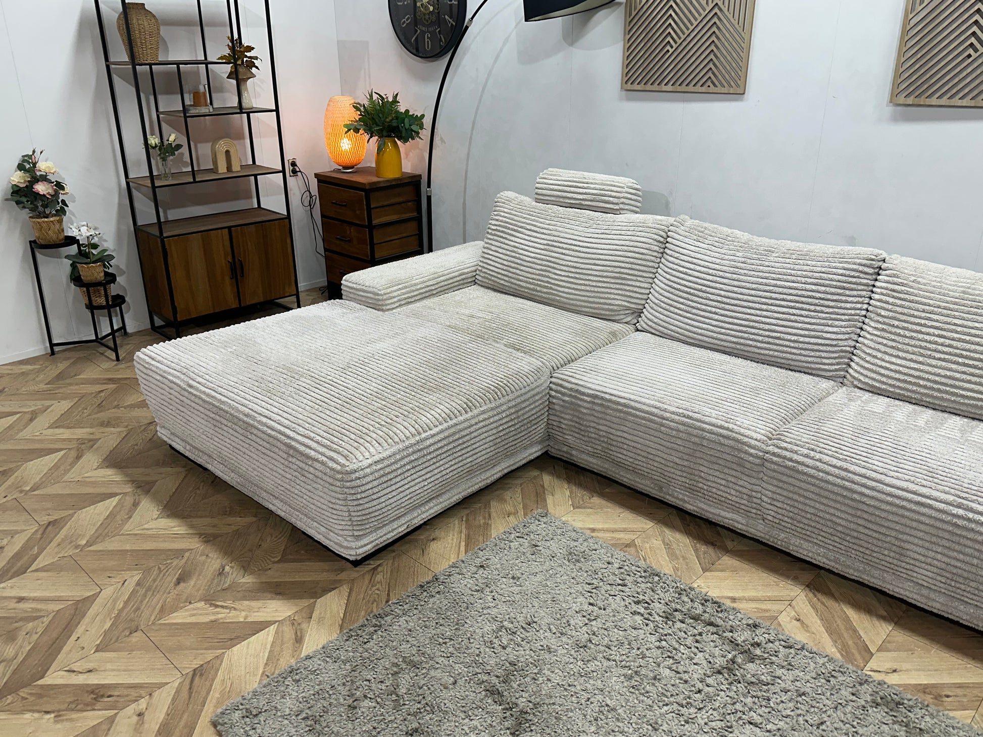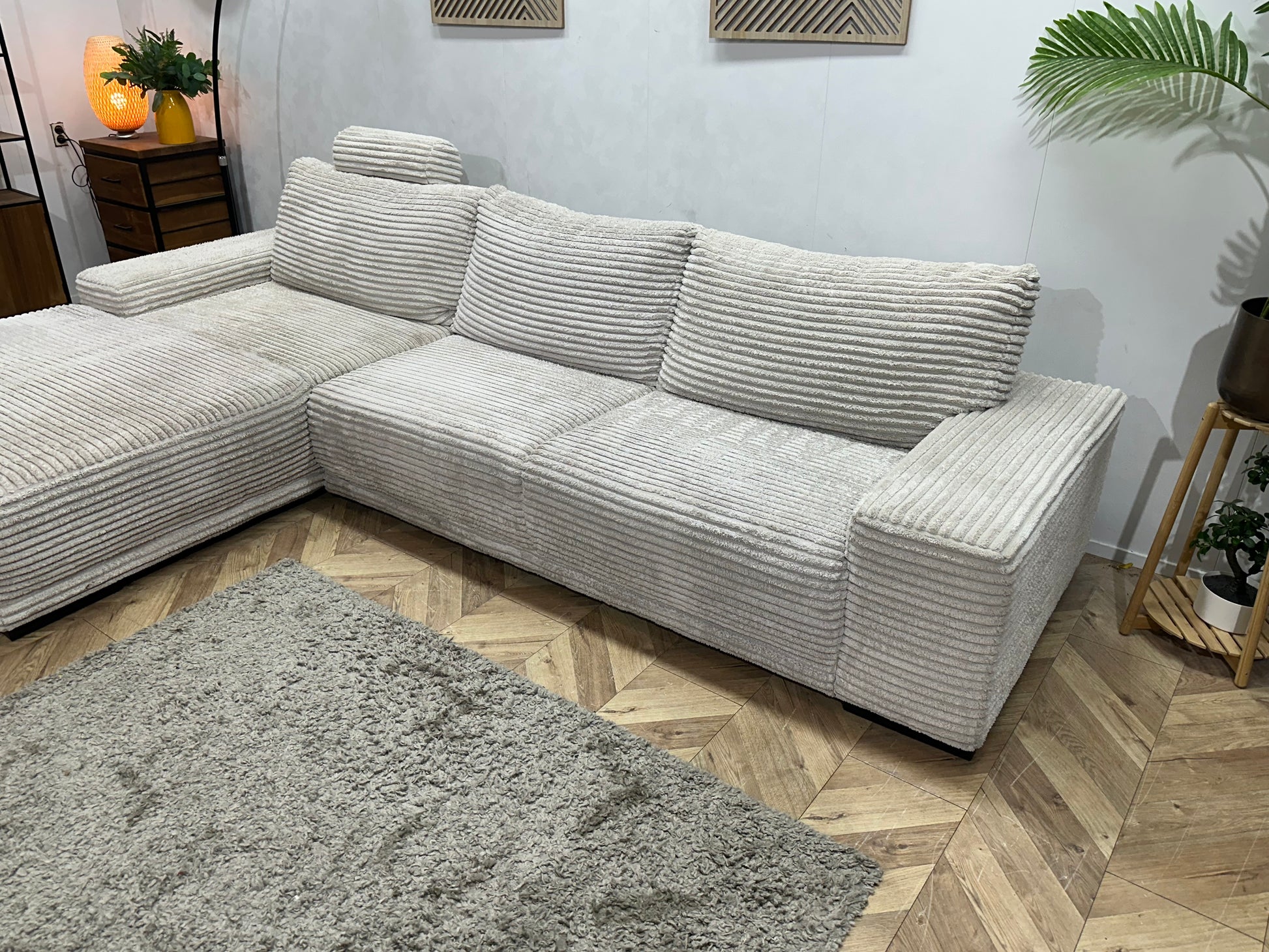 Witte Ribstof Hoekbank ~ Vaste Kussens