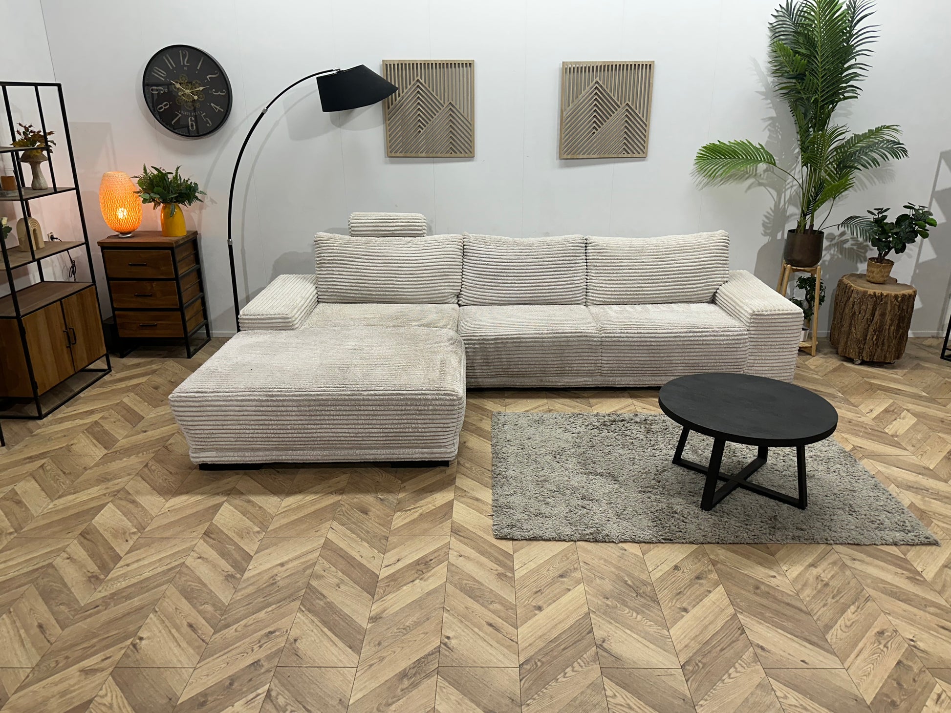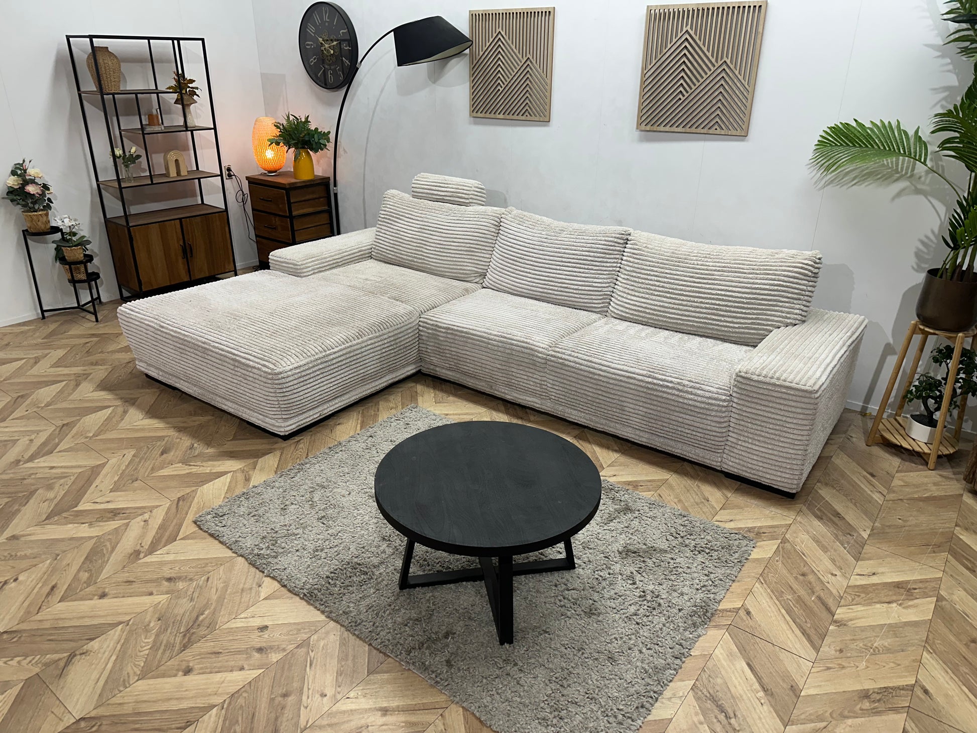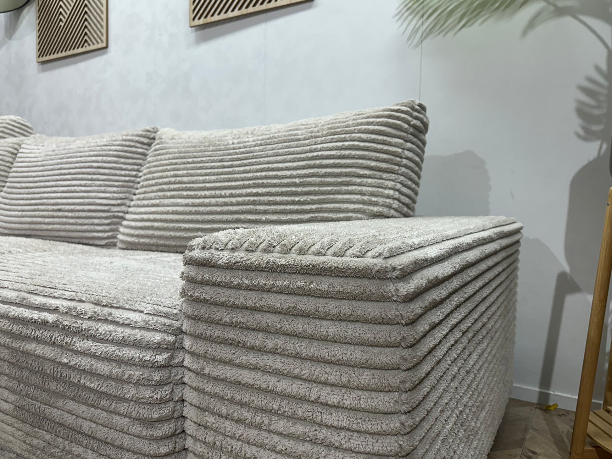 Witte Ribstof Hoekbank ~ Vaste Kussens