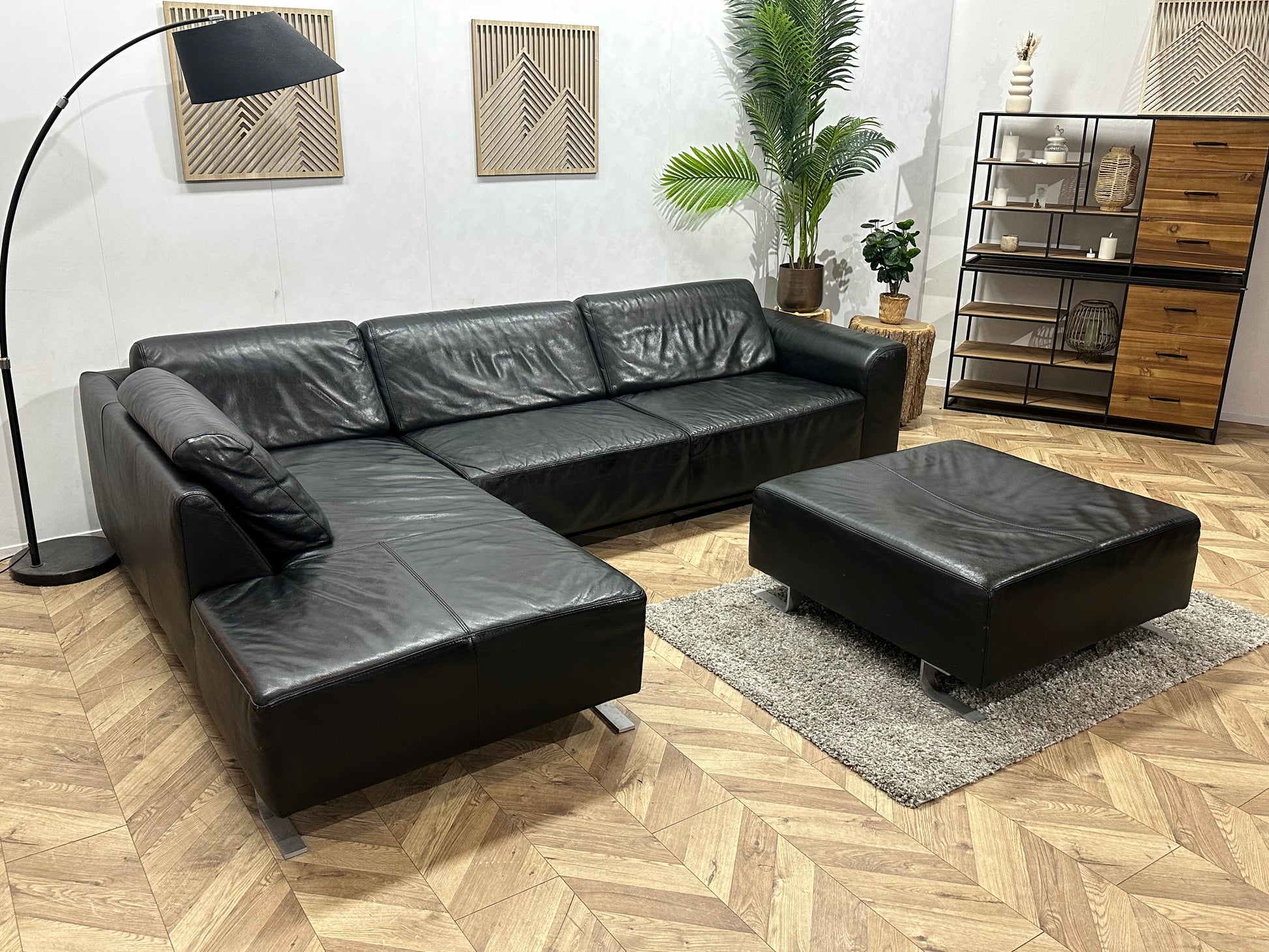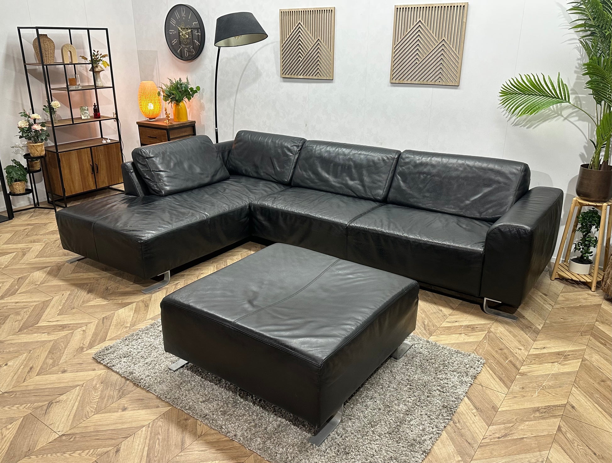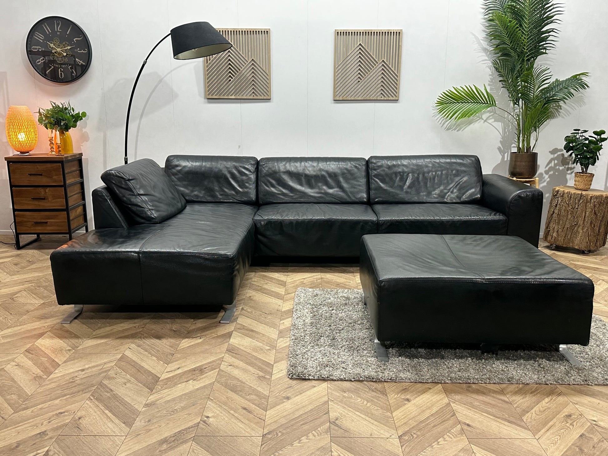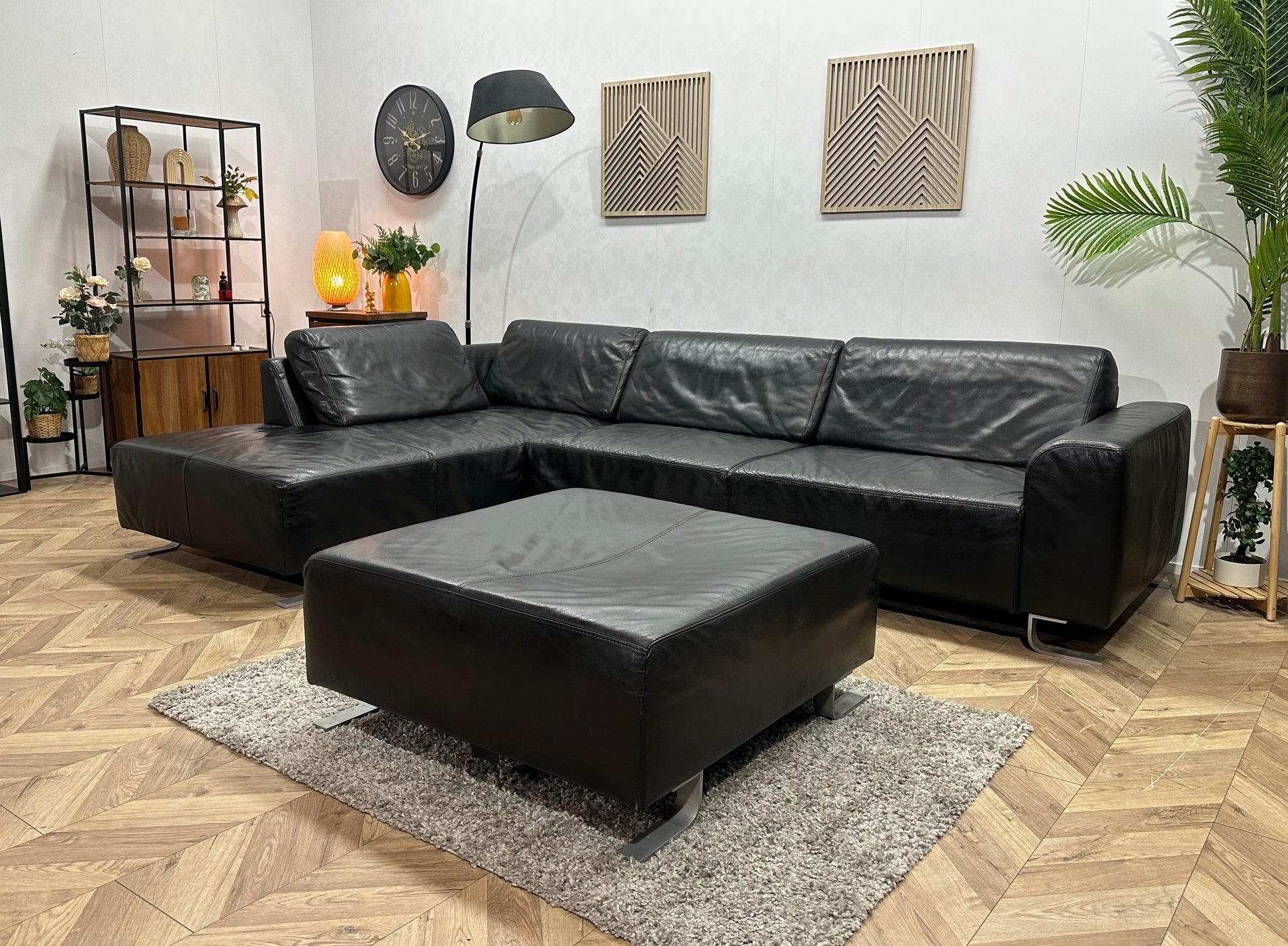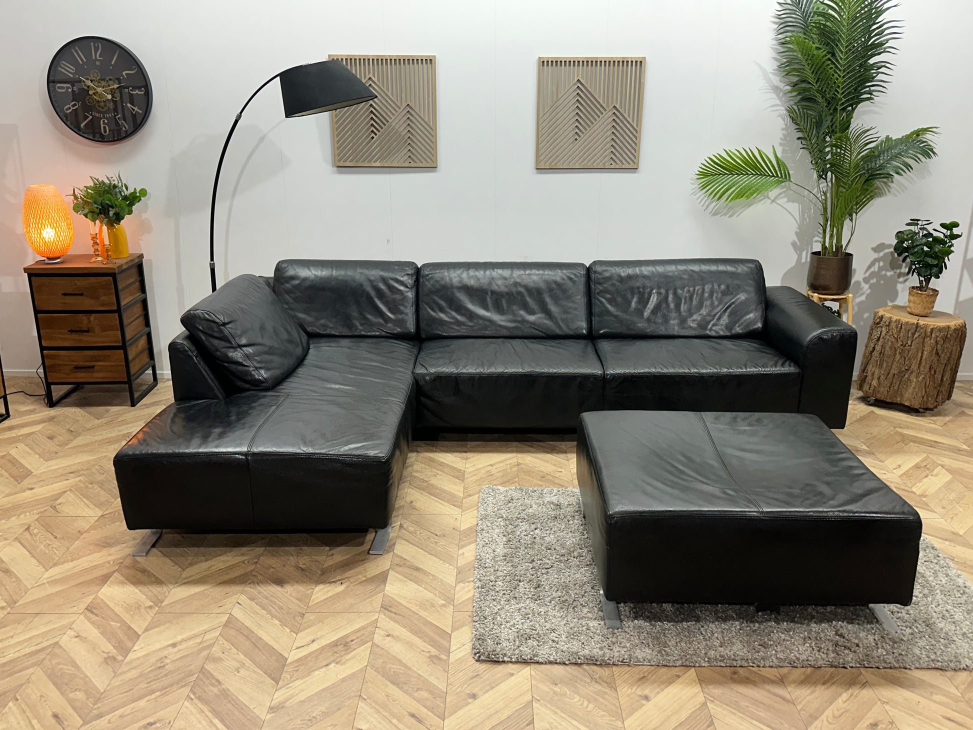Zwarte Echt Lederen Hoekbank Inc Hocker ~ Vaste Kussens