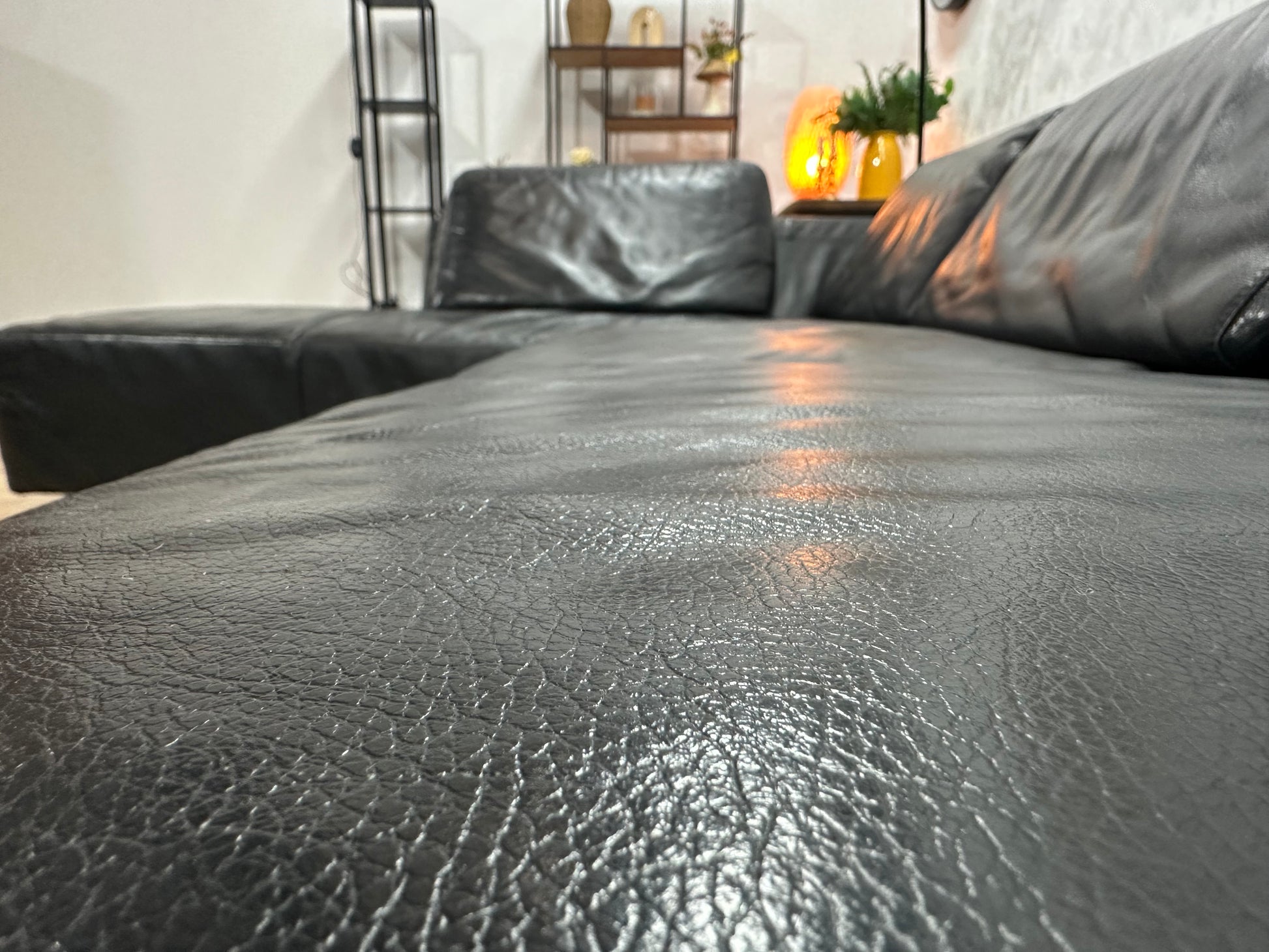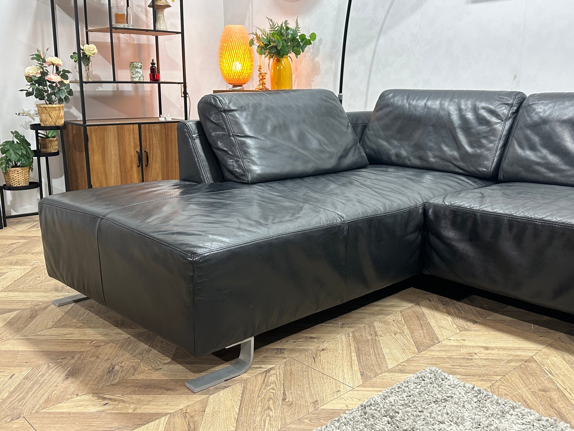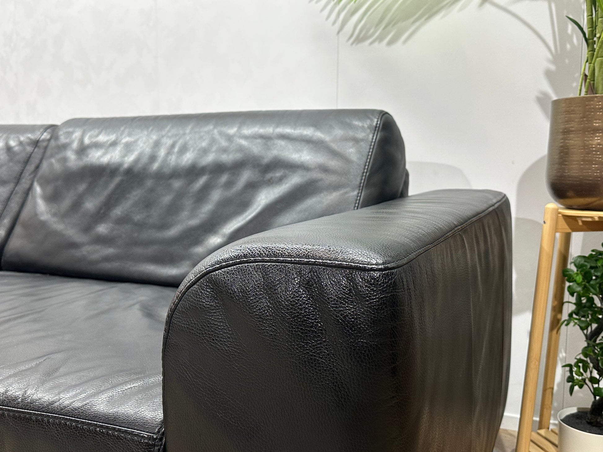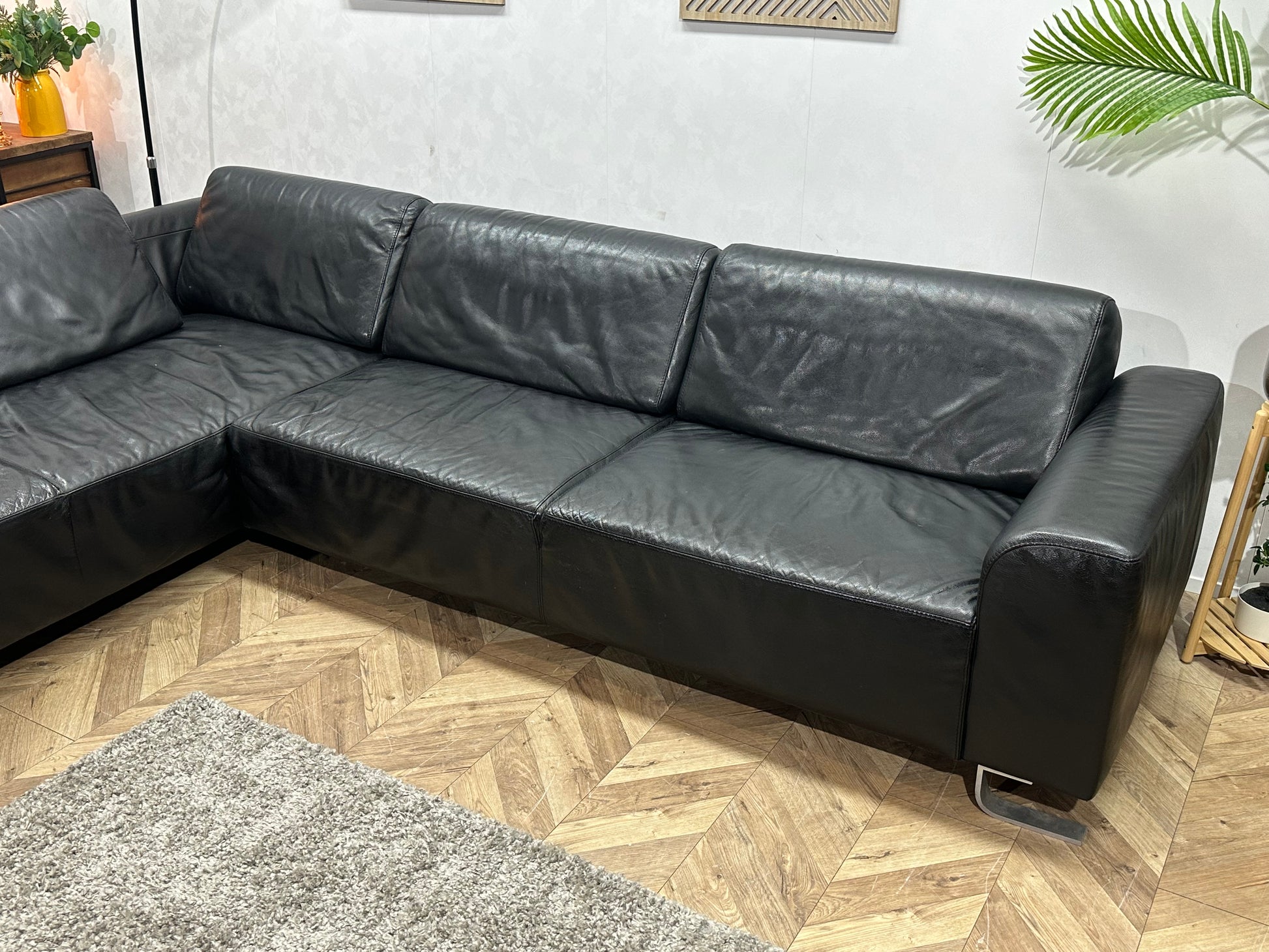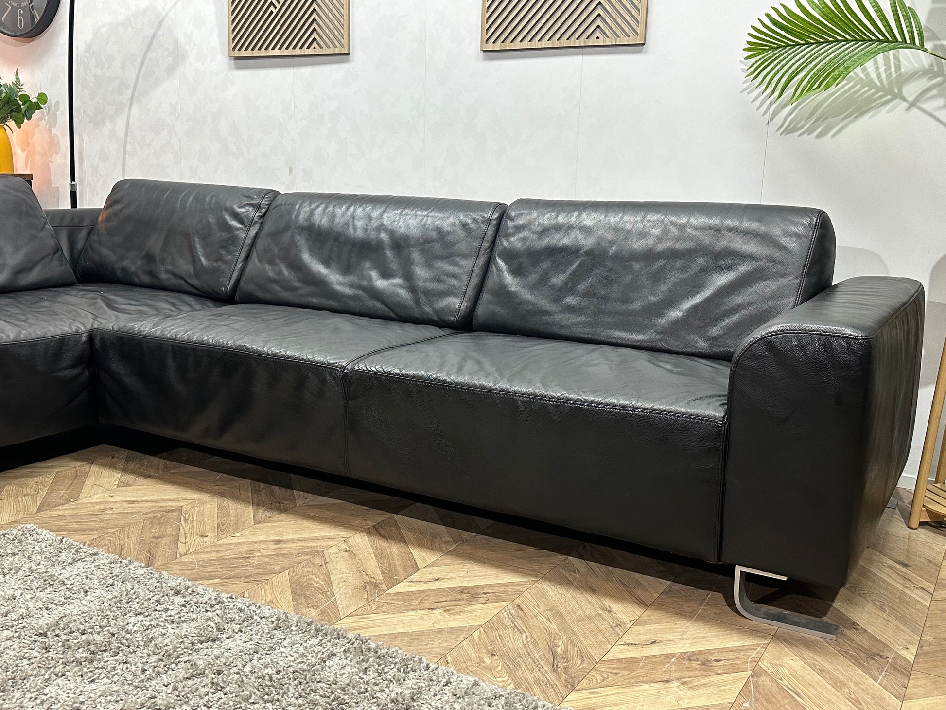 Zwarte Echt Lederen Hoekbank Inc Hocker ~ Vaste Kussens