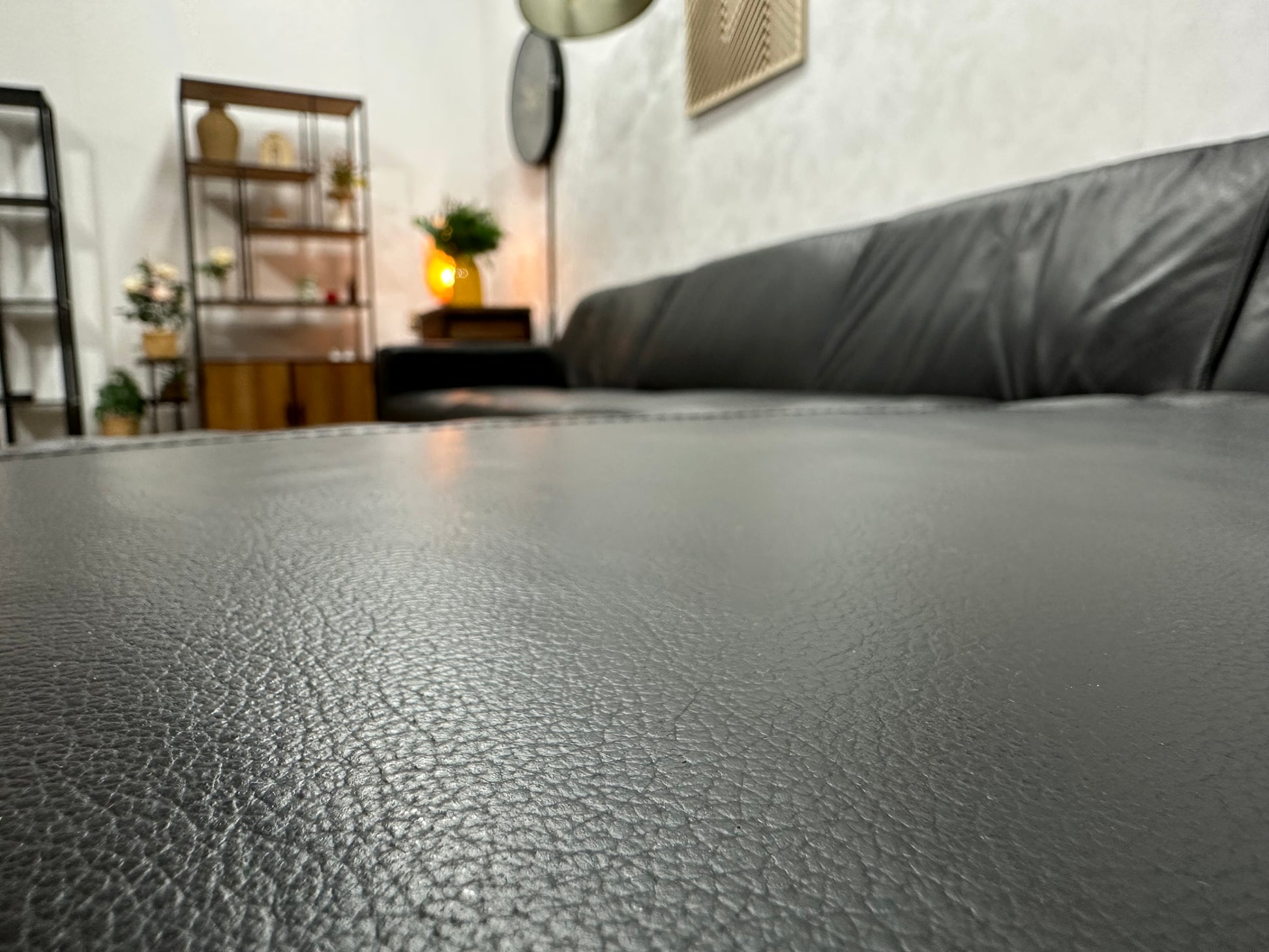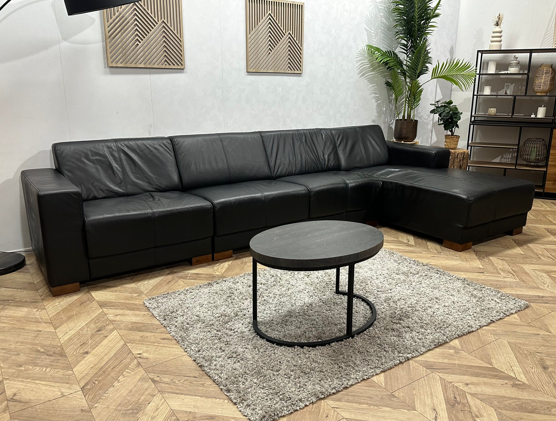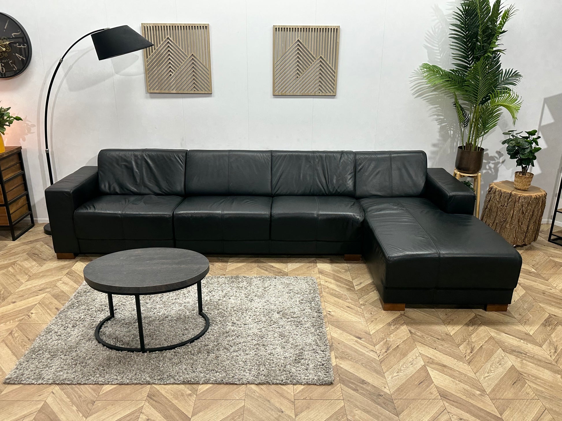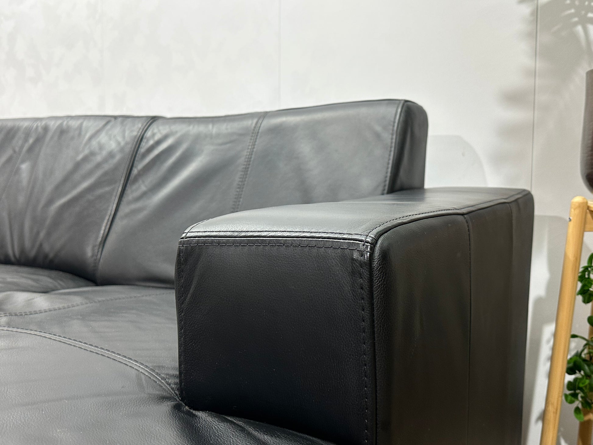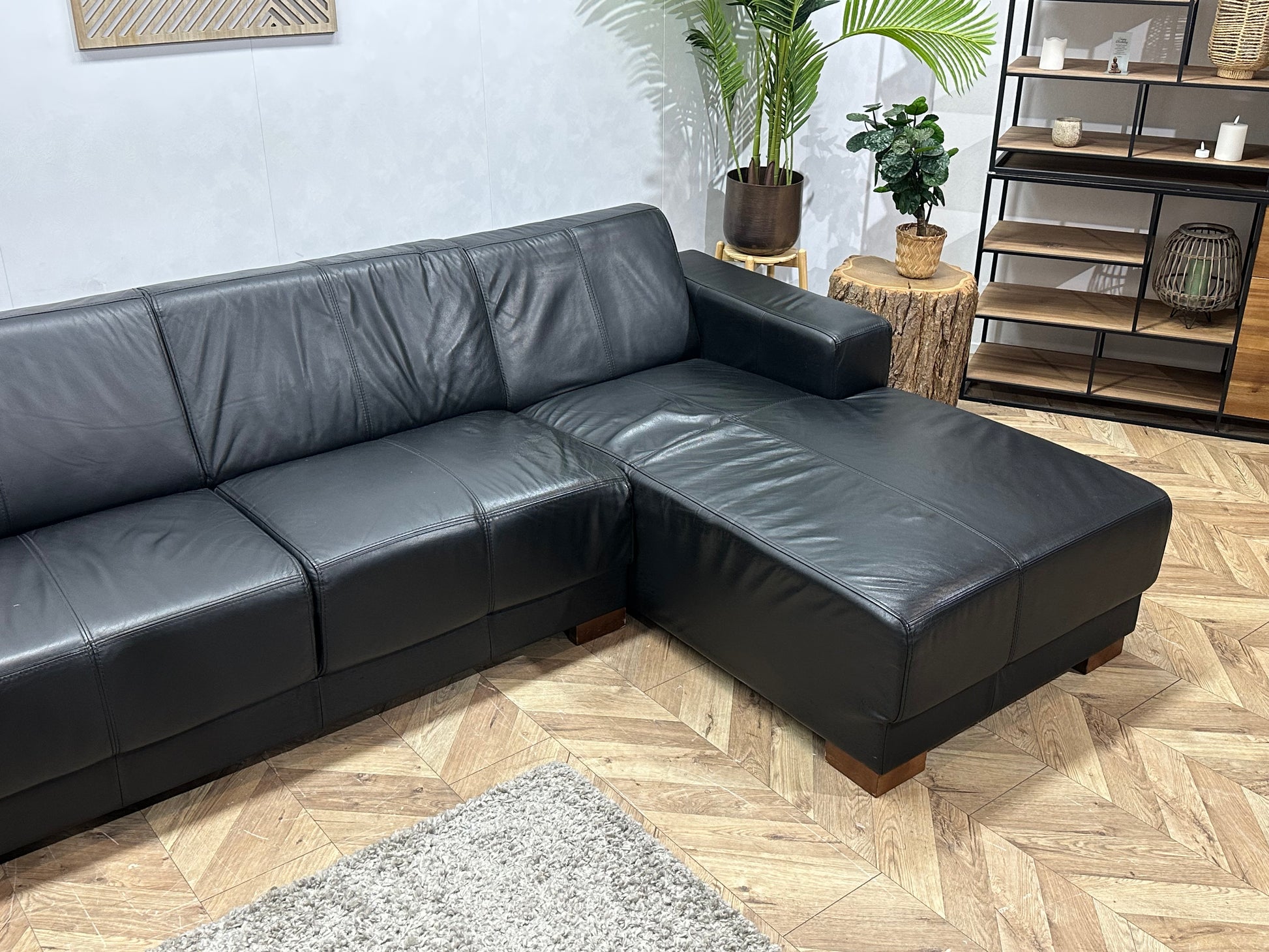 Zwarte Echt Lederen Hoekbank ~ Vaste Kussens