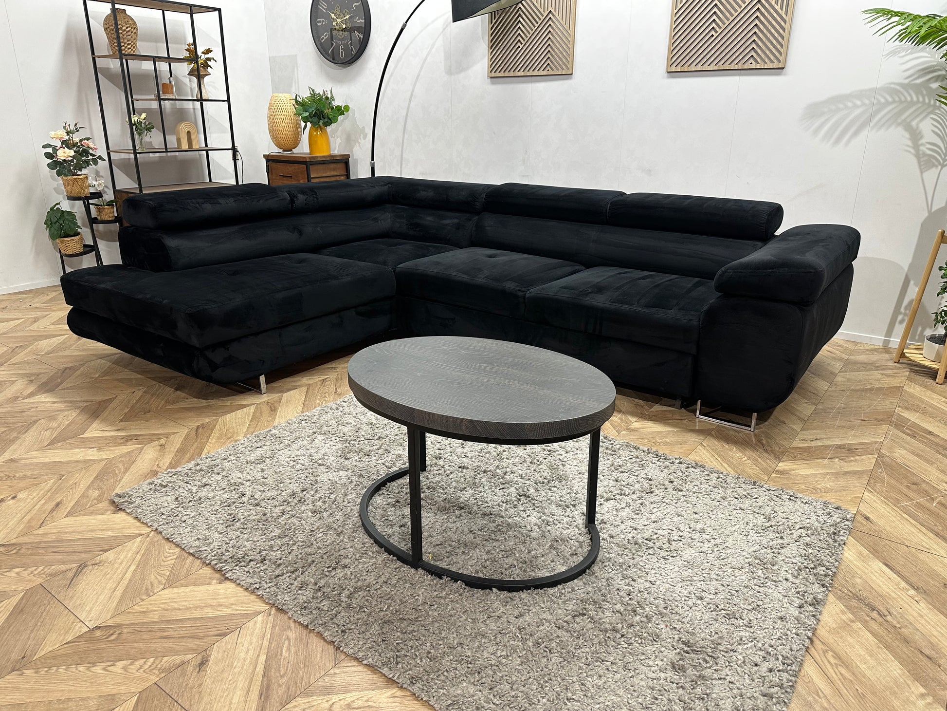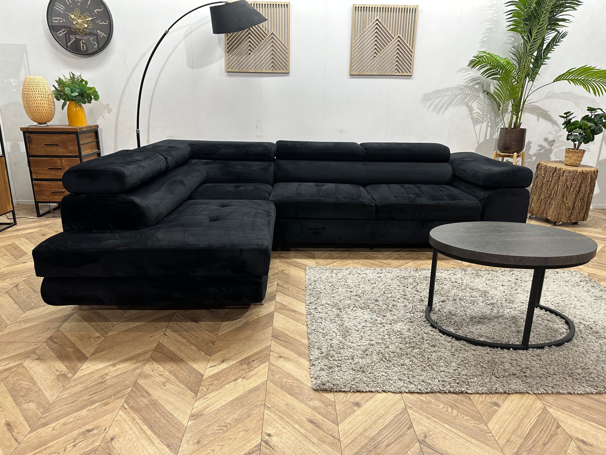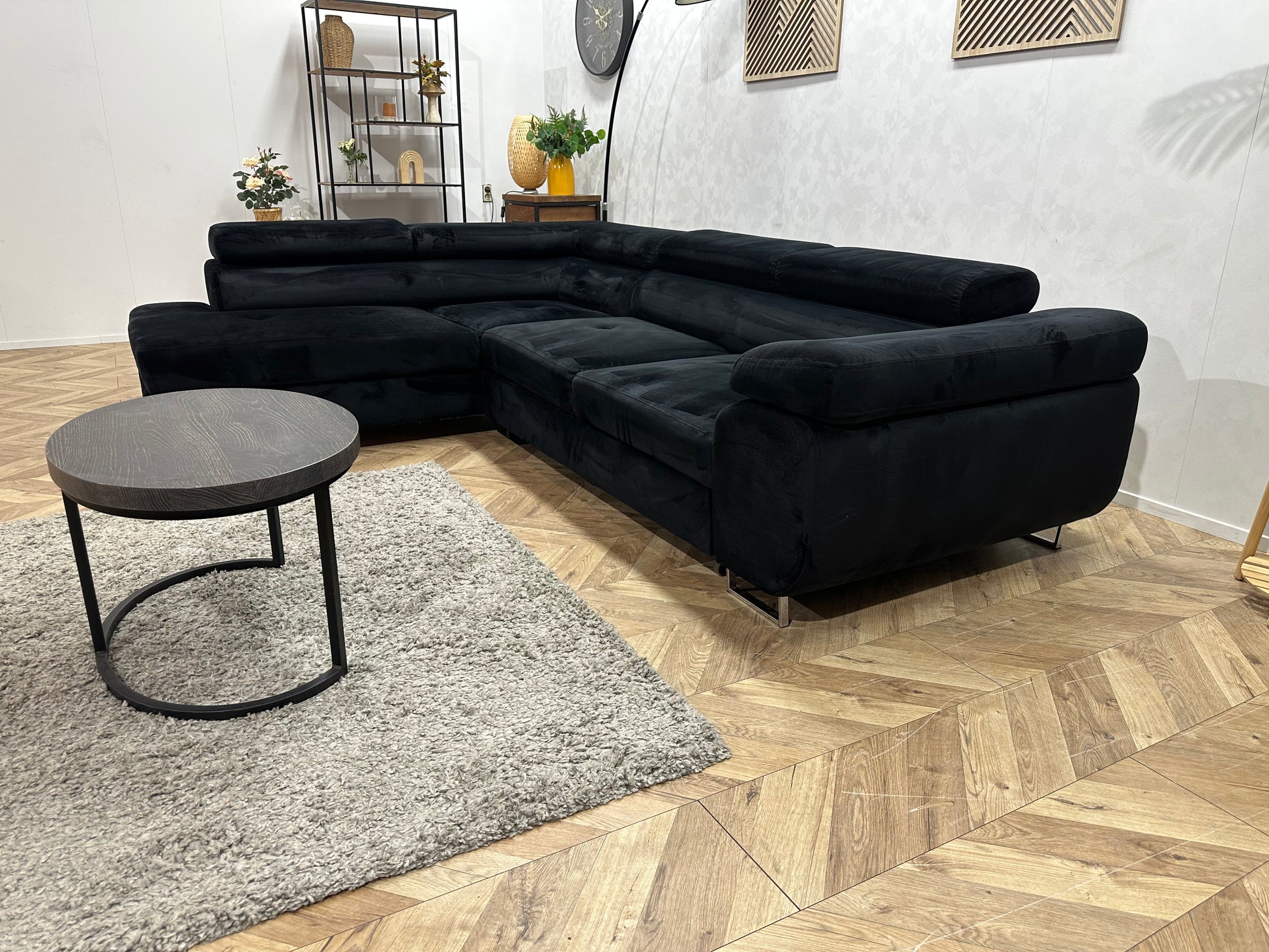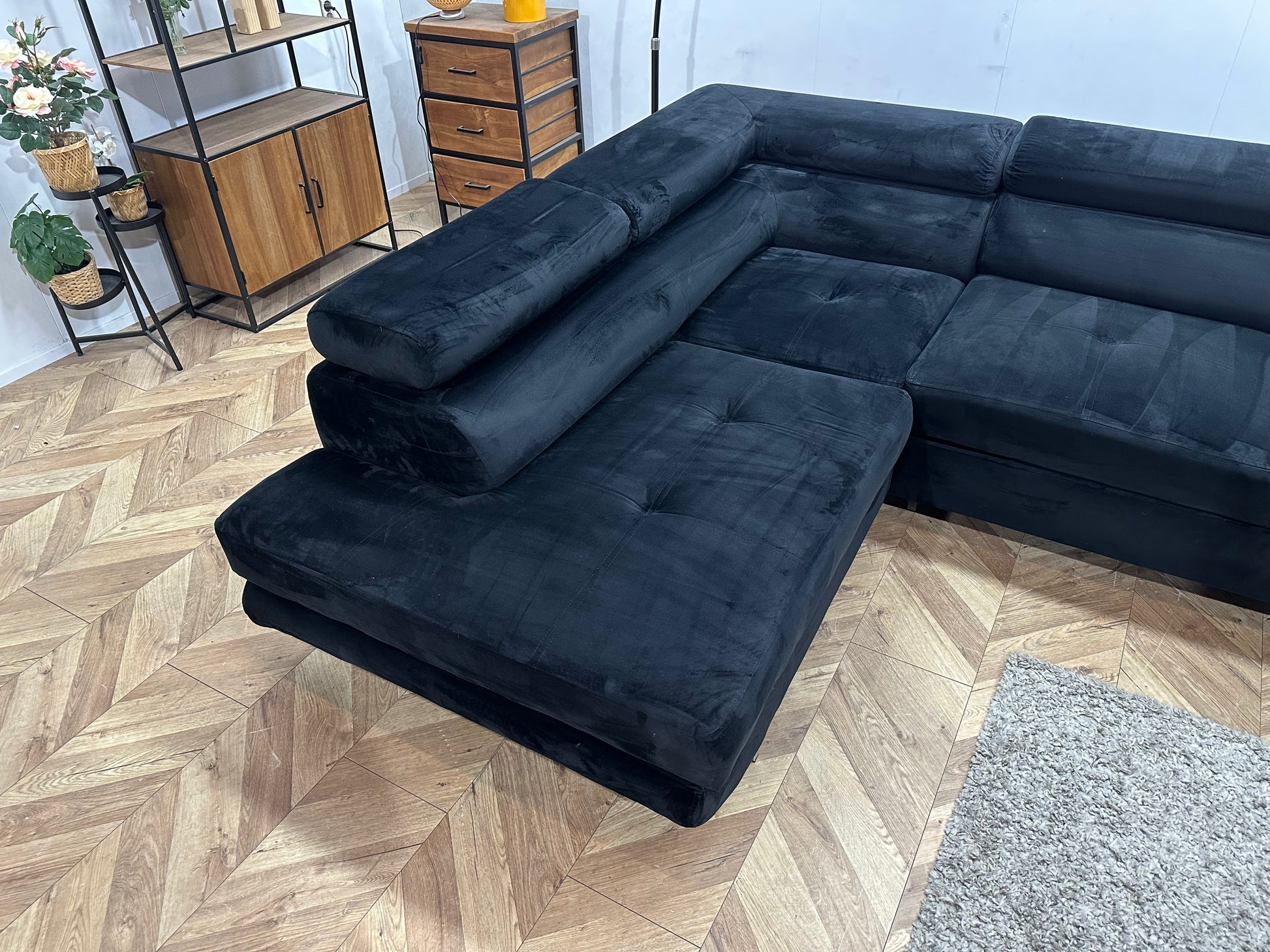 Zwarte Velvet Hoekbank ~ Slaapfunctie ~ Verstelbare Hoofdsteunen